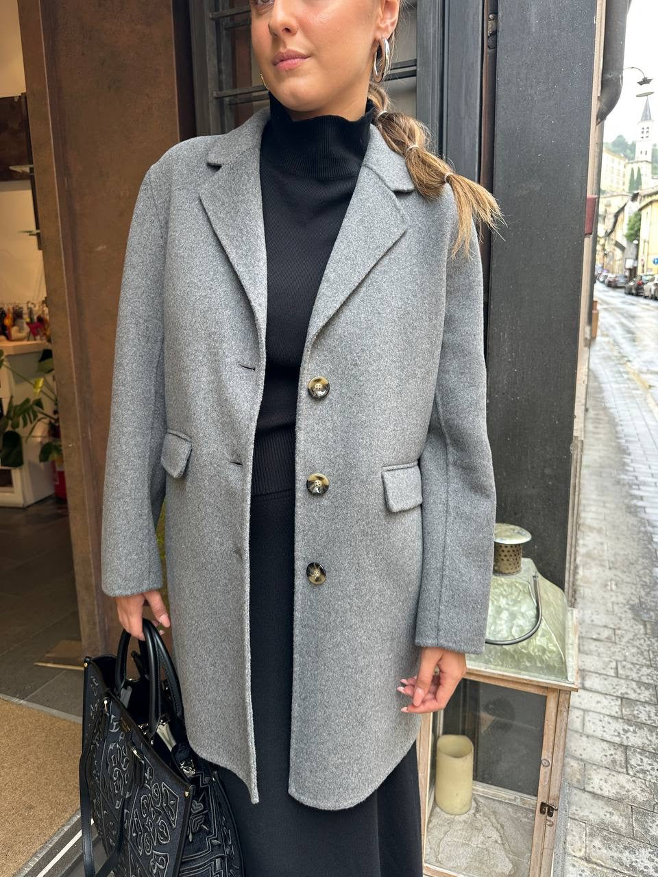 Cappotto monopetto con rever classico chiusura a 3 bottoni, lunghezza sopra al ginocchio.
