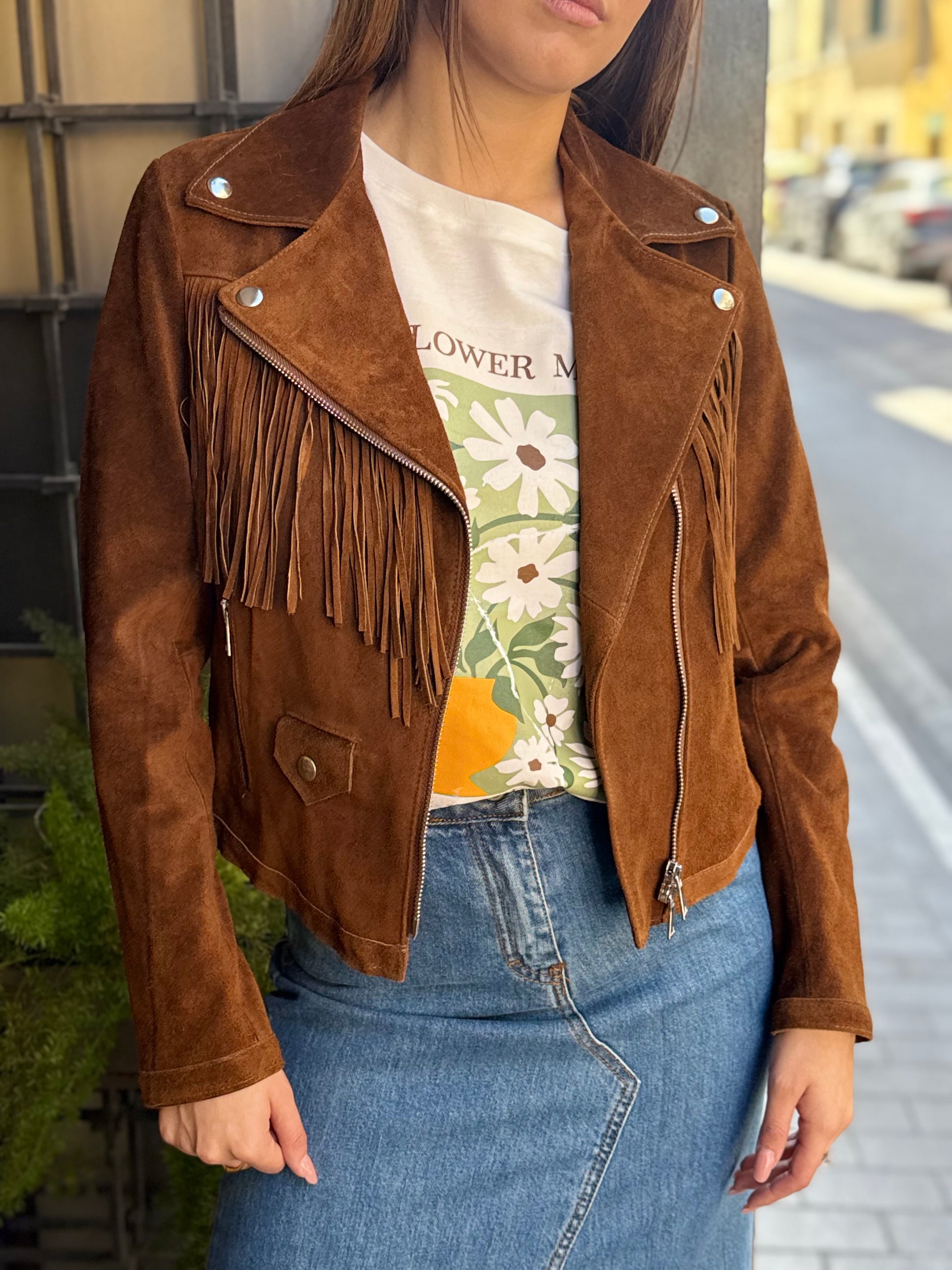 Chiodo in VERA PELLE con frange COGNAC