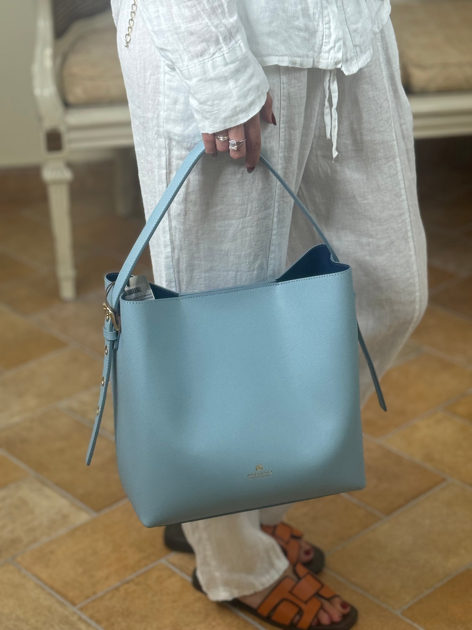 Secchiello in pelle a piramide con interno in variante colore dotata di una pochette interna, manico regolabile.