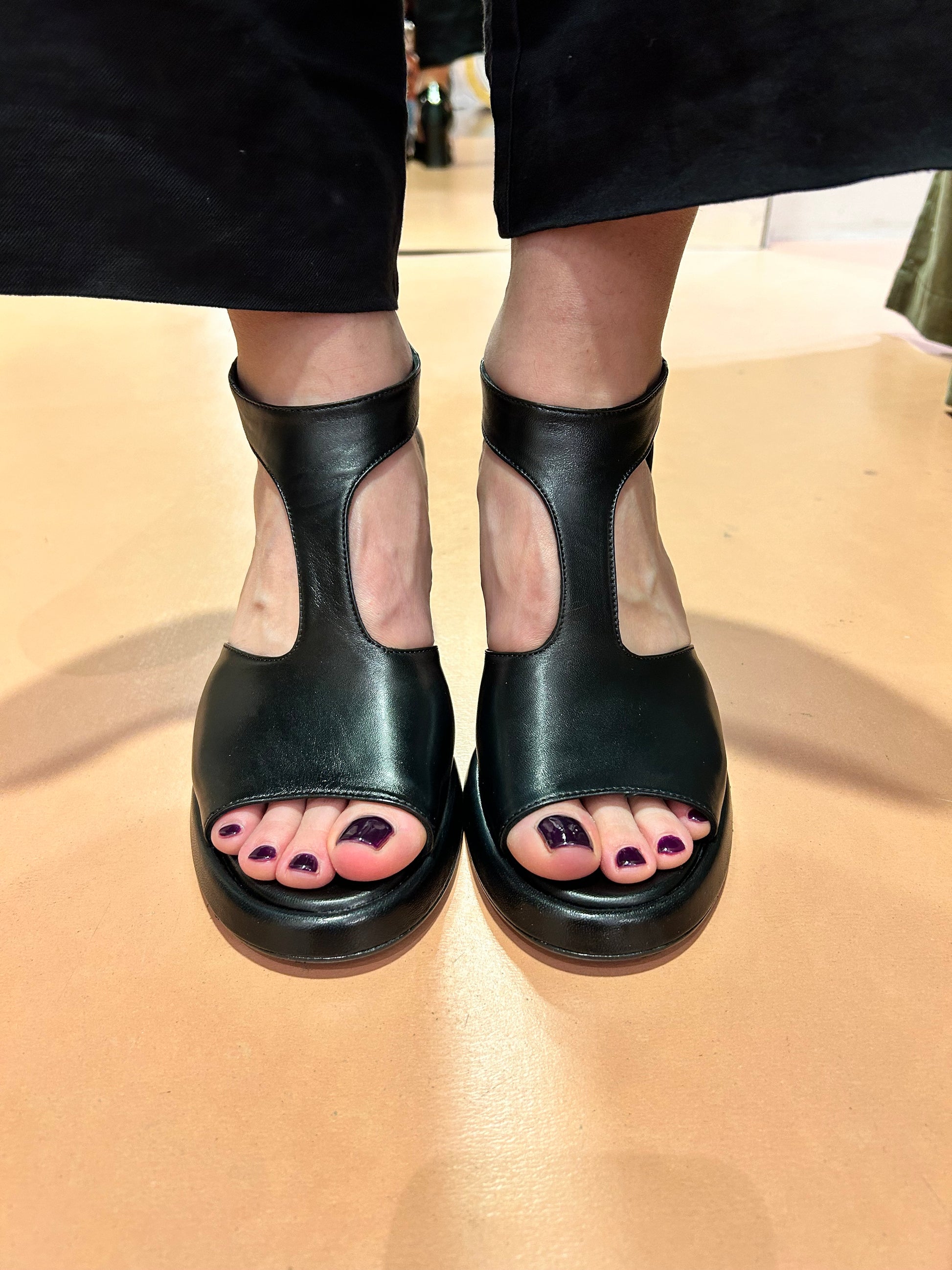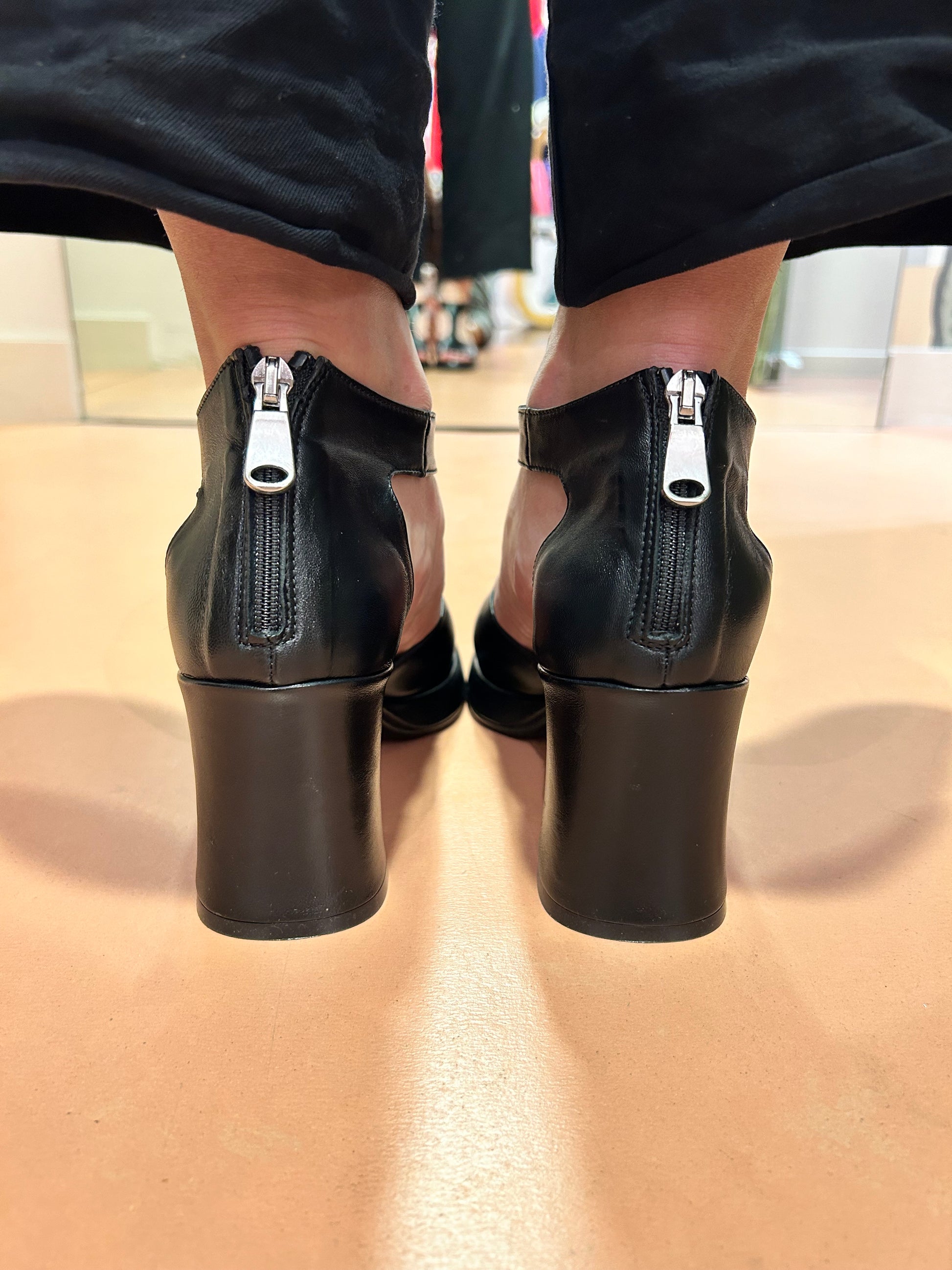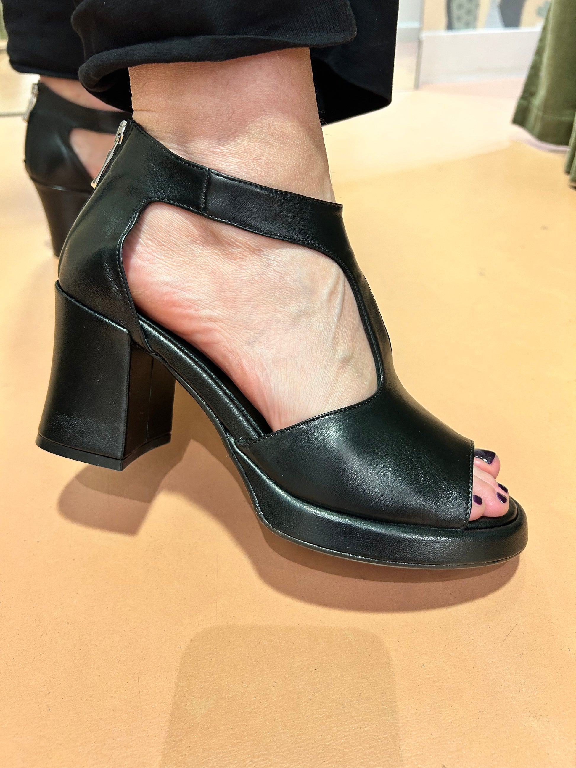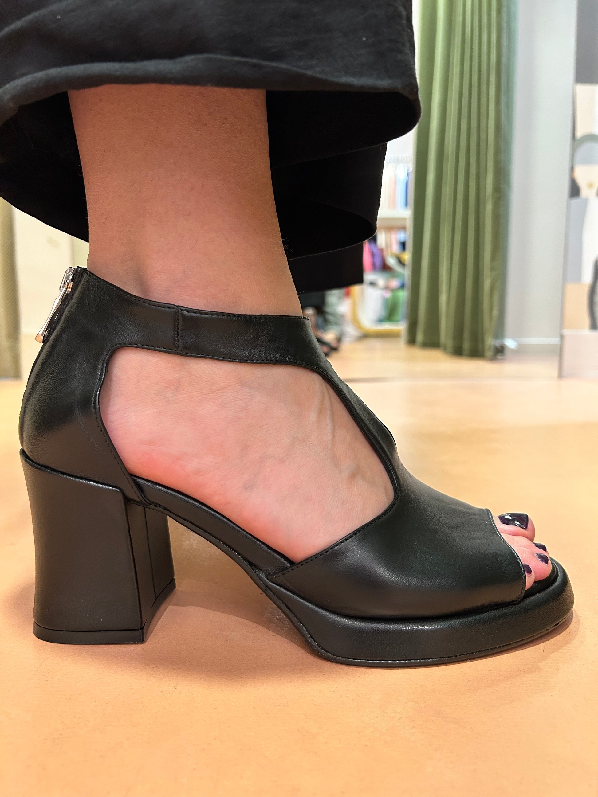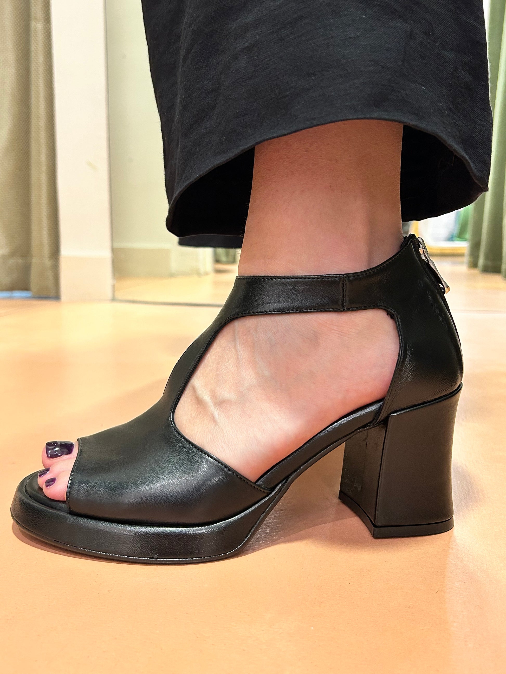 Sandalo in pelle con tallone chiuso e zip sul retro, interno in pelle, tacco largo 70mm, plateau 20mm, fondo in cuoio.