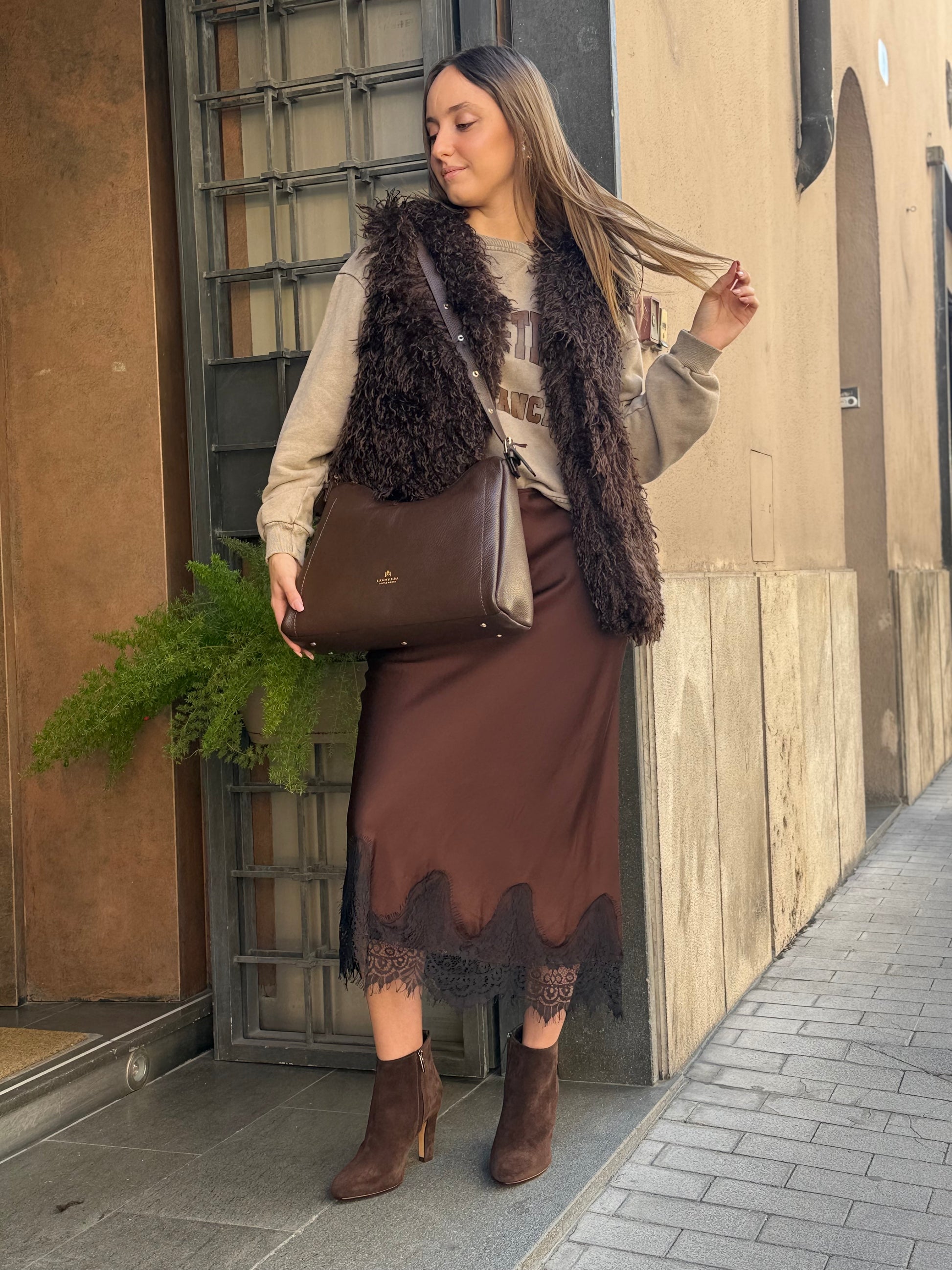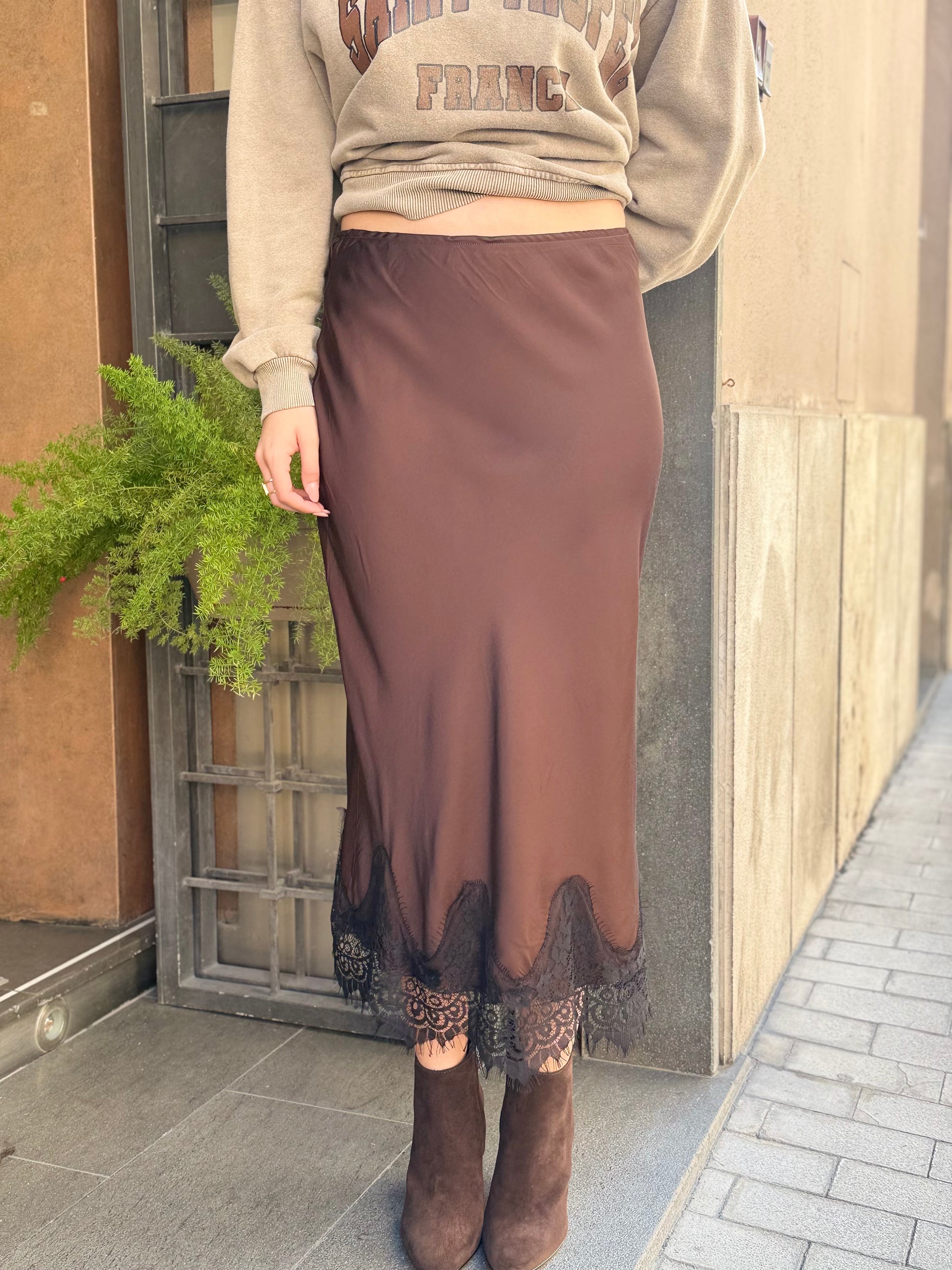 Gonna lingerie lunga variante moro con pizzo nero nel fondo, elasticizzata in vita.