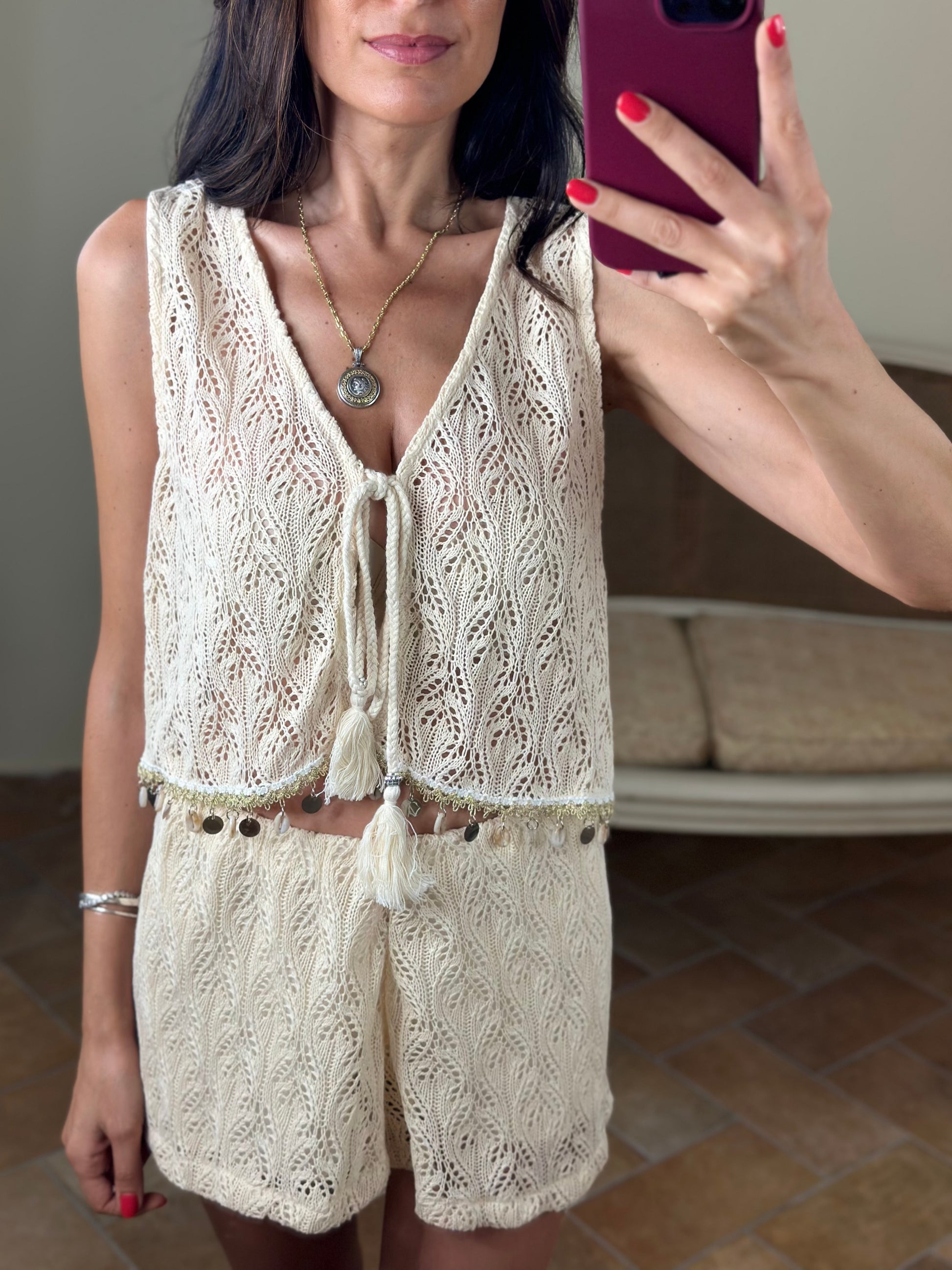 gilet in pizzo con dettaglio conchiglie nel fondo.