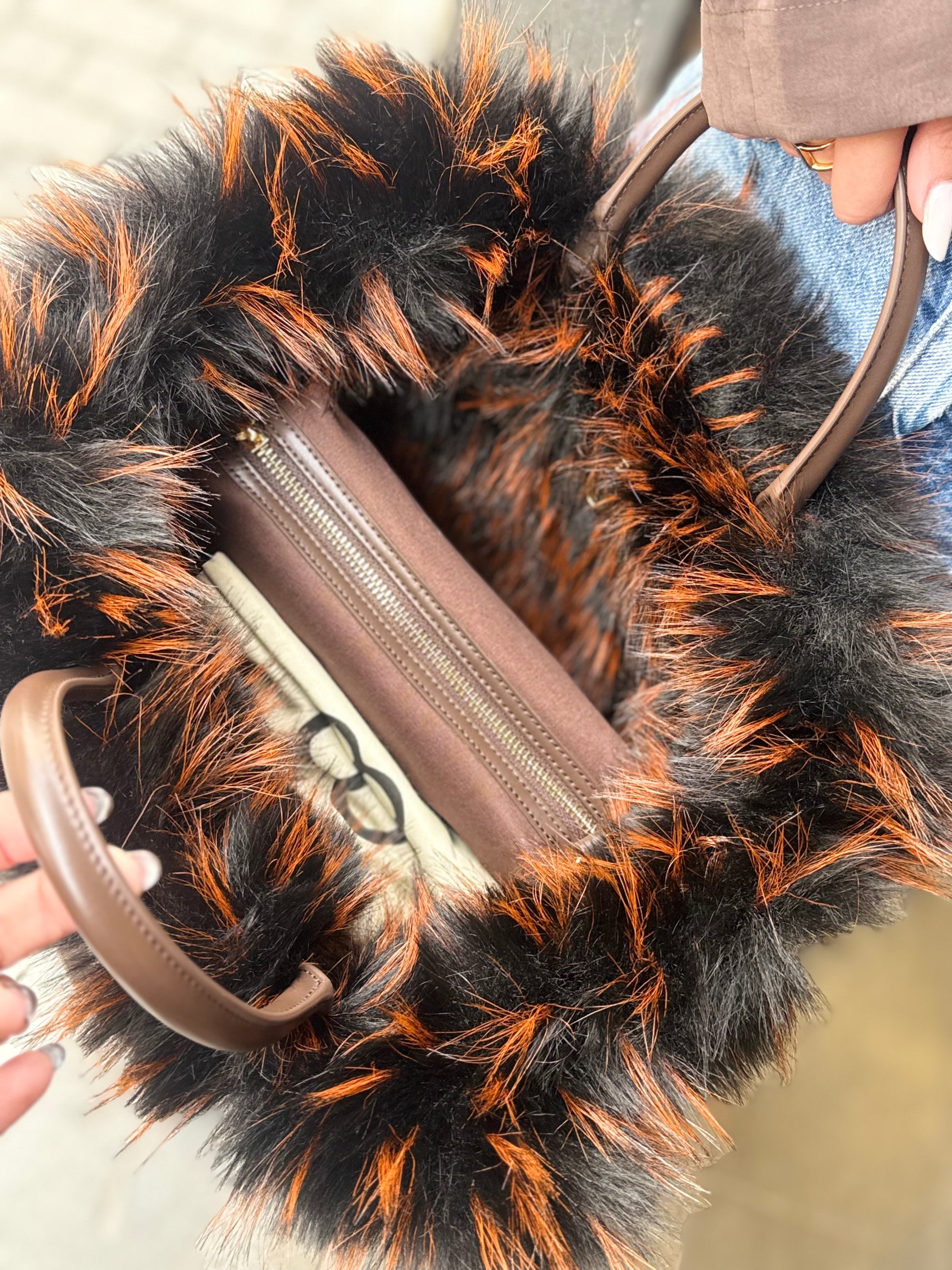 Borsa reversibile realizzata in pelle e tessuto, caratterizzata da lavorazione intrecciata con bordo in ecopelliccia.