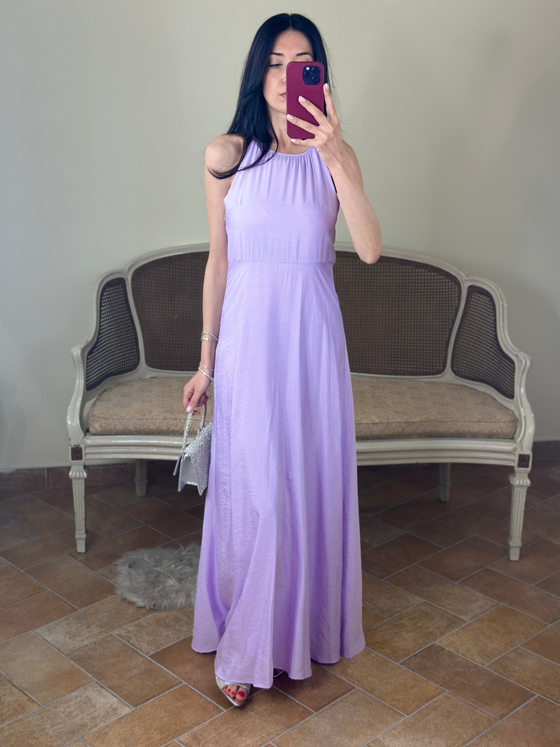 Abito lungo smanicato, girocollo, taglio a trapezio, svasato sul fondo, fodera interna, chiusura con zip posteriore, cintura in vita.