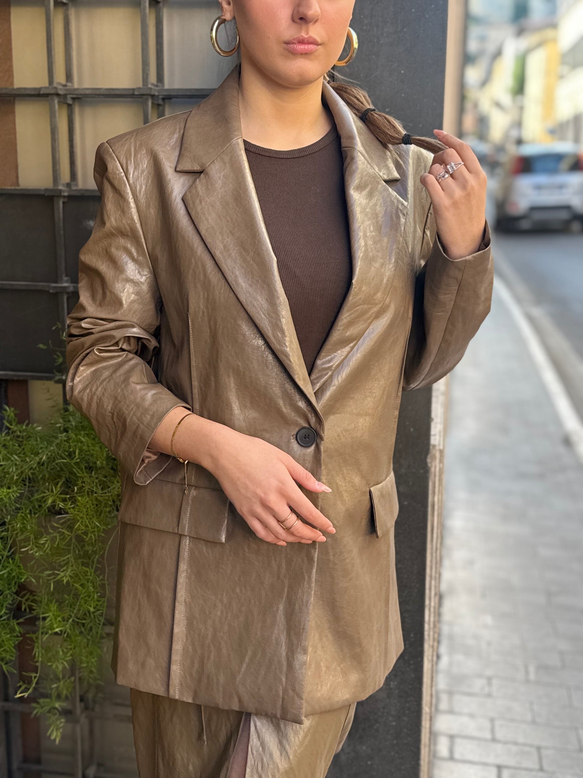 Blazer in ecopelle lucida effetto stropicciato, un petto chiusura con un bottone, tasche cucite, revere a lancia, foderata internamente.