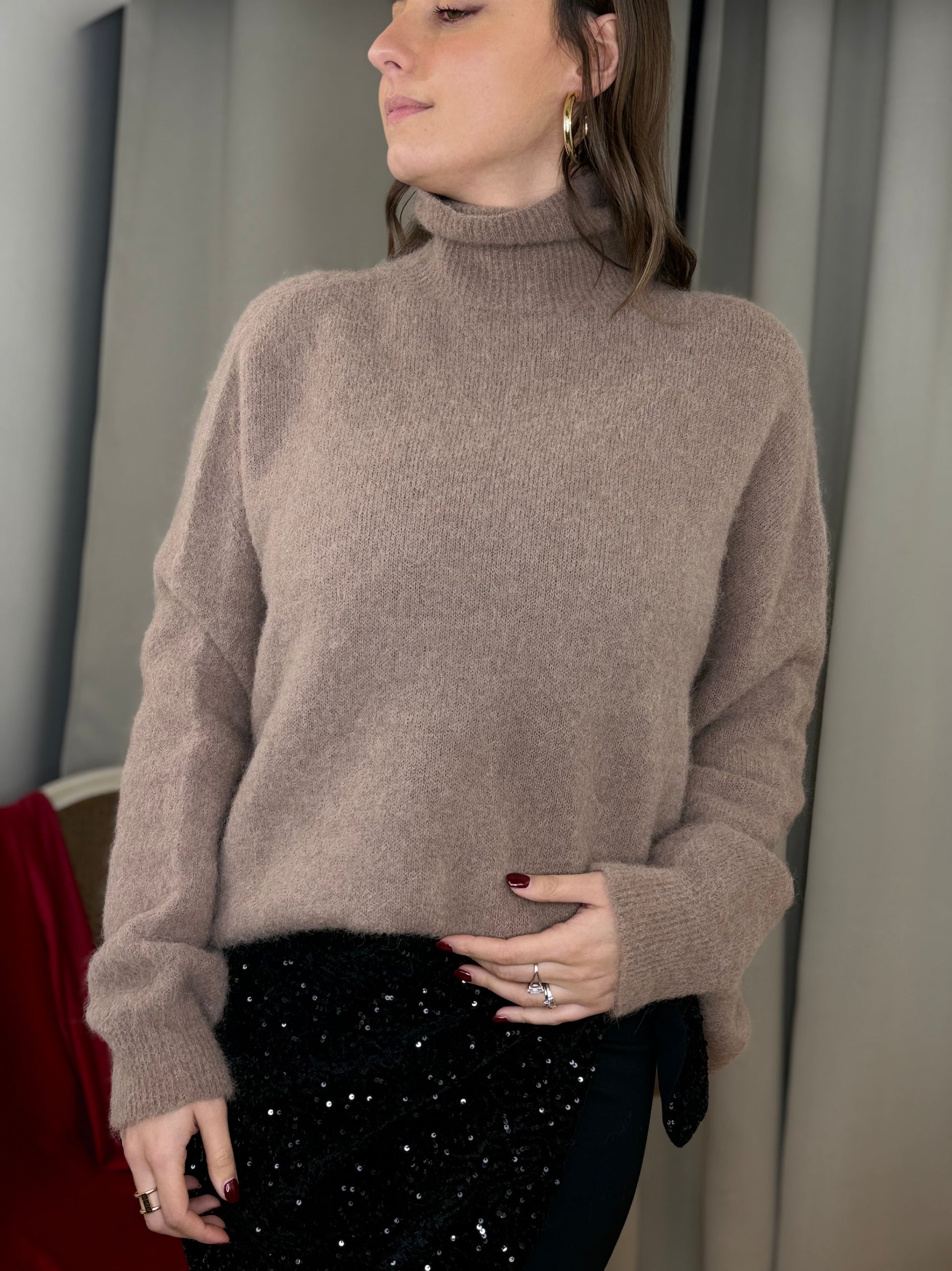 Maglia collo rialzato, taglio sorriso nel fondo.