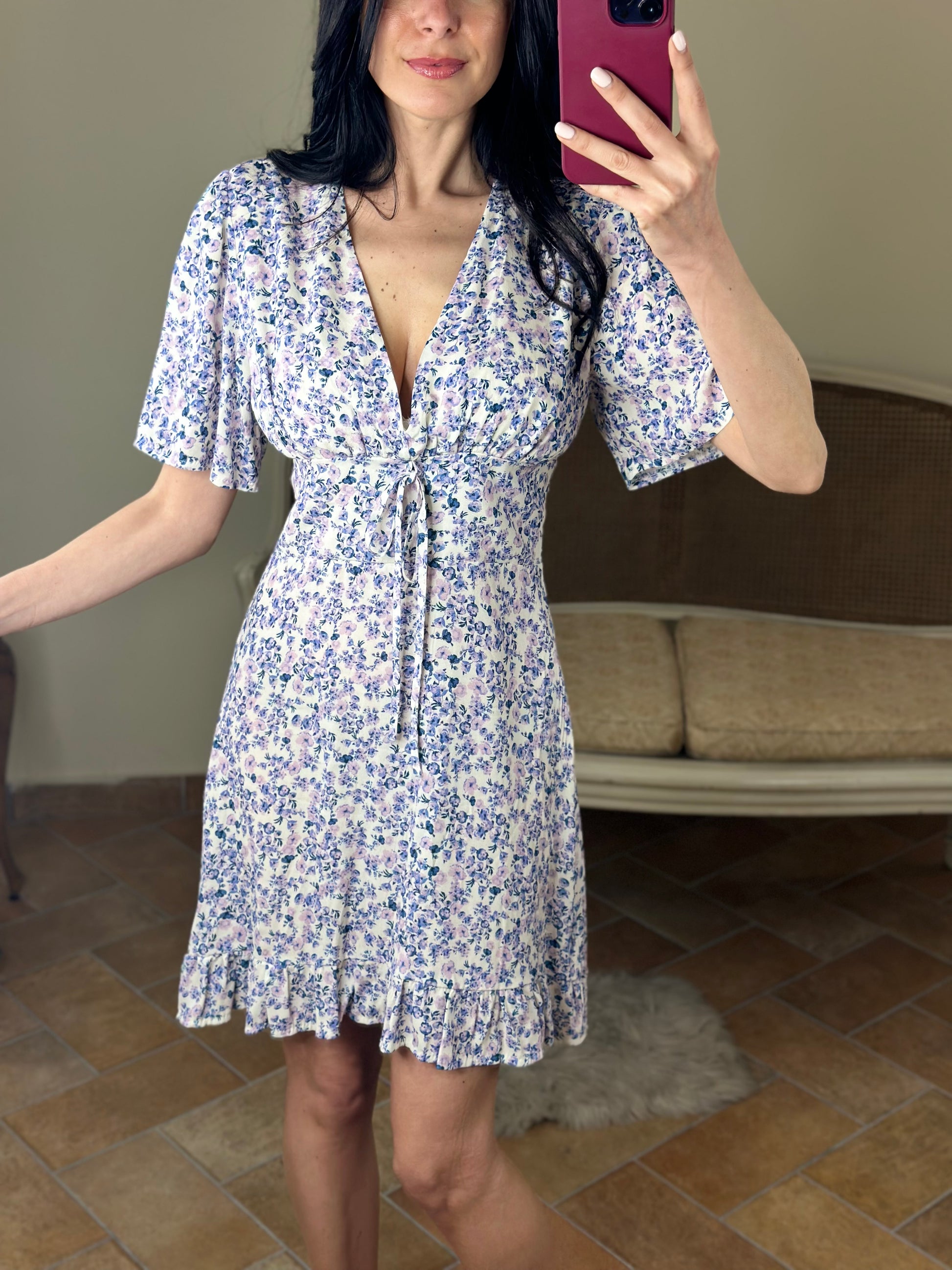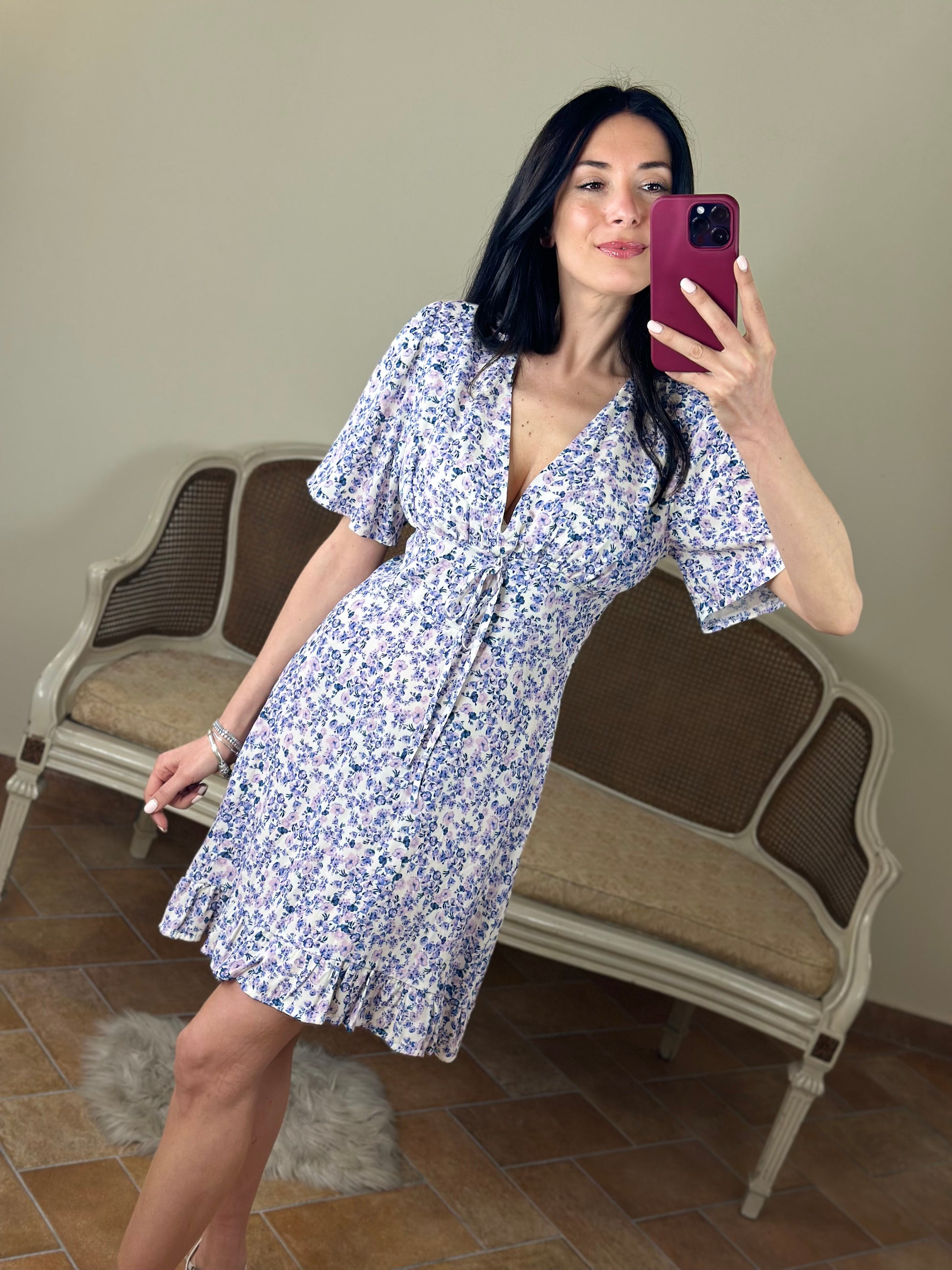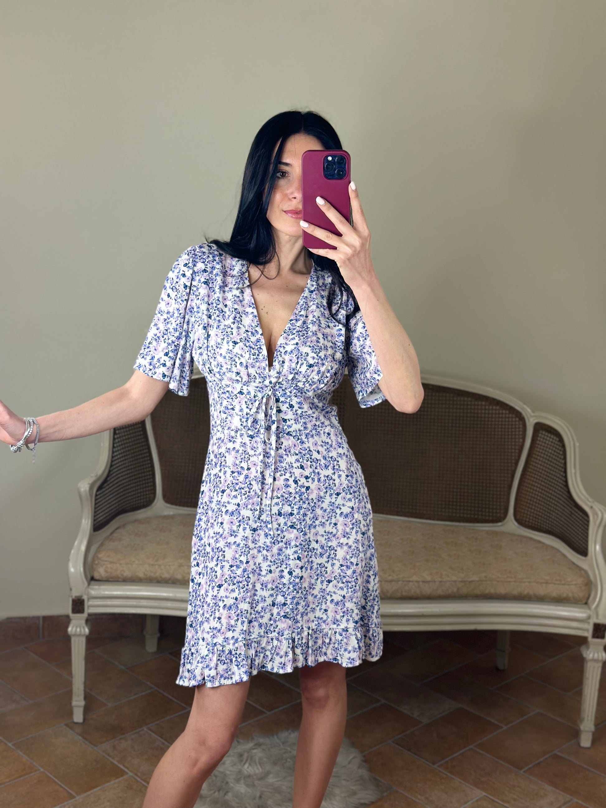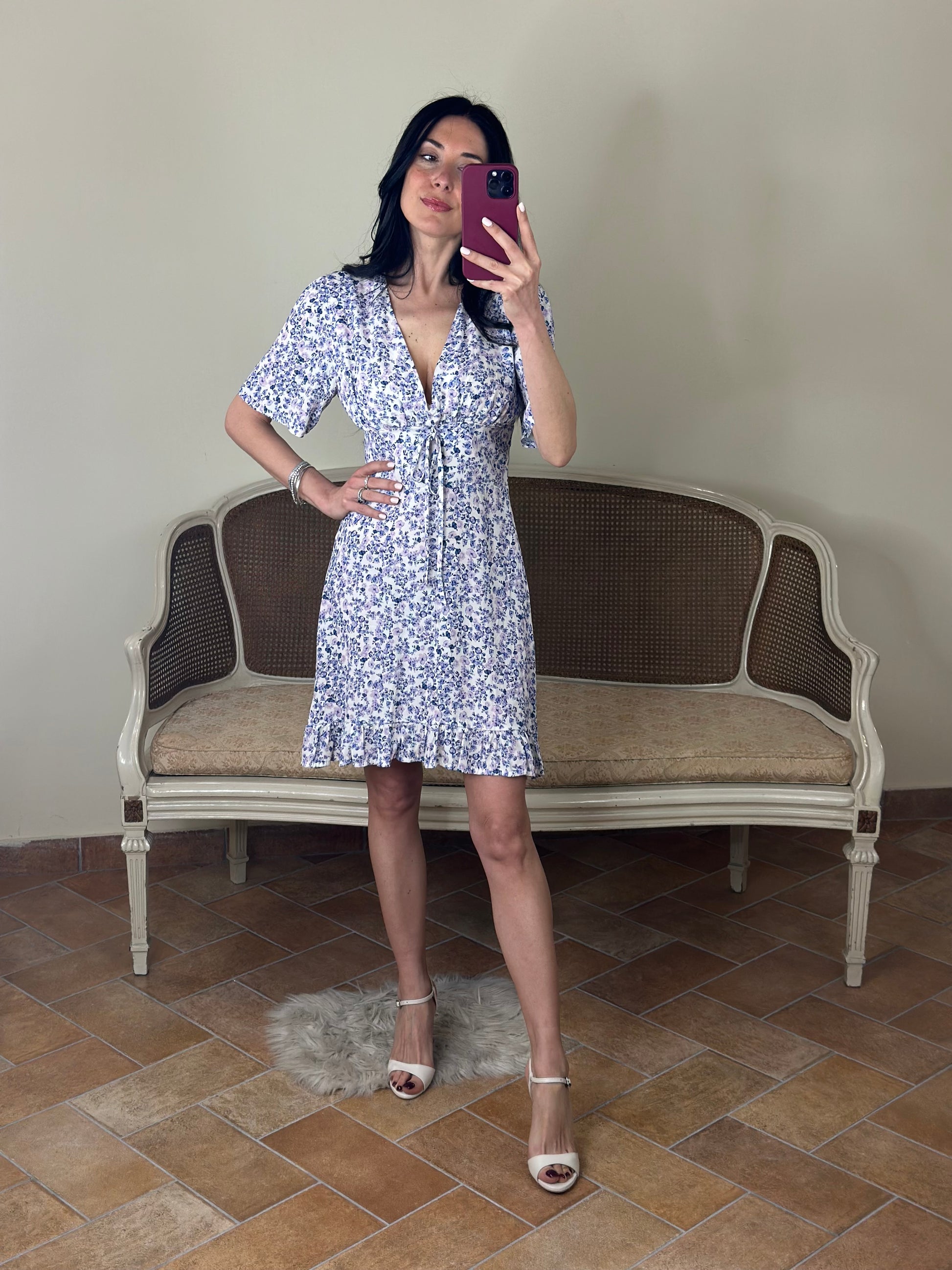 Abito corto manica corta stampa fiorellini variante lilla , scollo a V con coulisse, chiusura con zip posteriore.
