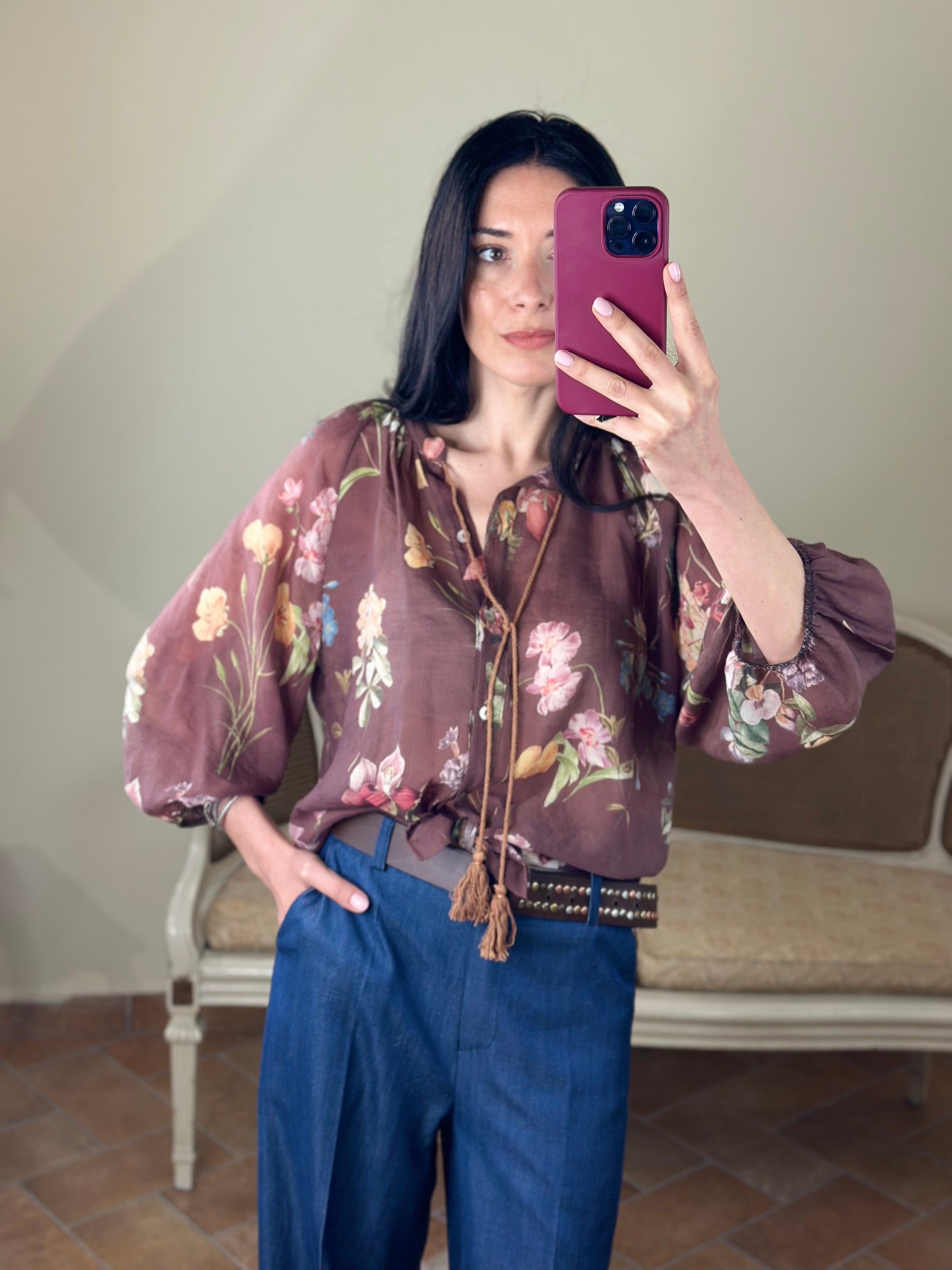 Camicia stampa floreale su base cioccolato, manica con elastico nel polsino, nodo frontale, allacciatura con cordino con nappa.