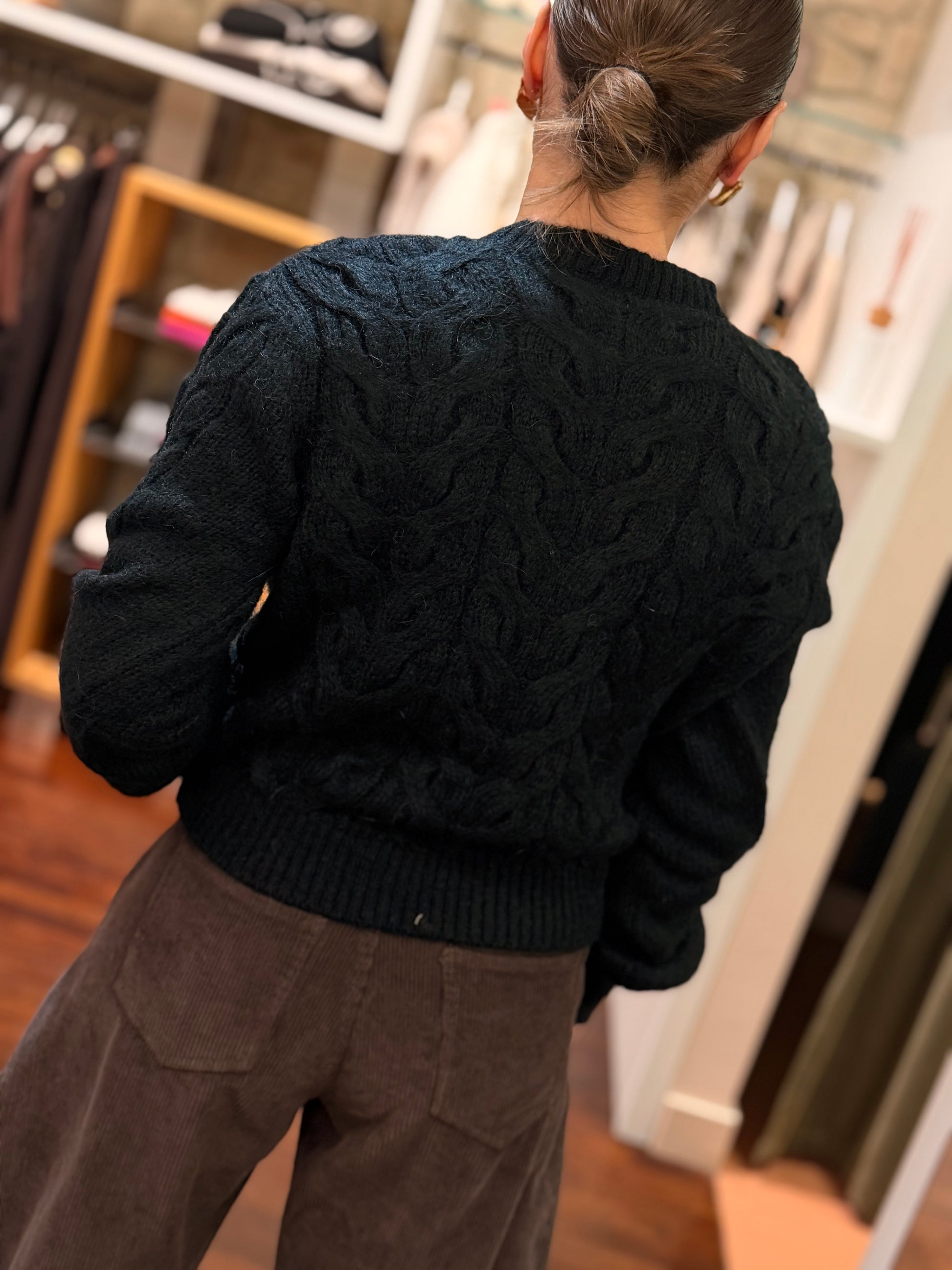 Maglia girocollo in filato misto mohair, caratterizzata da lavorazione a trecce. Modello leggermente corto, con vestibilità morbida. Finiture a costine su collo, polsi e fondo.