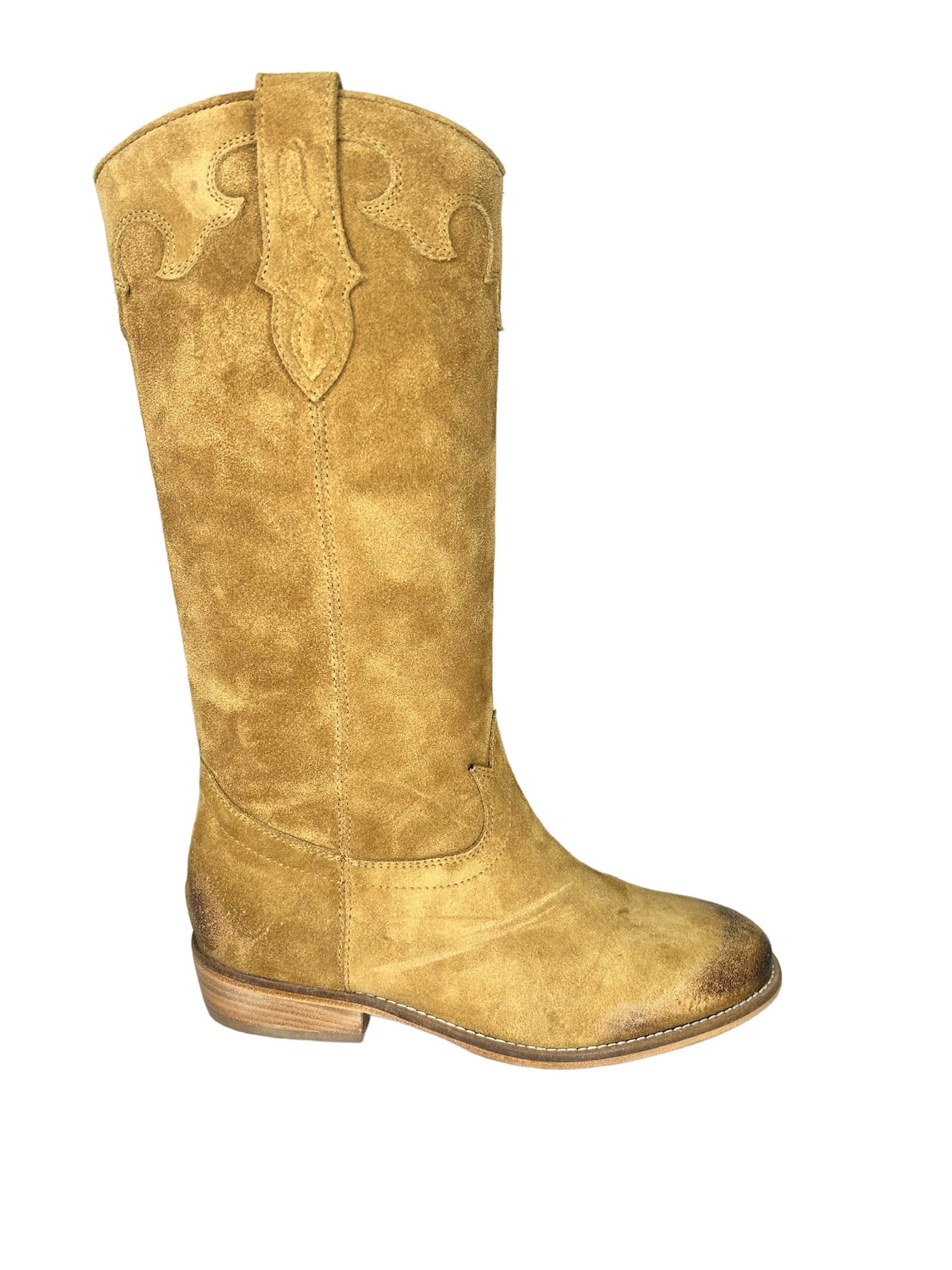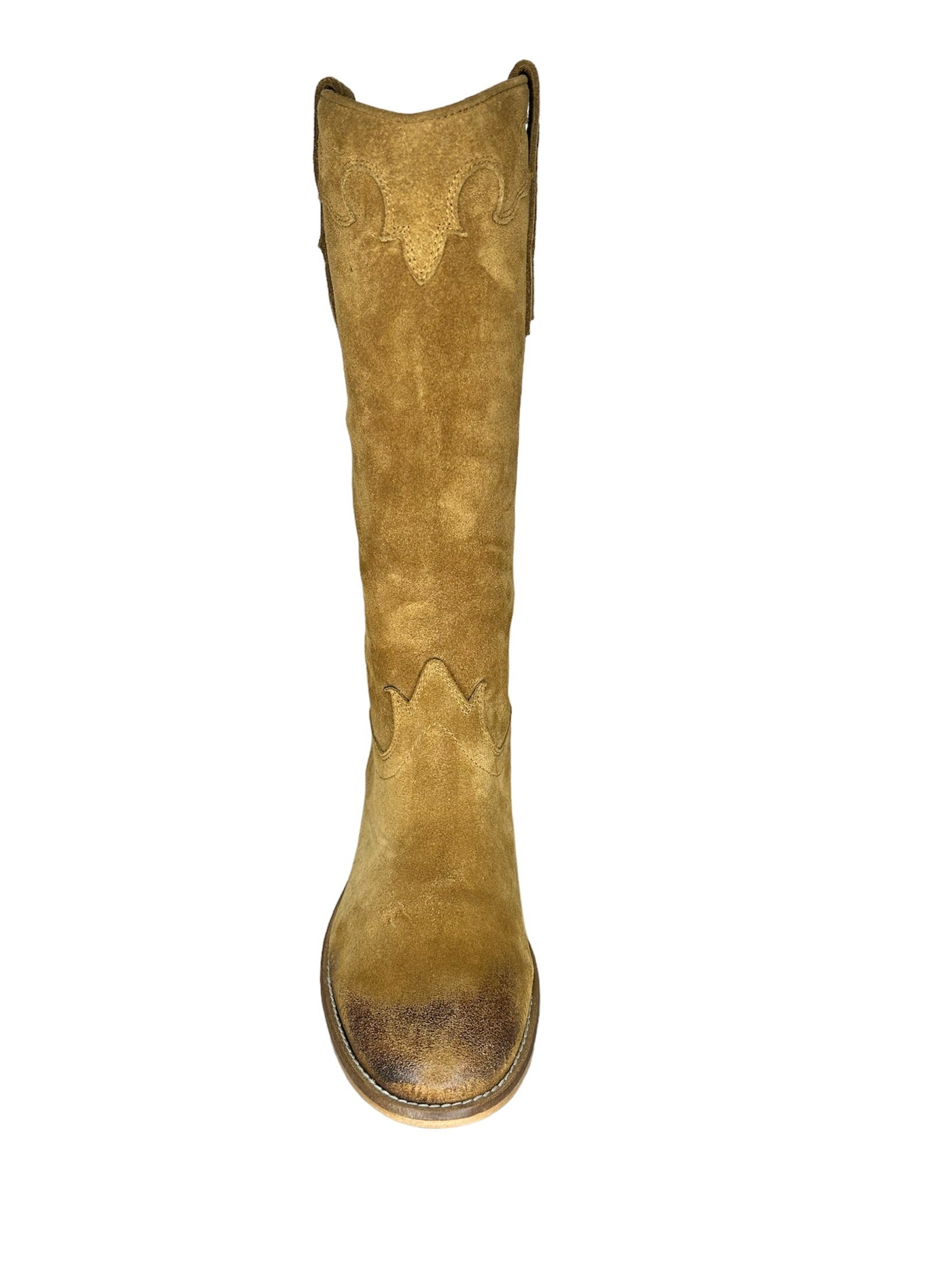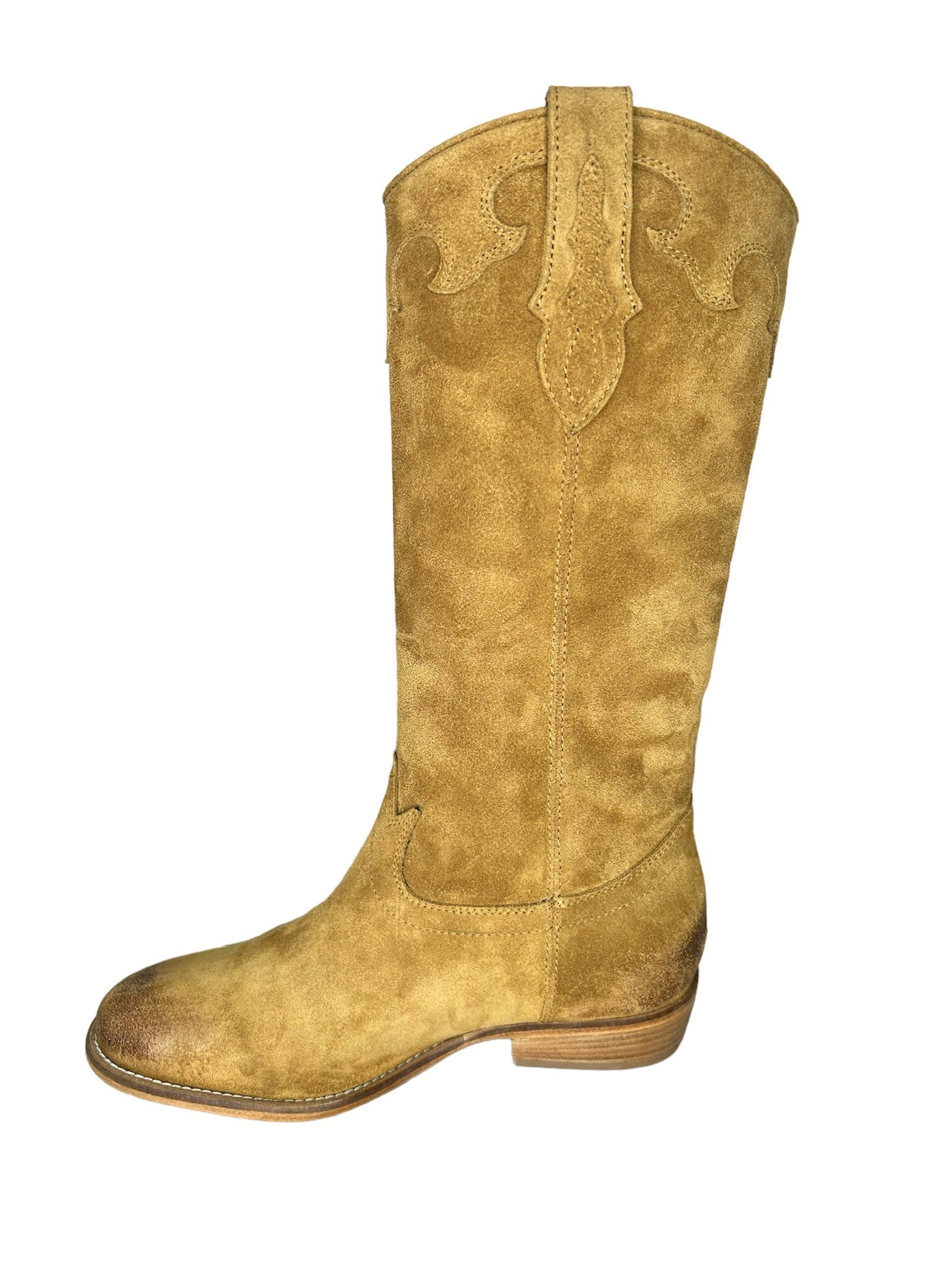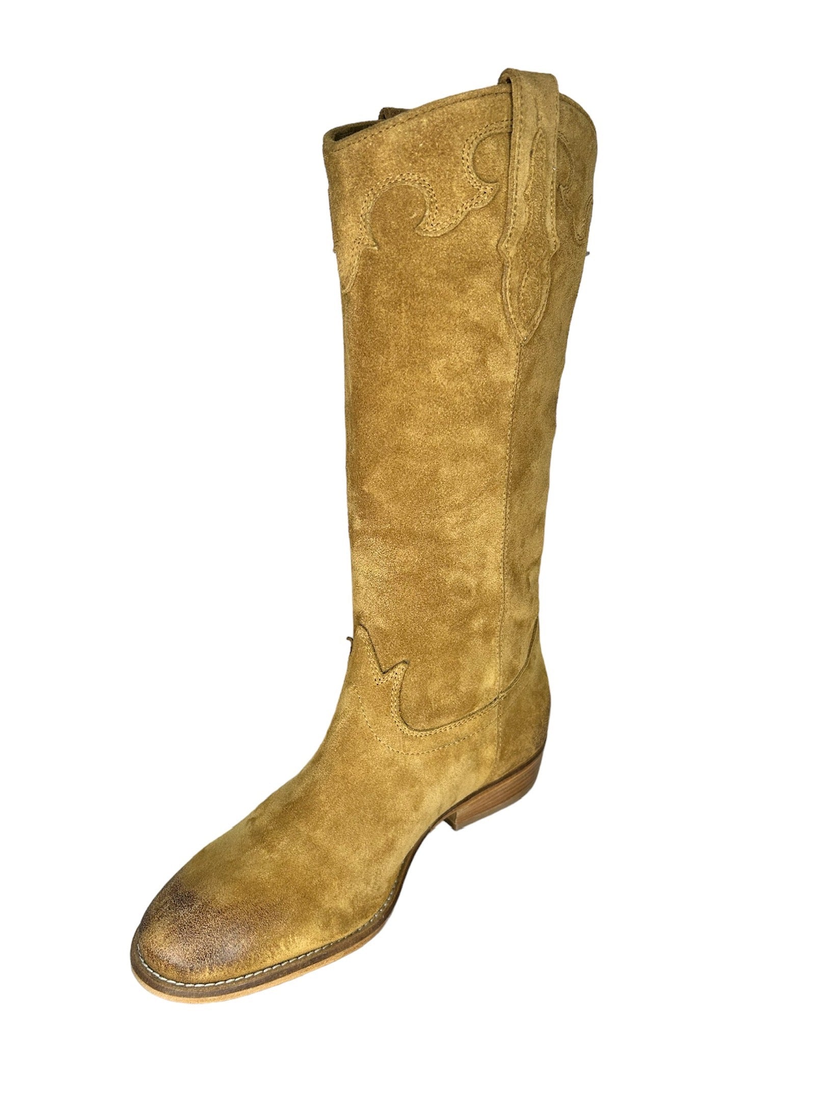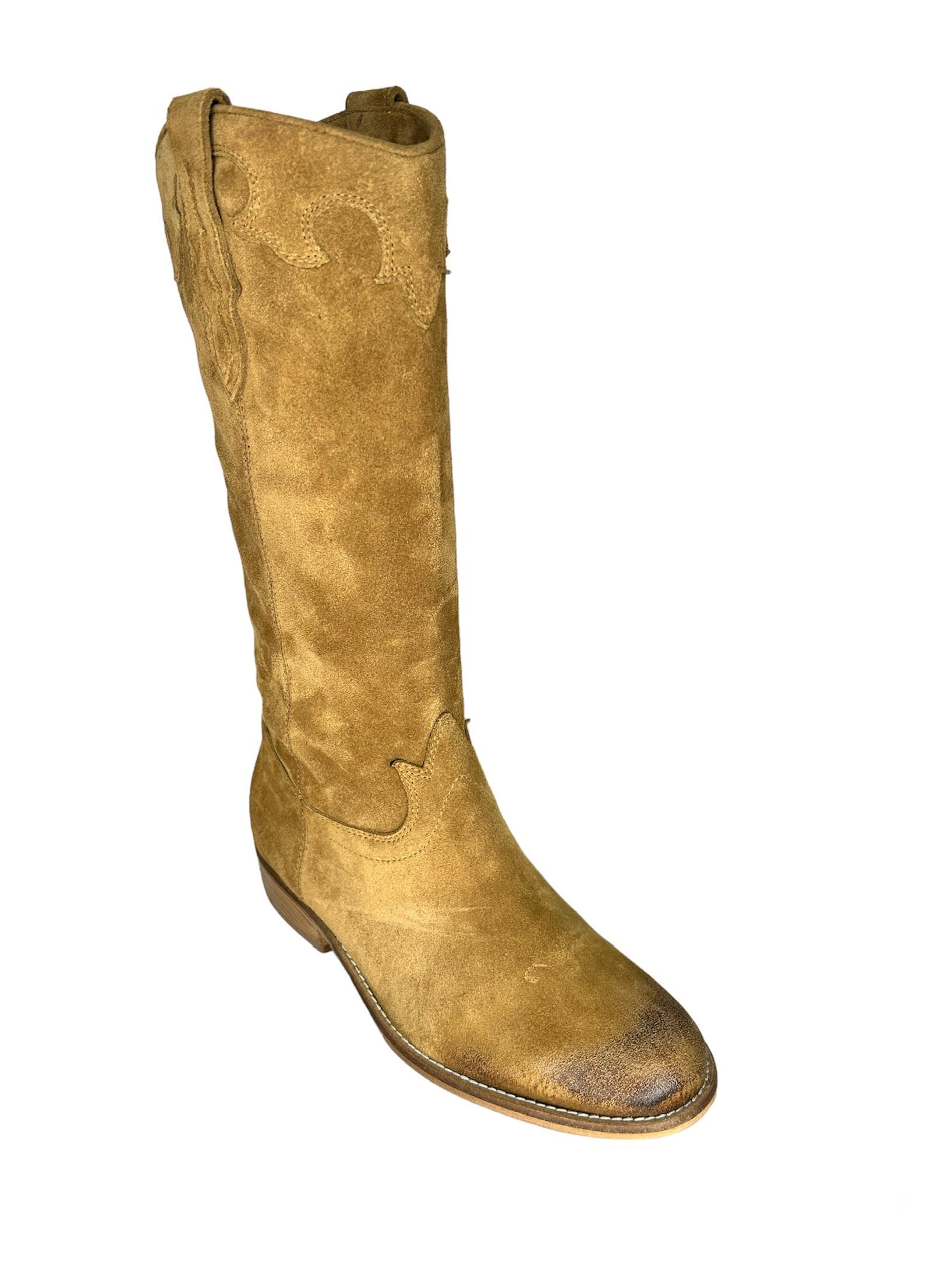 Stivale in camoscio con impunture nella parte superiore, fondo cuoio e tacco 30mm.