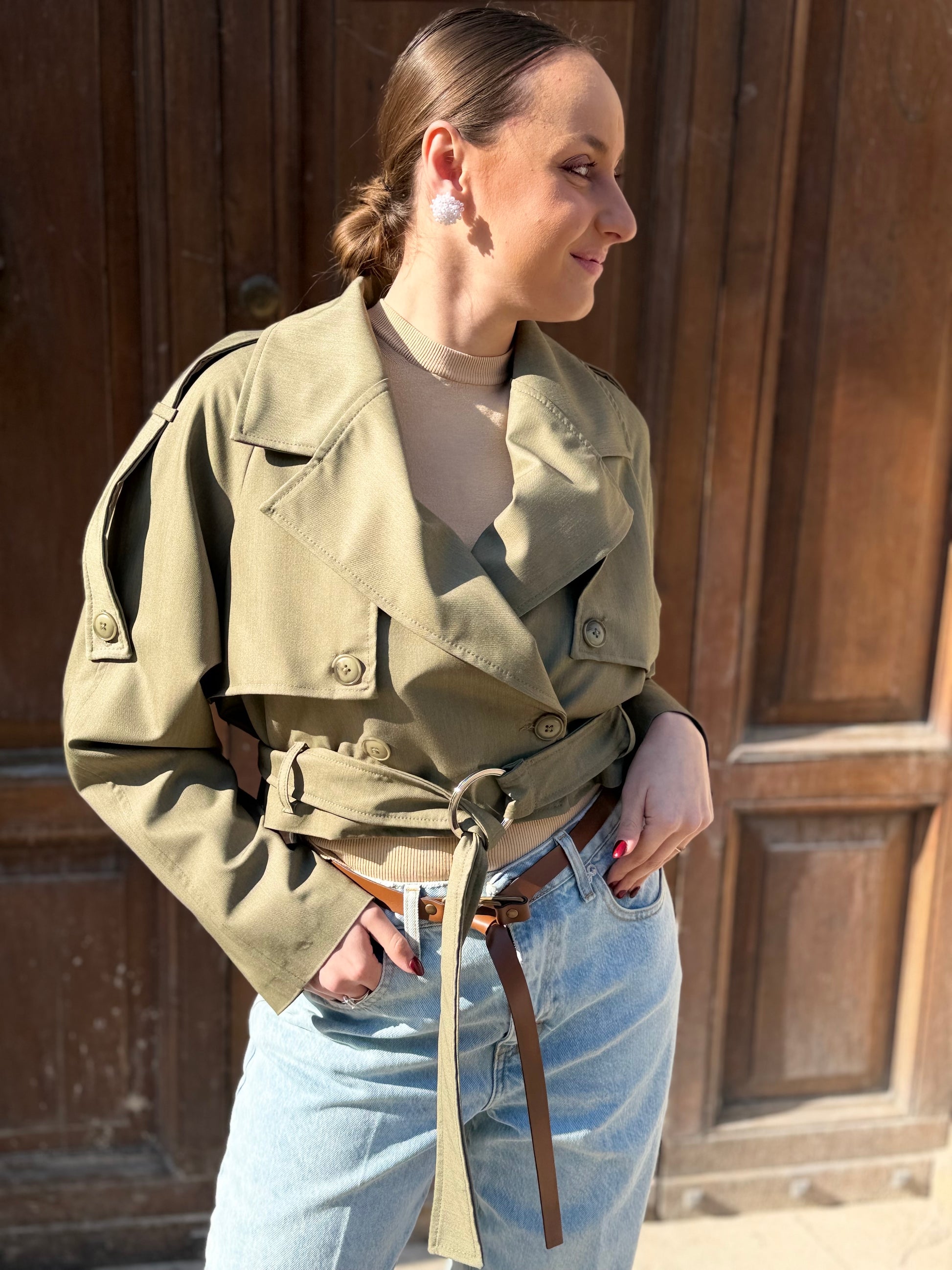 Chiodo crop in tessuto, doppiopetto, foderato internamente.