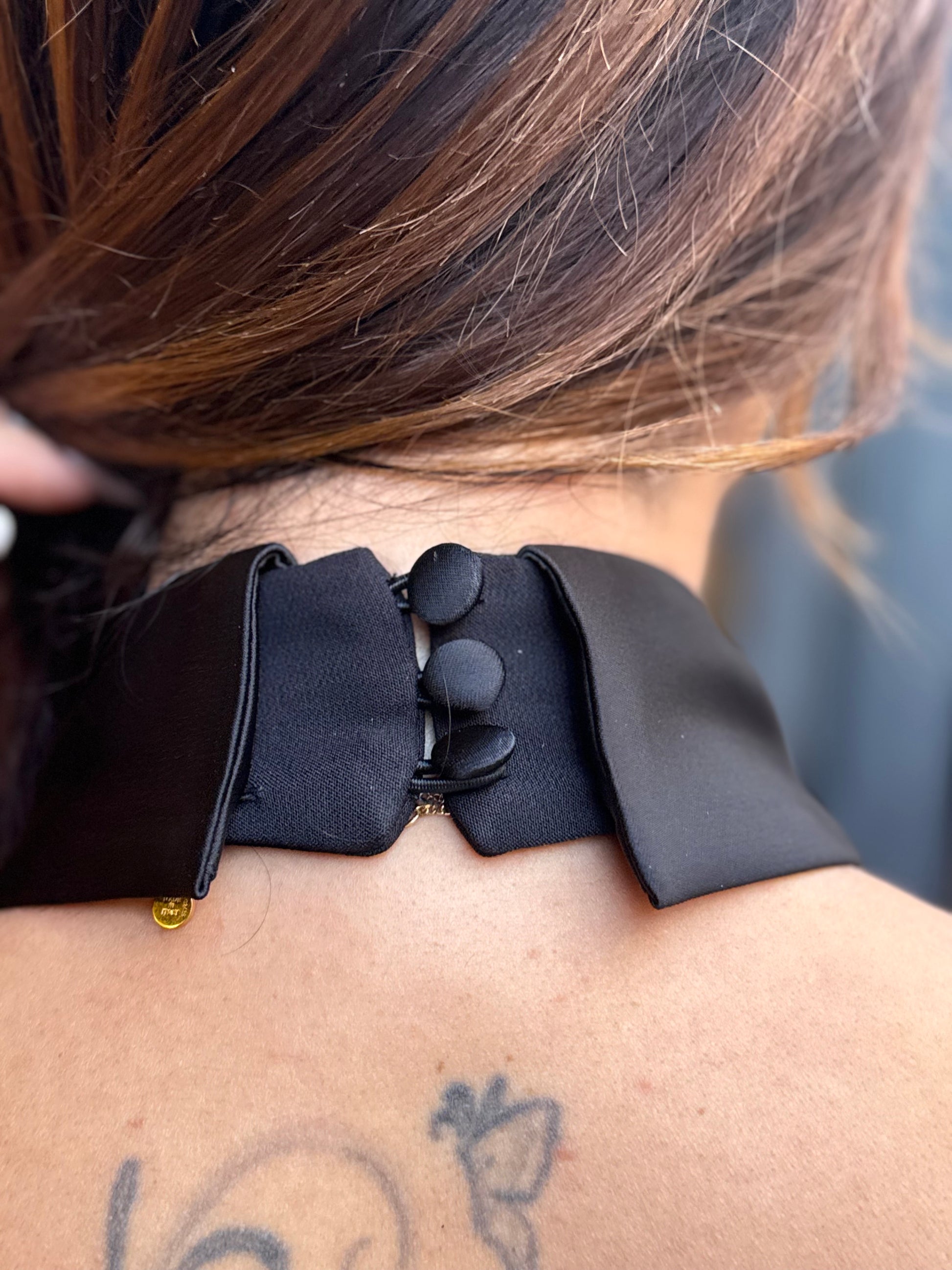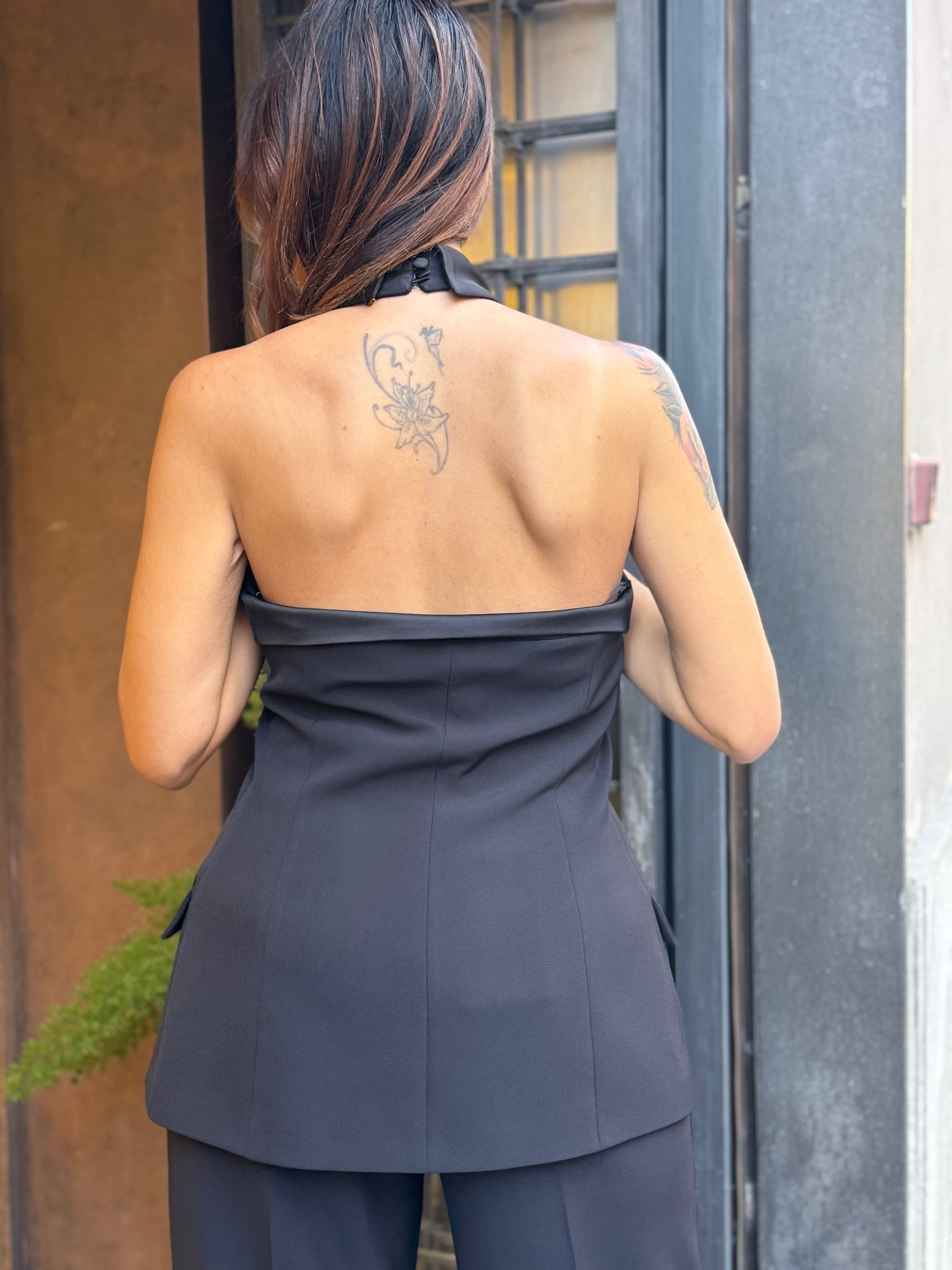 Gilet con scollo incrociato, spalle scoperte, chiusura con due bottoncini a scomparsa, dettagli satinati, doppia tasca a filetto cucita.