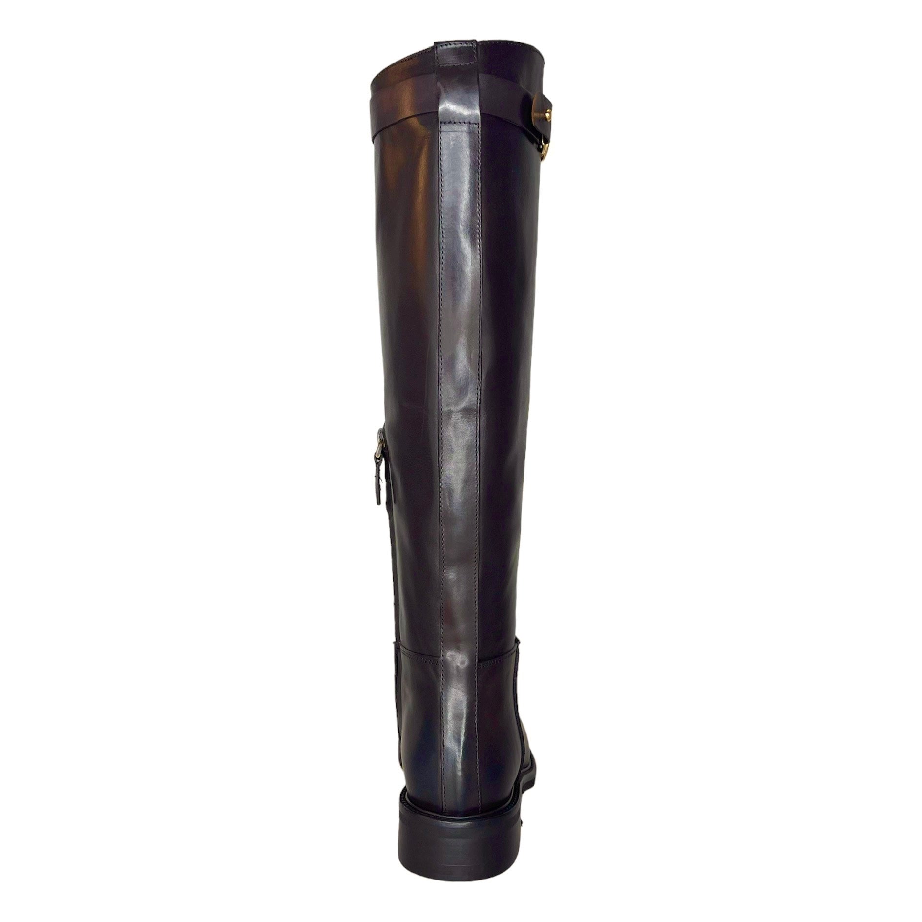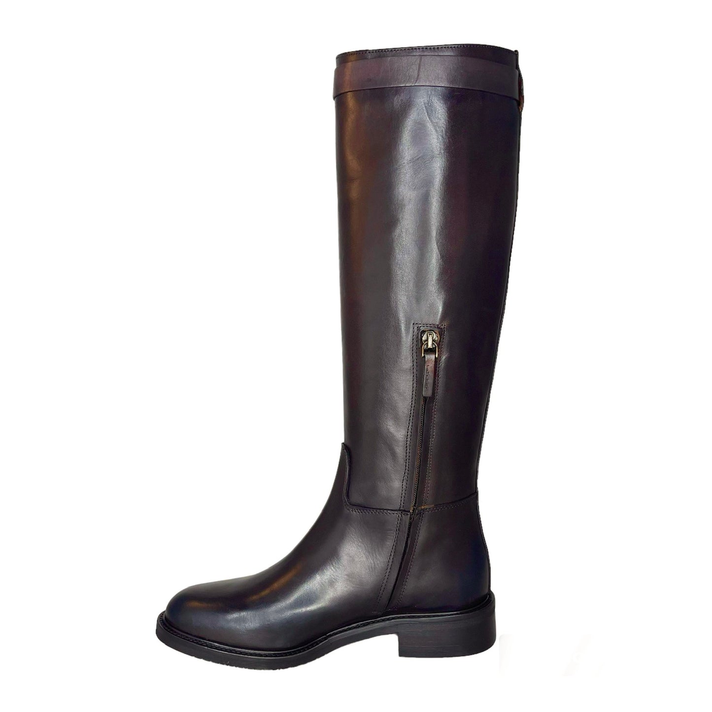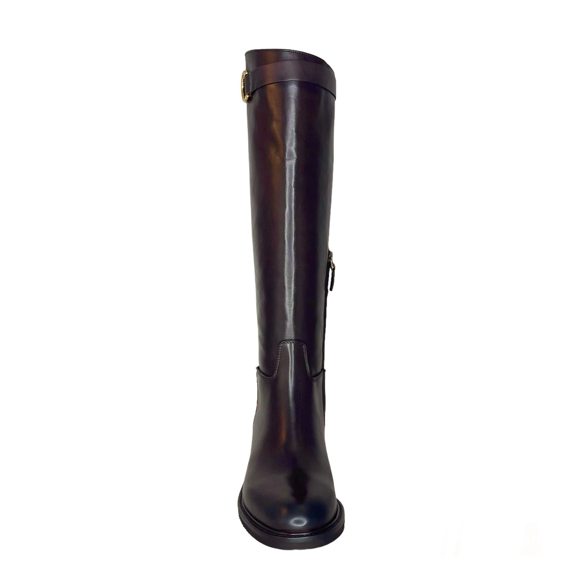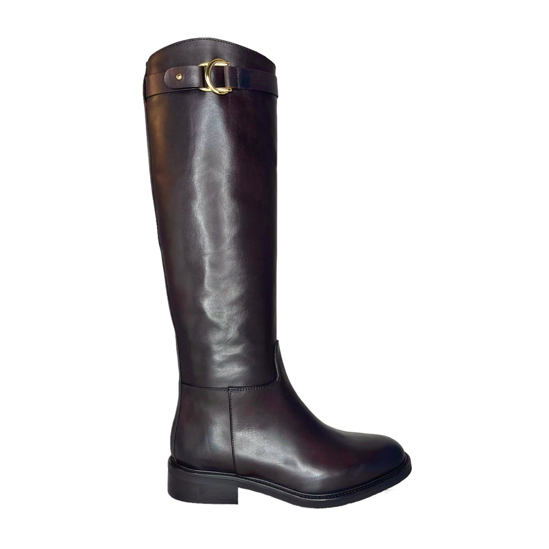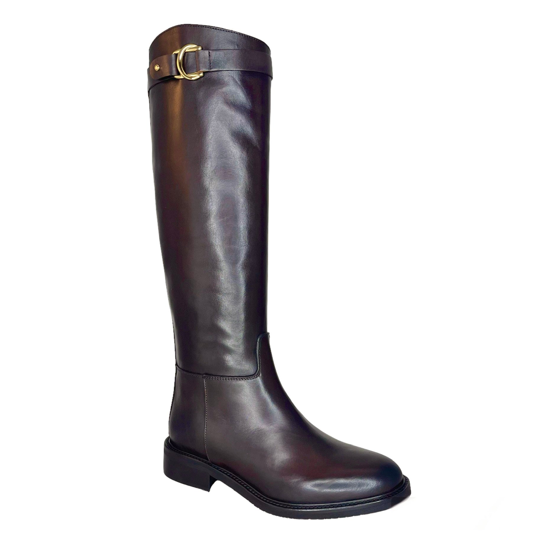 Stivale in pelle tubolare, stile cavallerizzo, cinturino con dettaglio dorato, chiusura laterale interna con zip, suola in tunit, tacco 30mm.