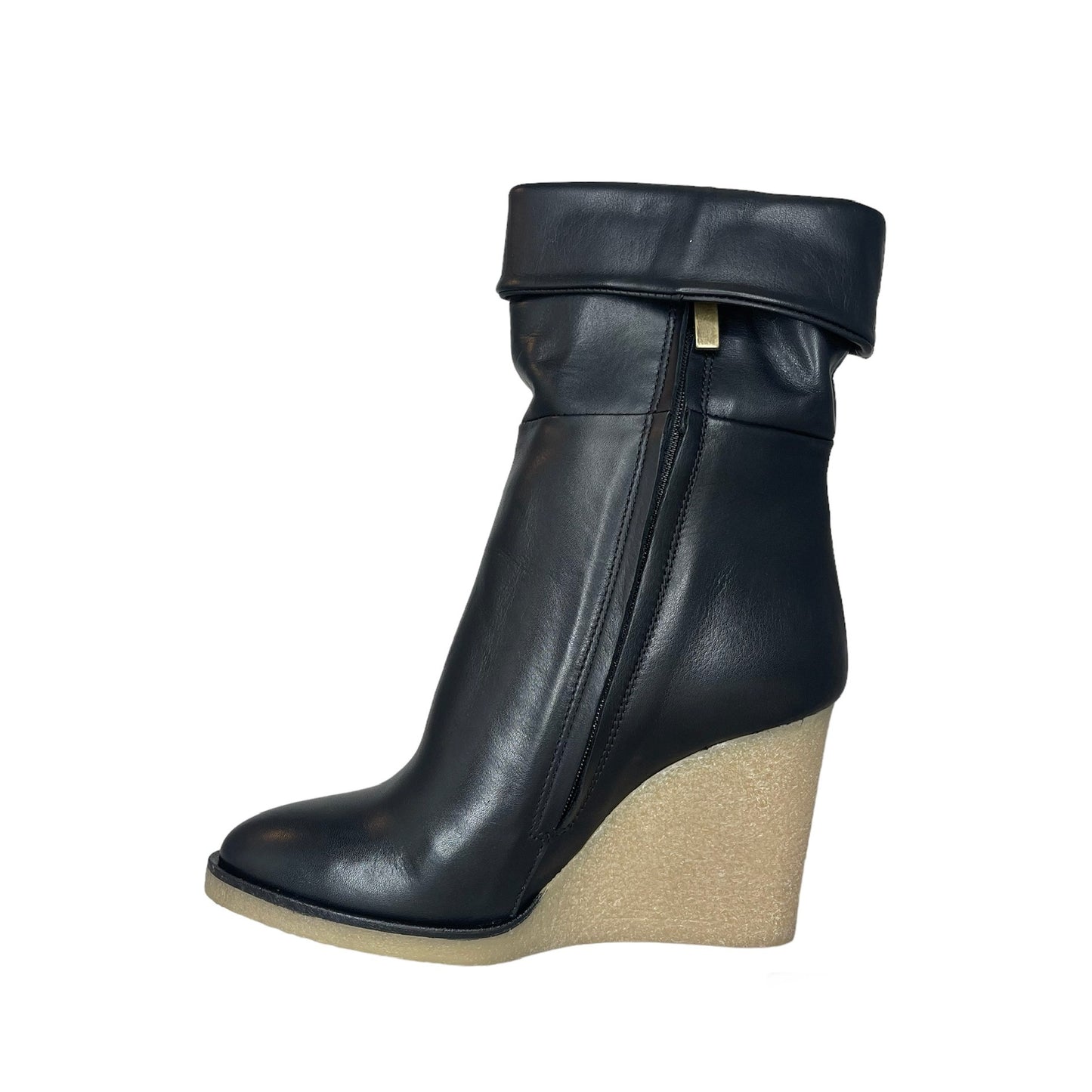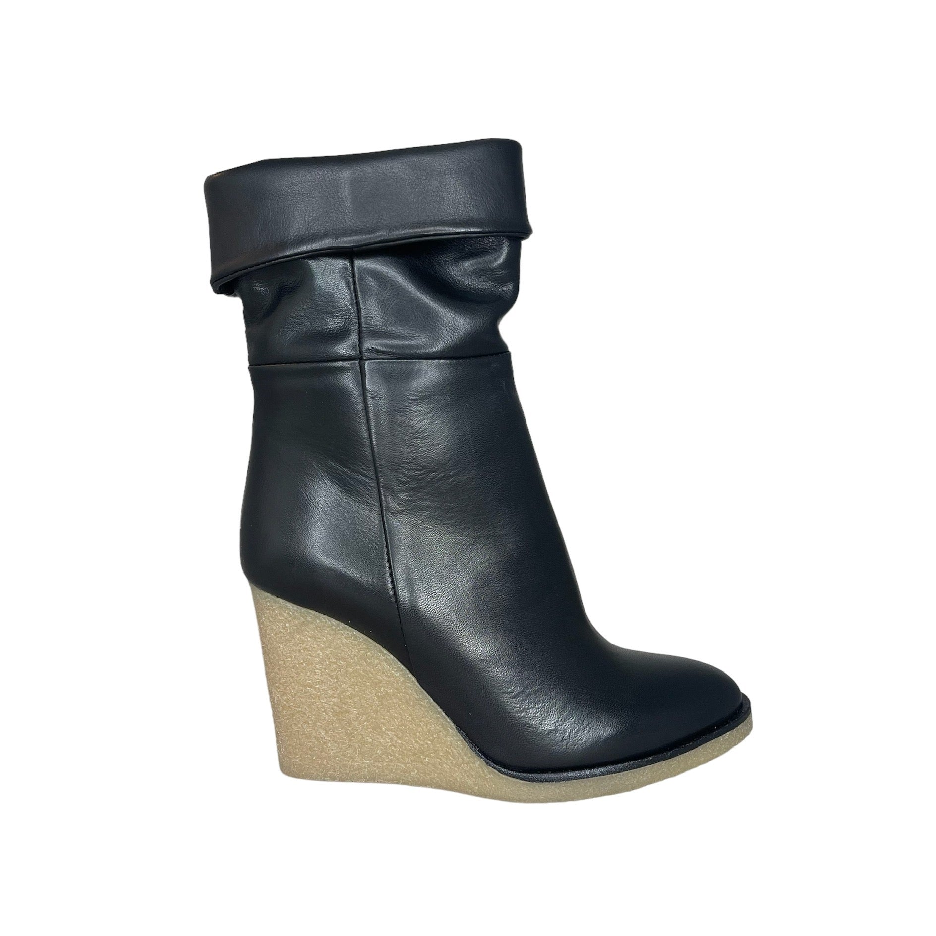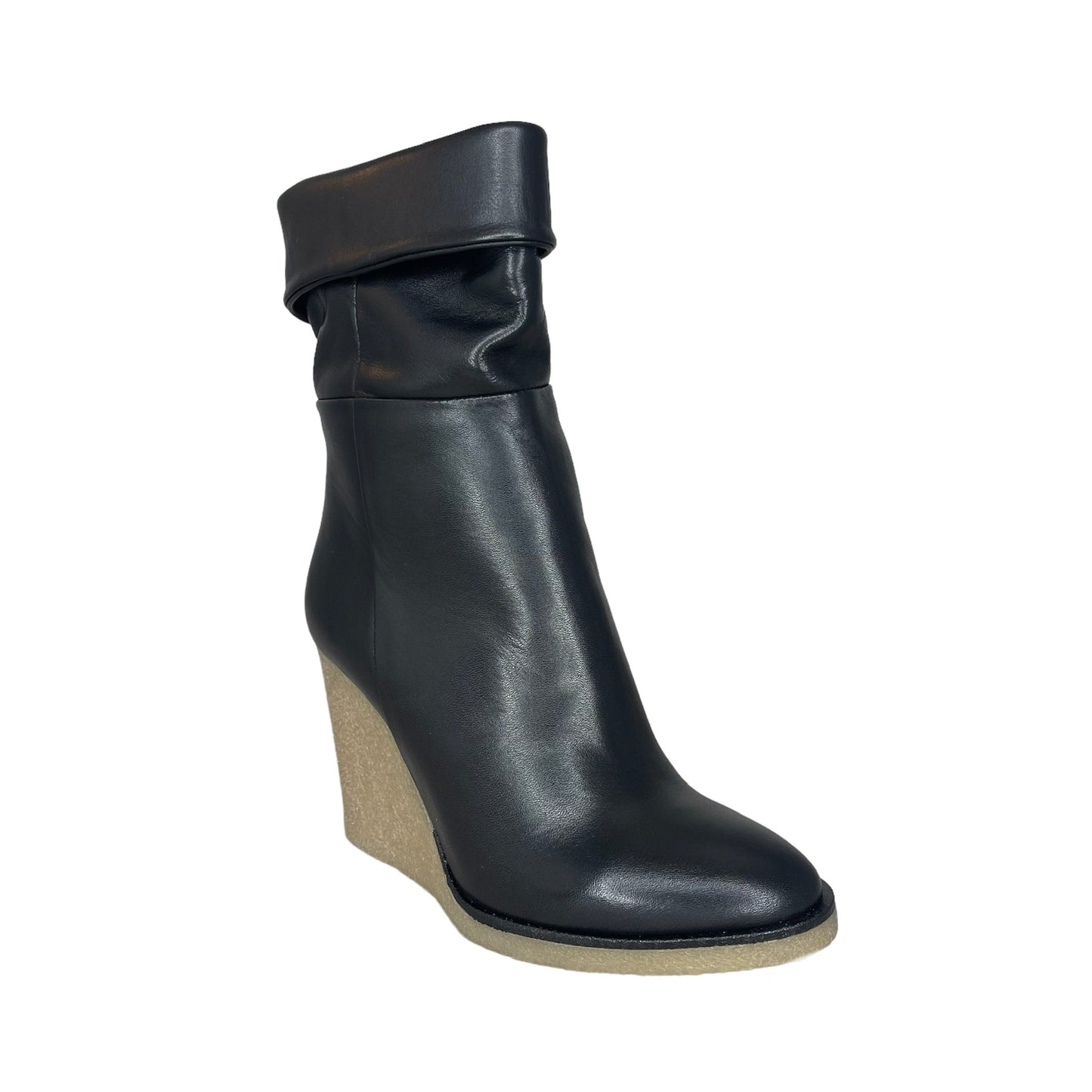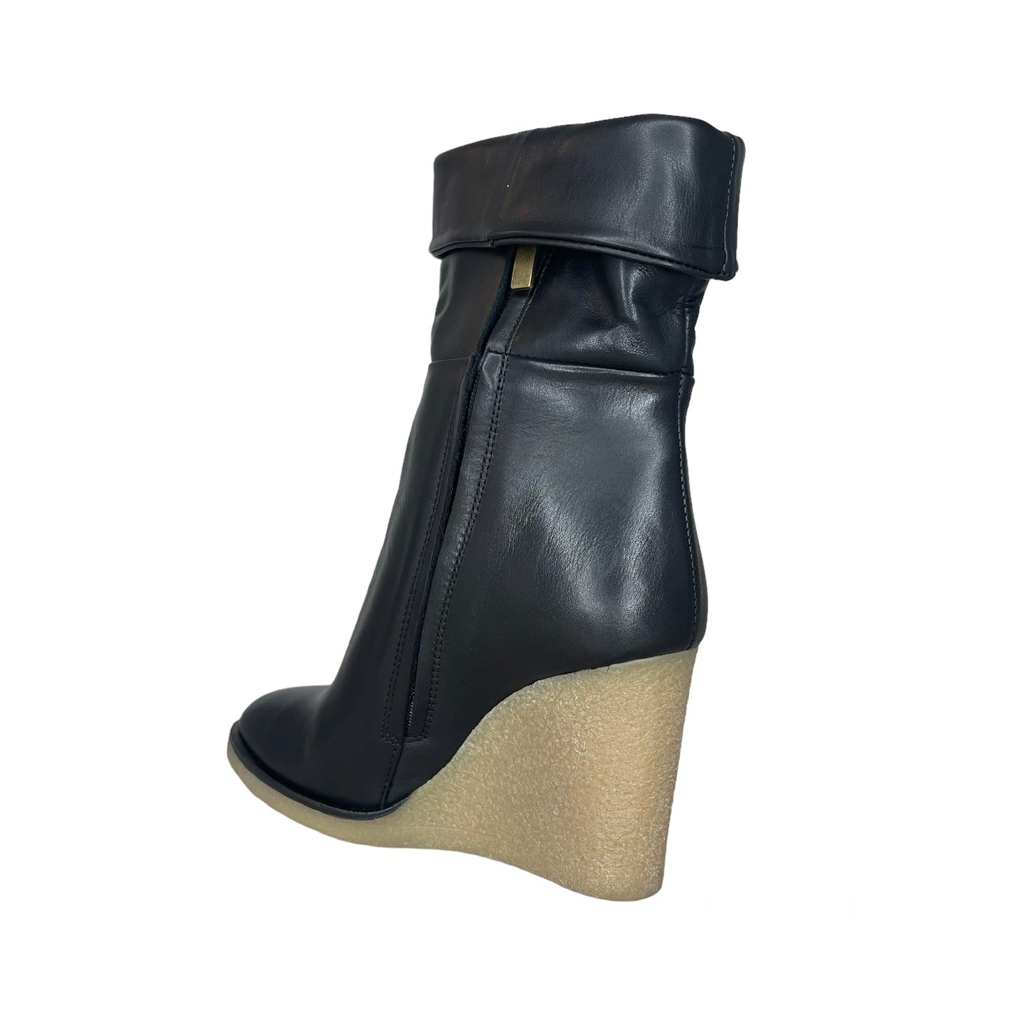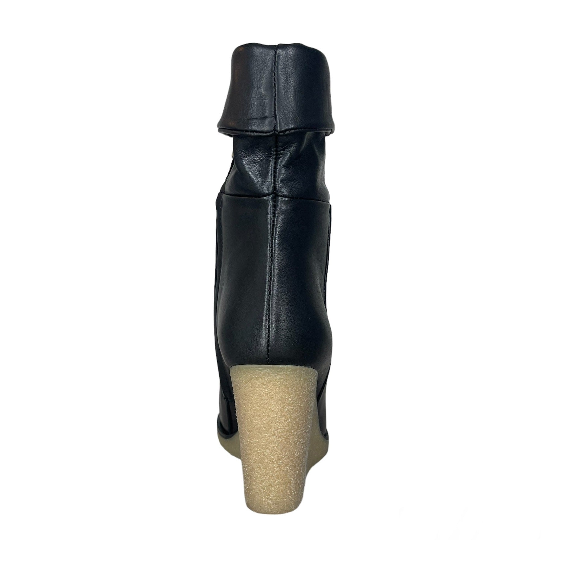 Stivaletto in pelle con zip laterale interno, possibilità di risvolto sul gambale, zeppa in gomma 85 mm.