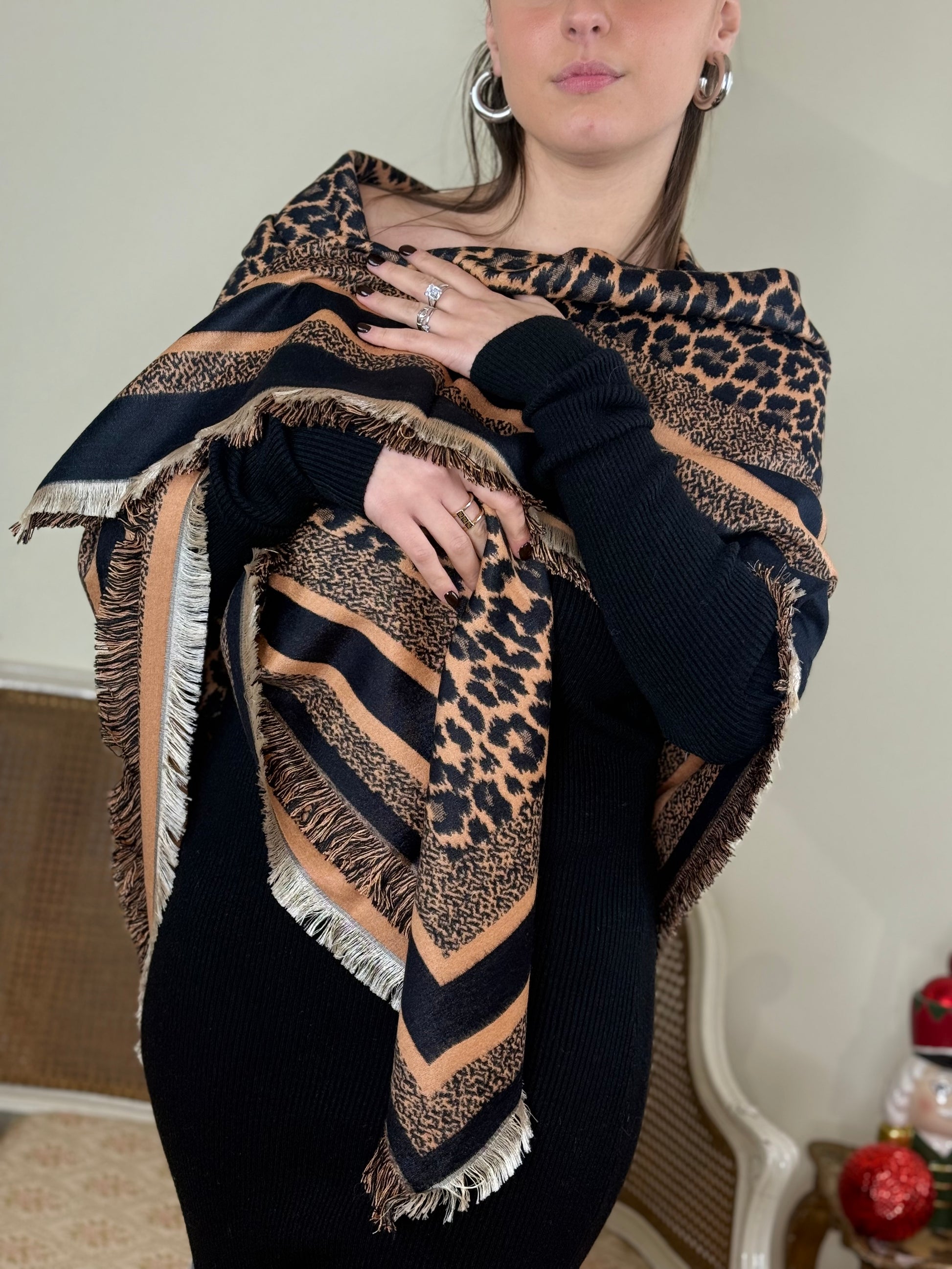 Maxi sciarpa con stampa maculata variante nero/camel.