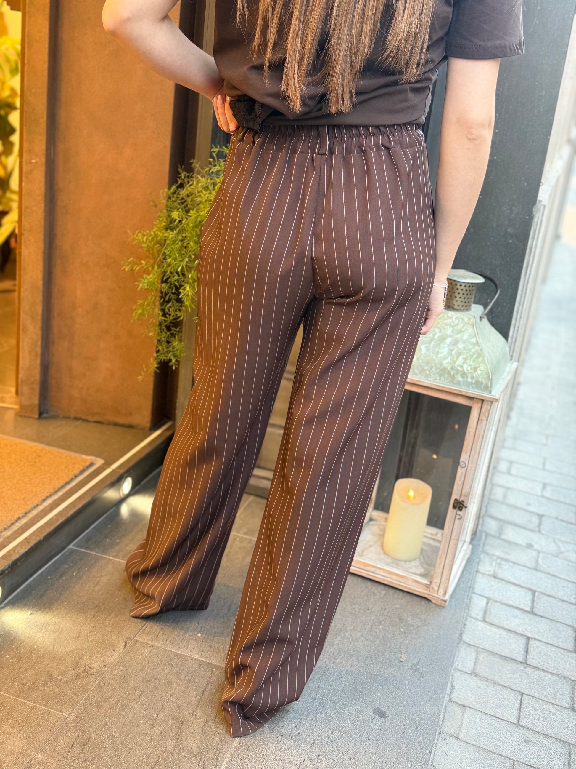 Pantalone a palazzo con molla posteriore e tasche a filetto.