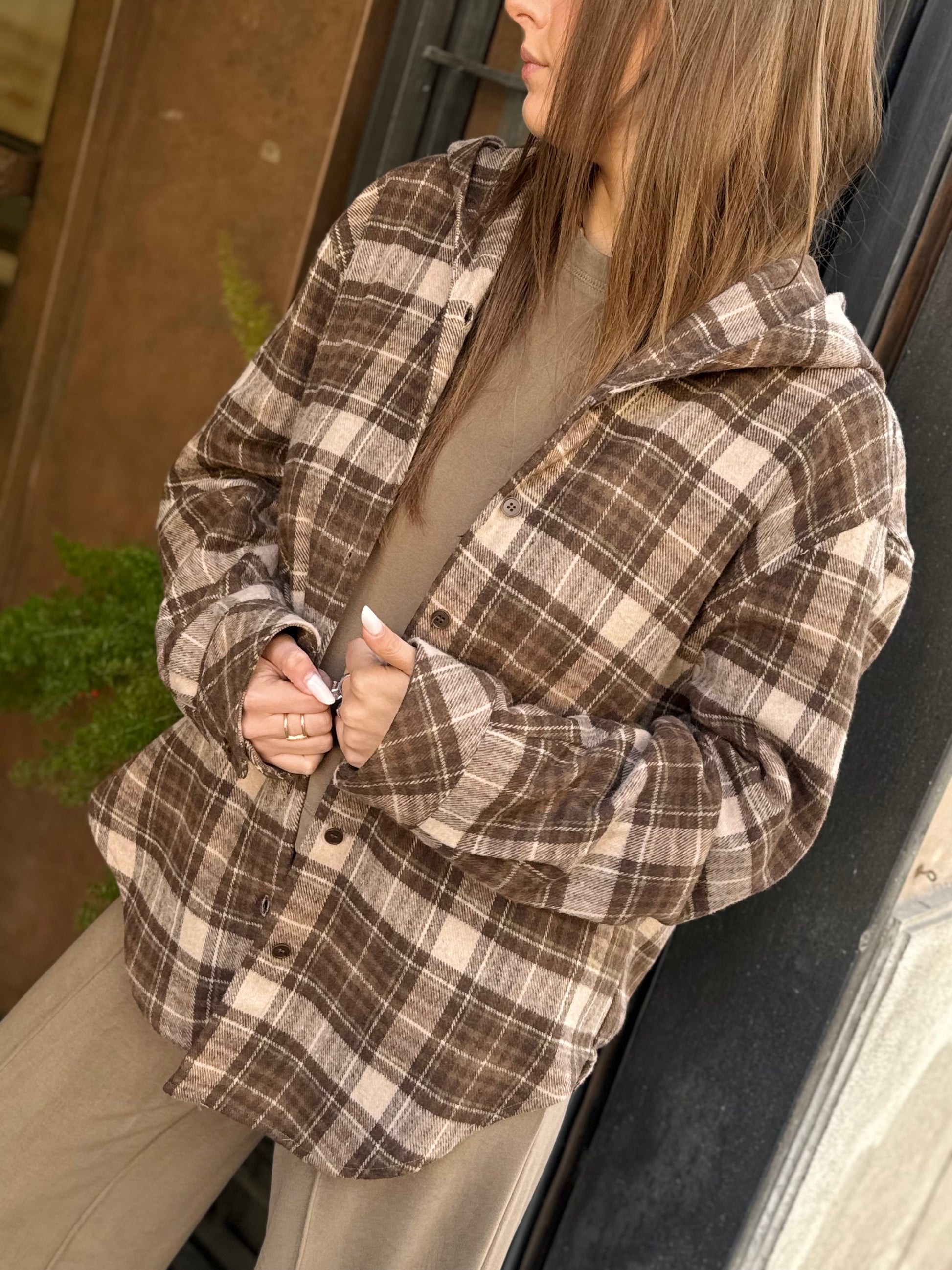 Camicia over a scacchi in flanella con cappuccio. Abbottonatura frontale. Pences sul retro. Disponibile nella variante marrone.