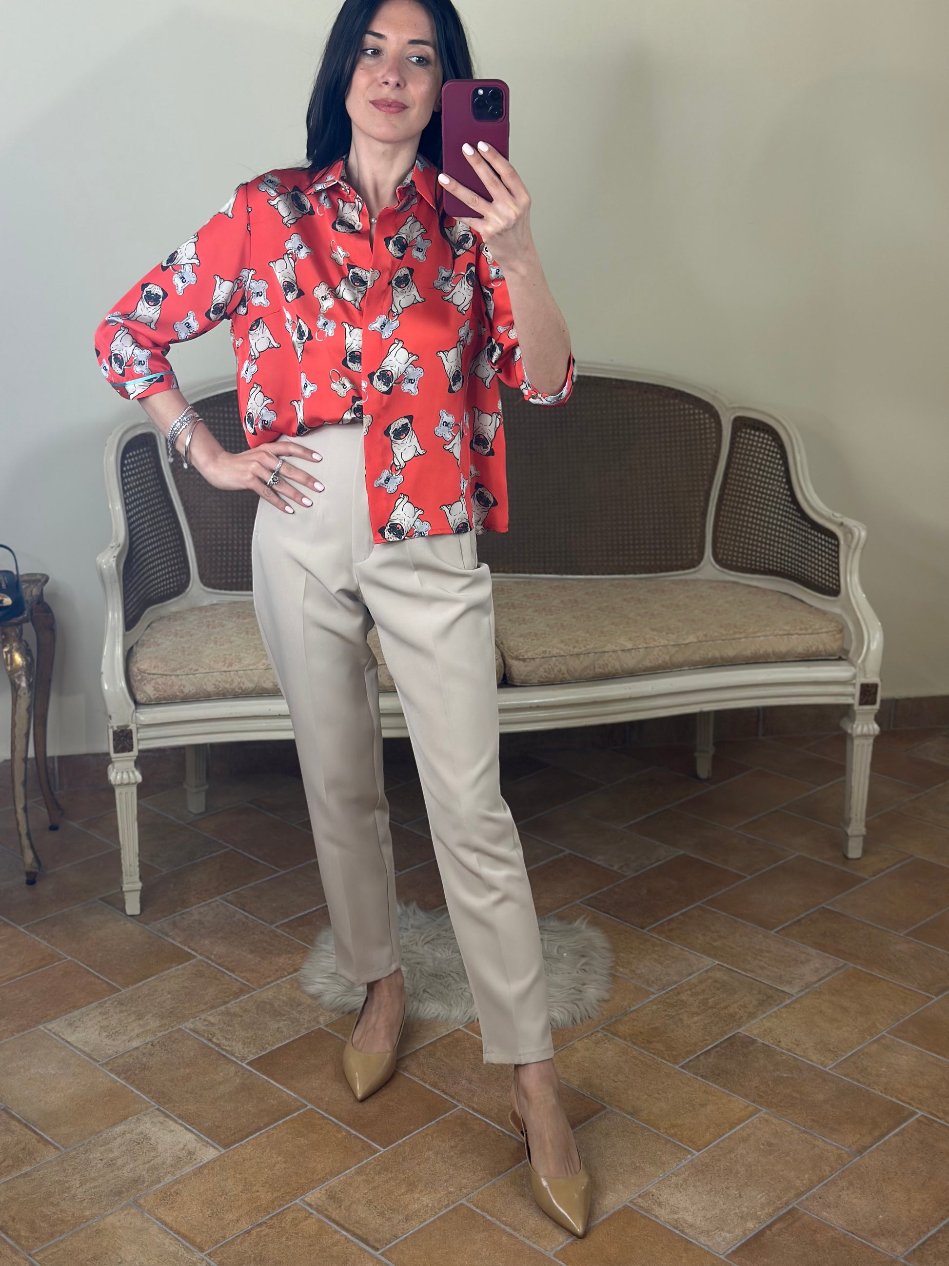 Pantalone vita alta a sigaretta beige, con chiusura zip, tasche cucite laterali a filetto.