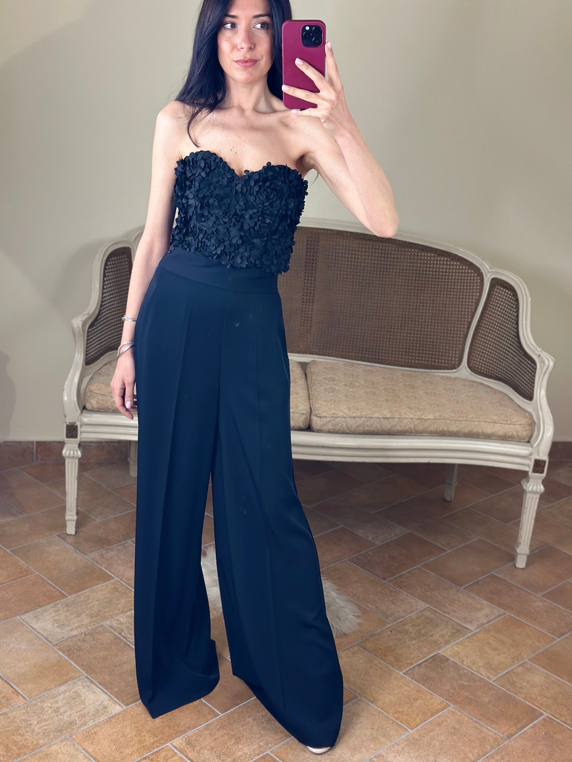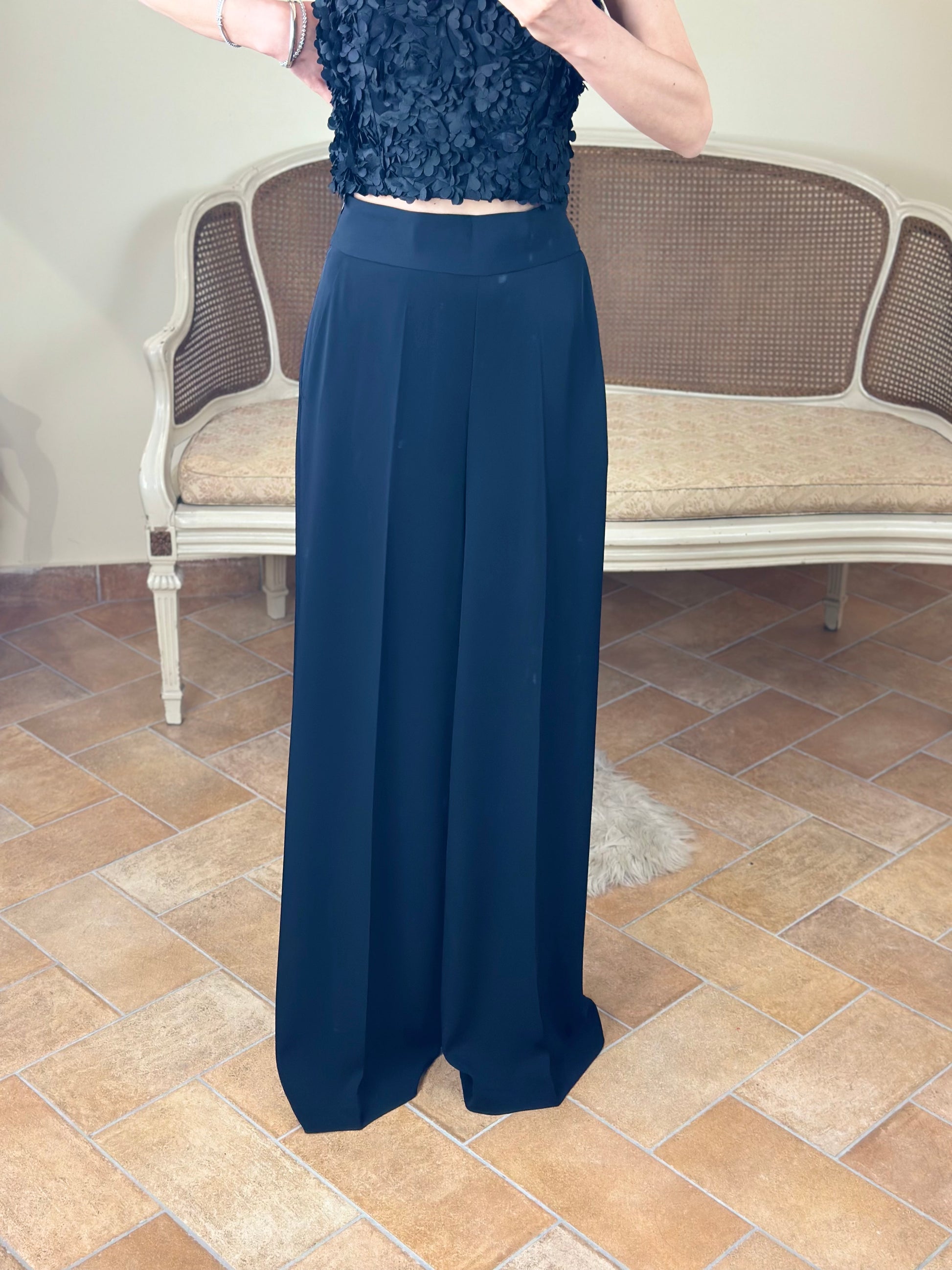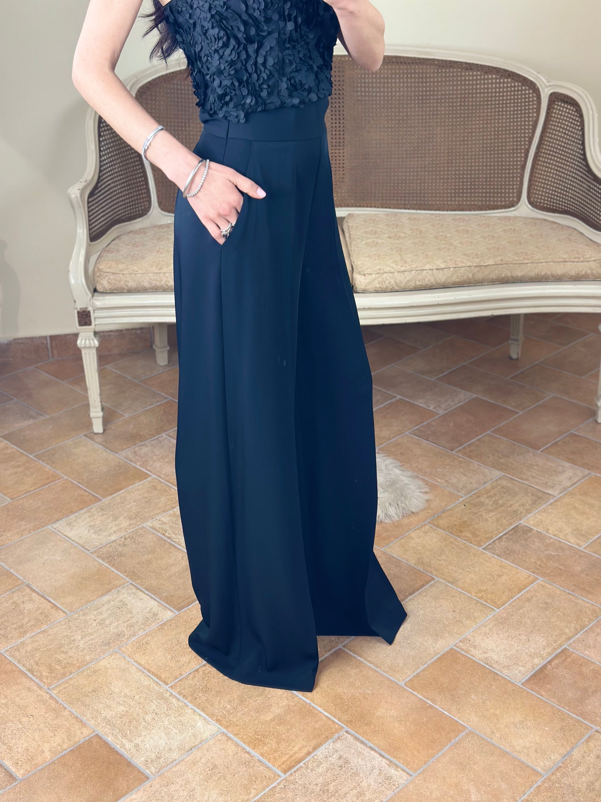 Pantalone color nero, modello a palazzo con vita alta. Chiusura con zip laterale, tasca a filetto.
