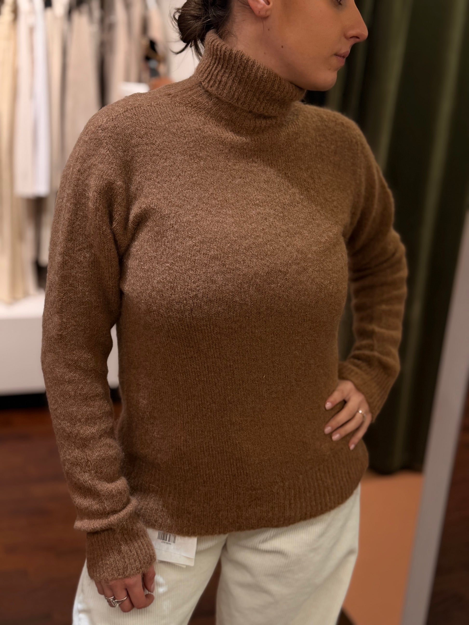 Maglia a collo alto dalla vestibilità slim in morbido misto mohair. Texture leggera e soffice al tatto, finitura elasticizzata. Perfetta come layer sotto giacche o cappotti.
