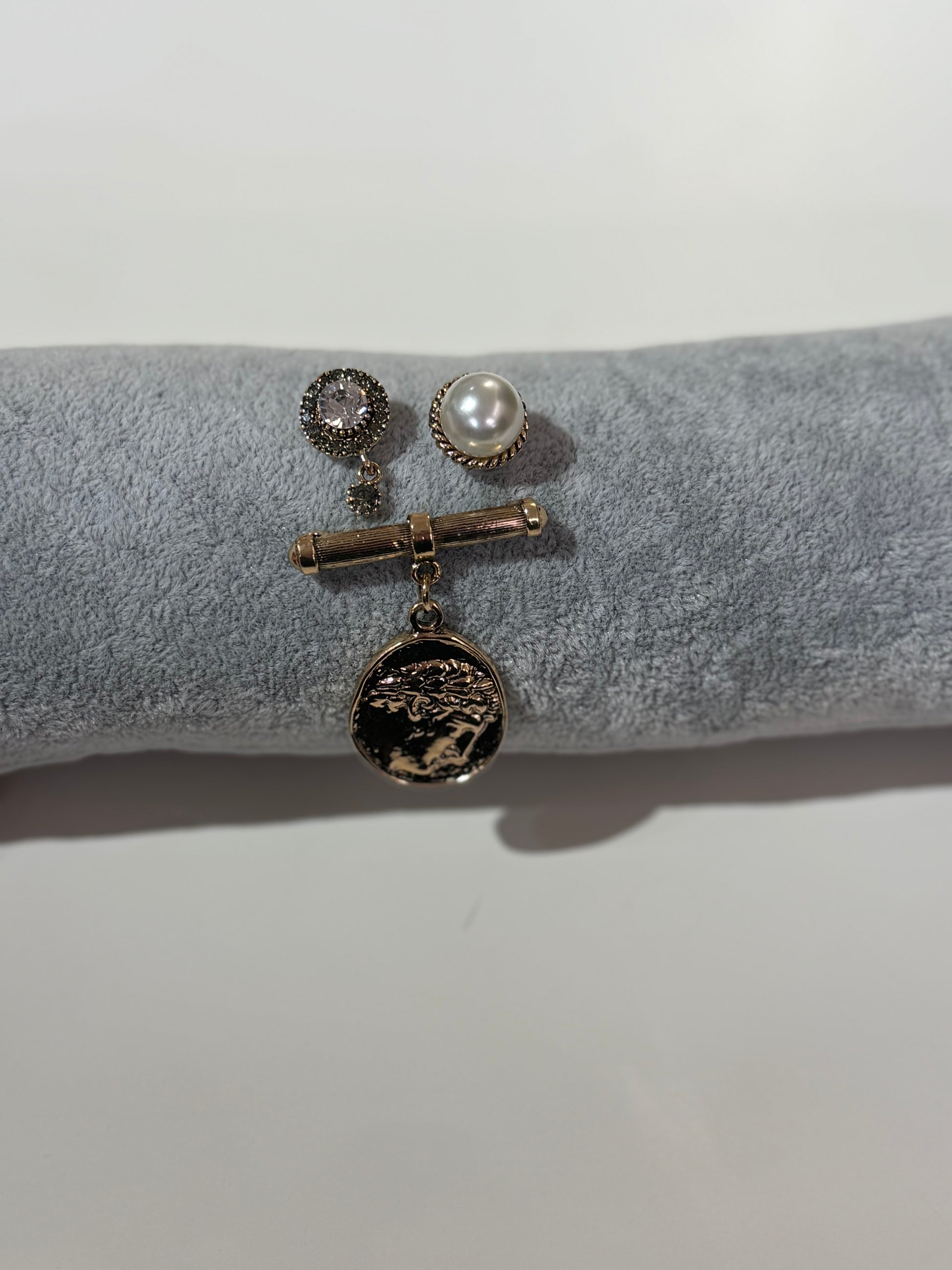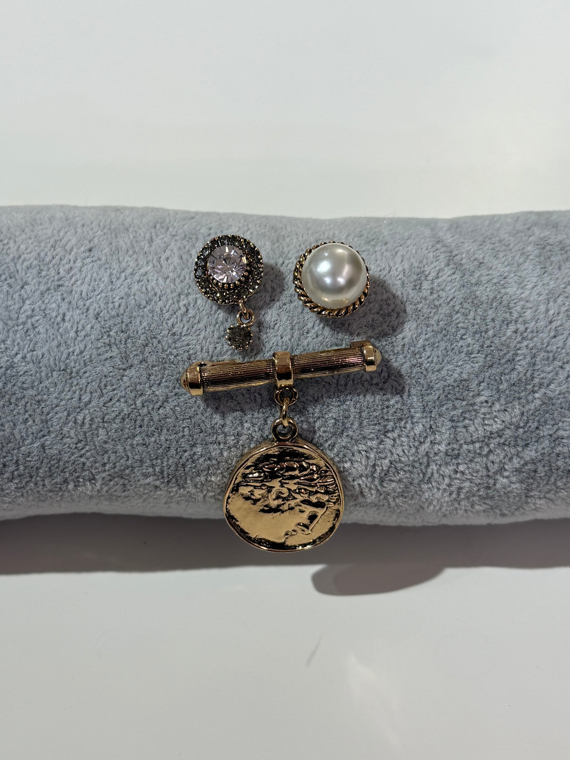 Tris spille con moneta, perla e strass