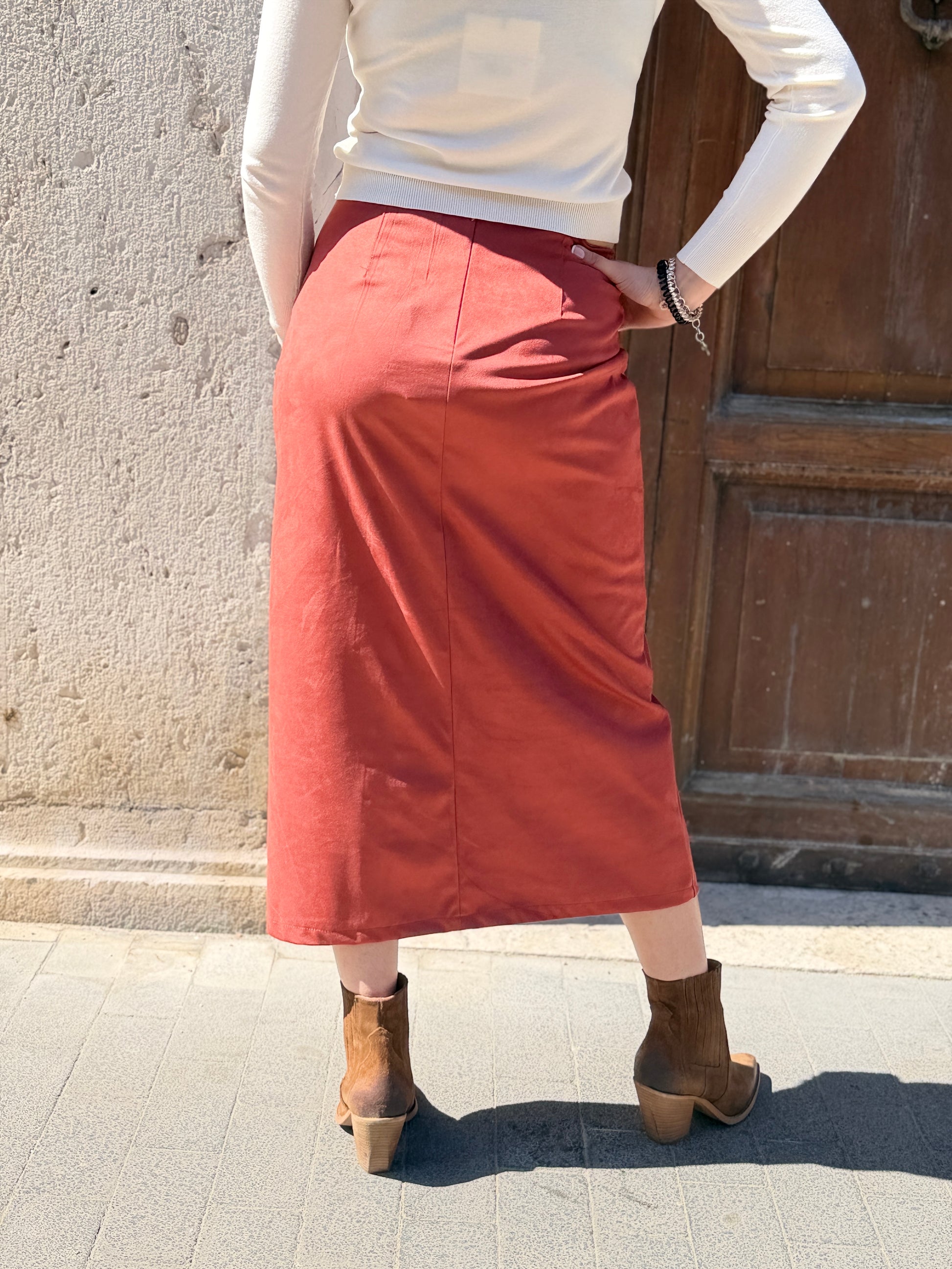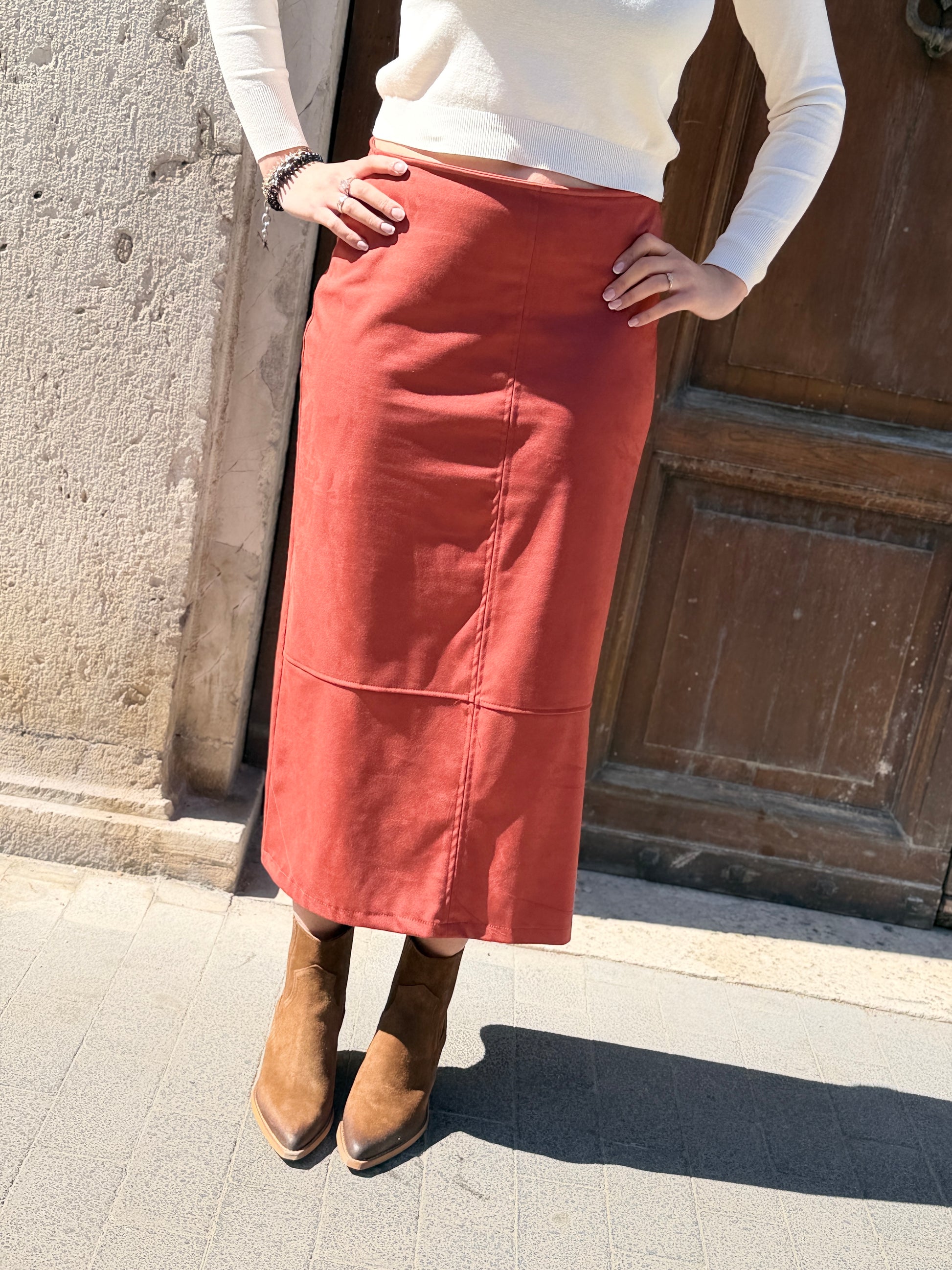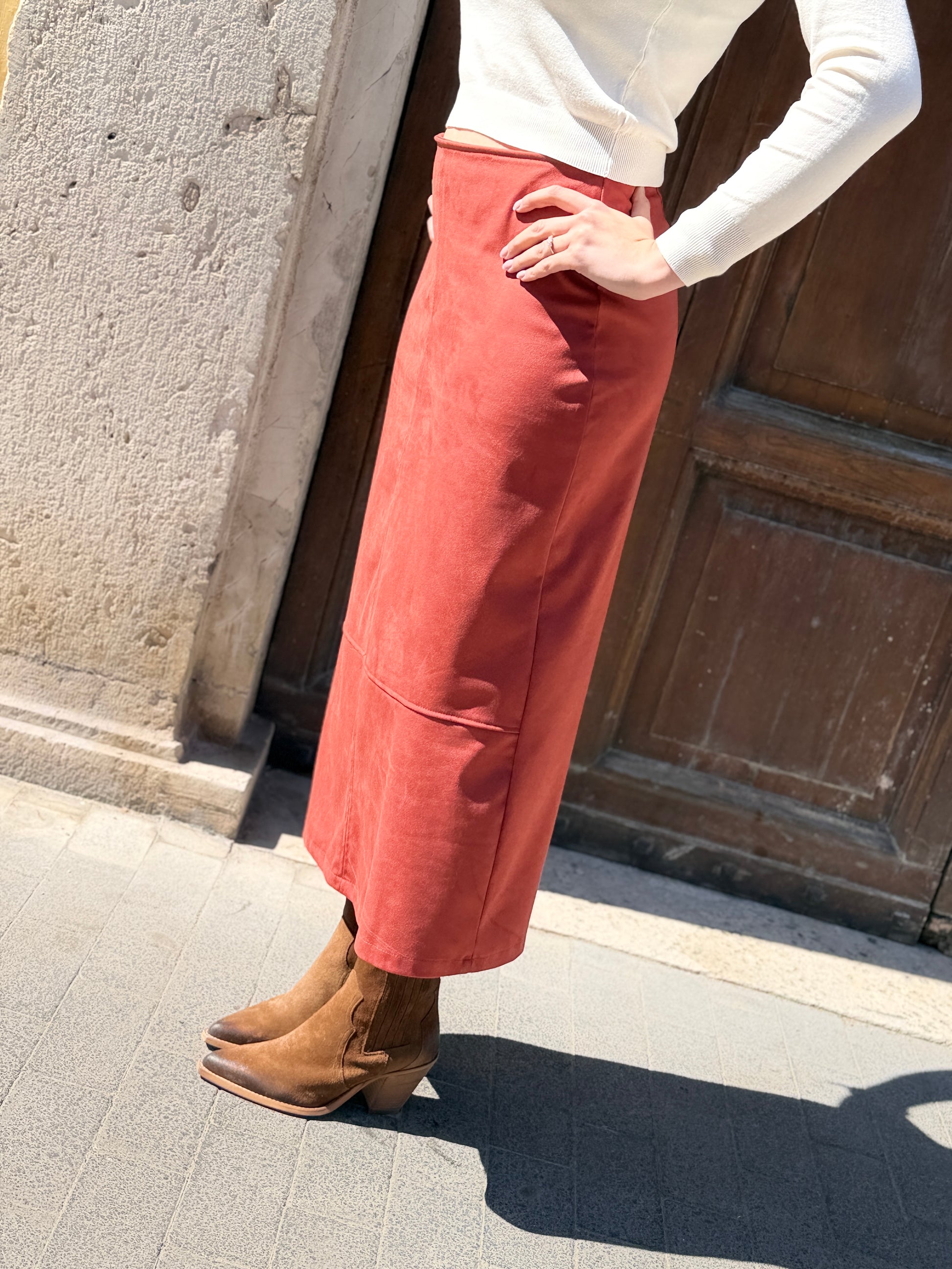 Gonna longuette in Suede, taglio svasato, chiusura con cerniera nascosta nella cucitura.