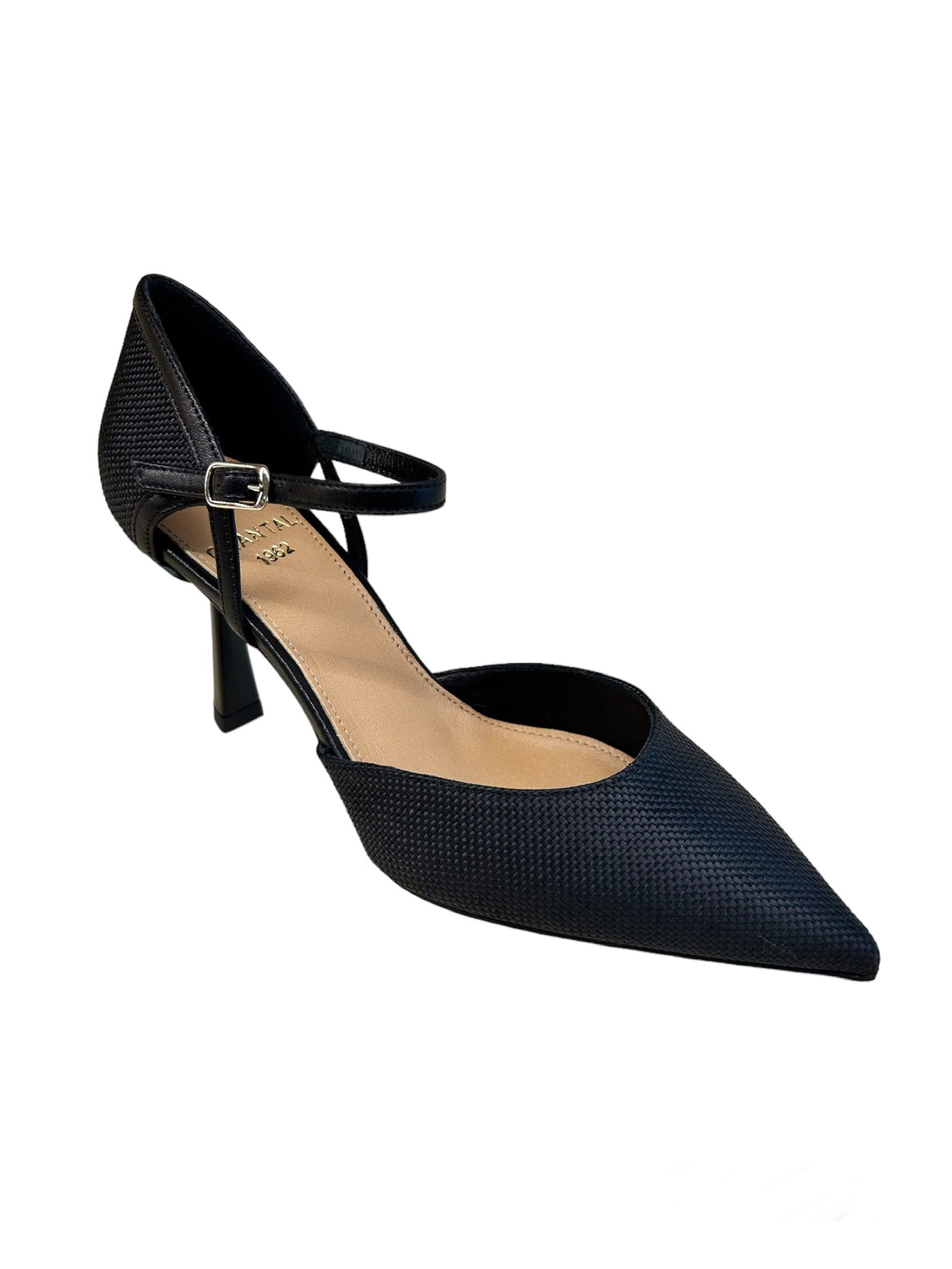 Spezzata in pelle e raffia, cinturino regolabile, sottopiede in pelle, tacco 70 mm.