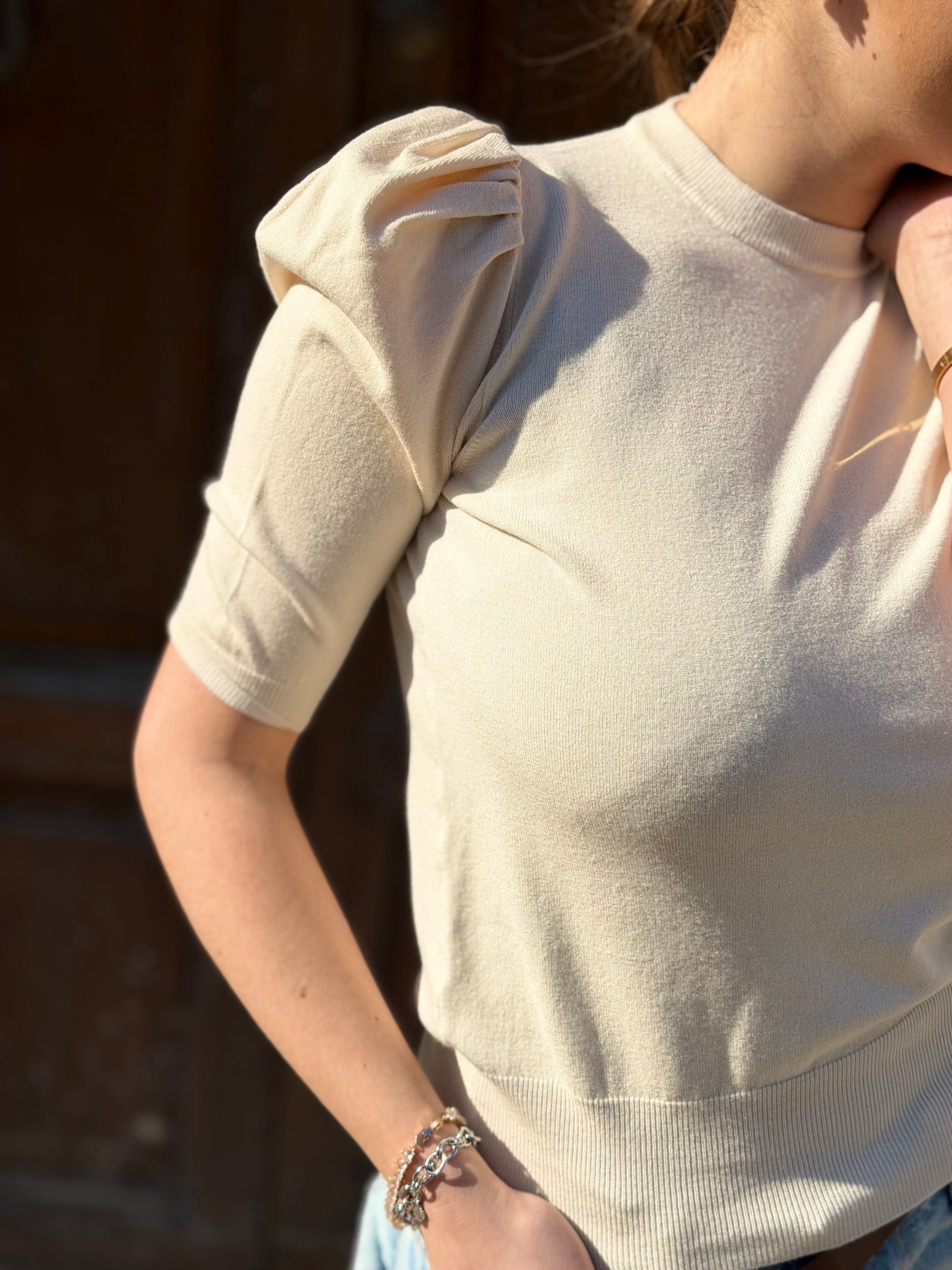 Maglia girocollo con manica corta a sbuffo.