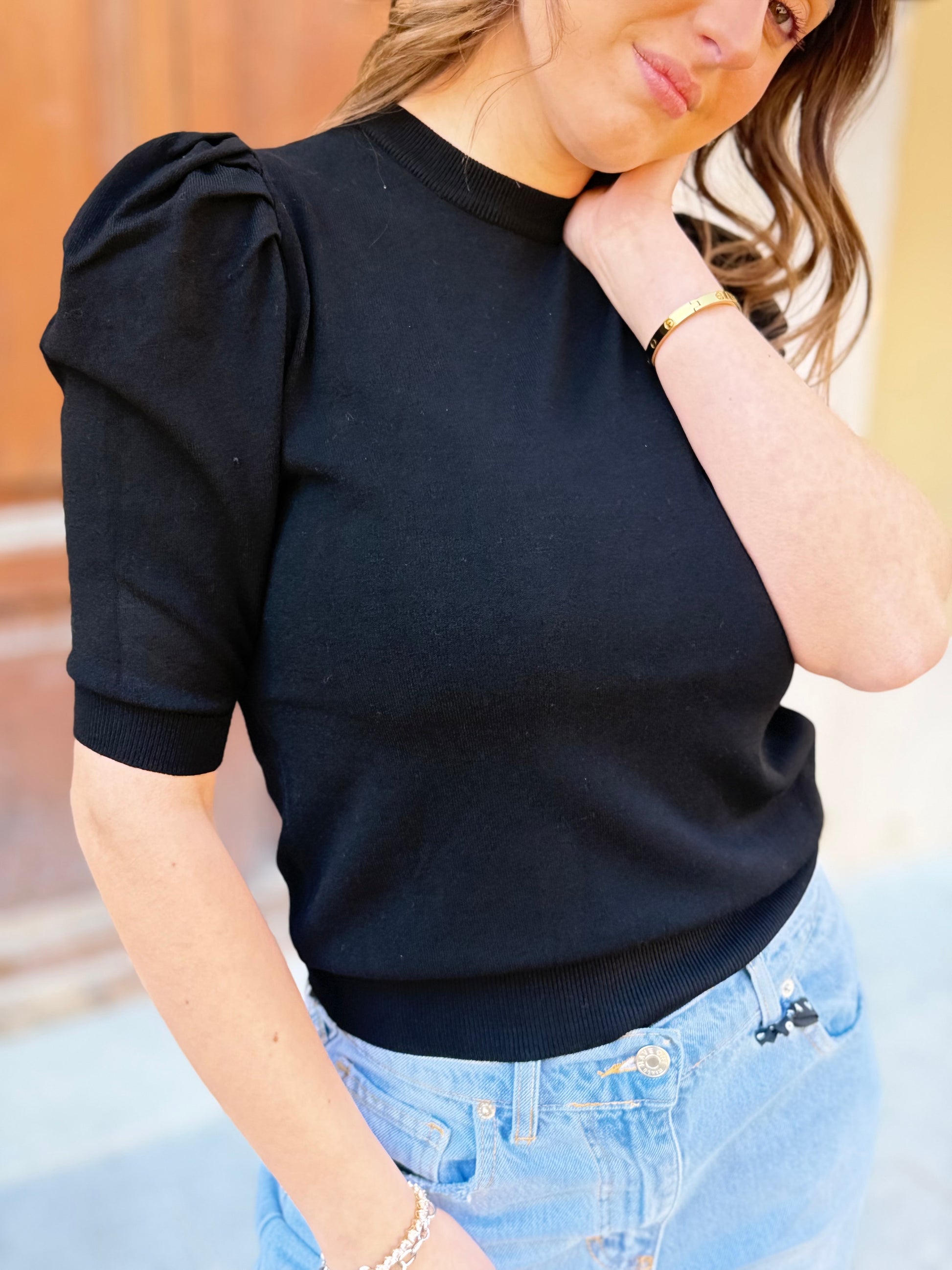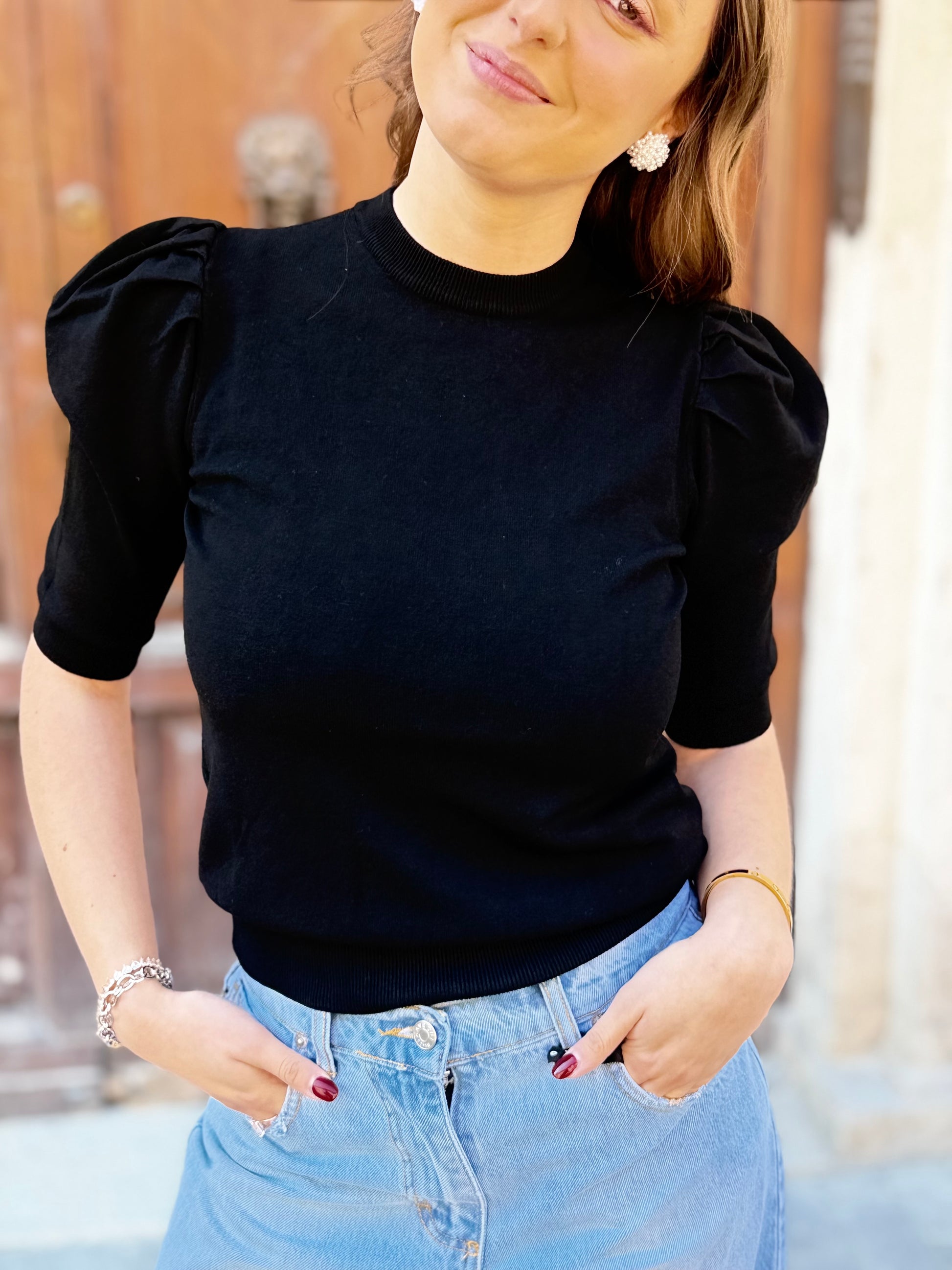 Maglia girocollo con manica corta a sbuffo.