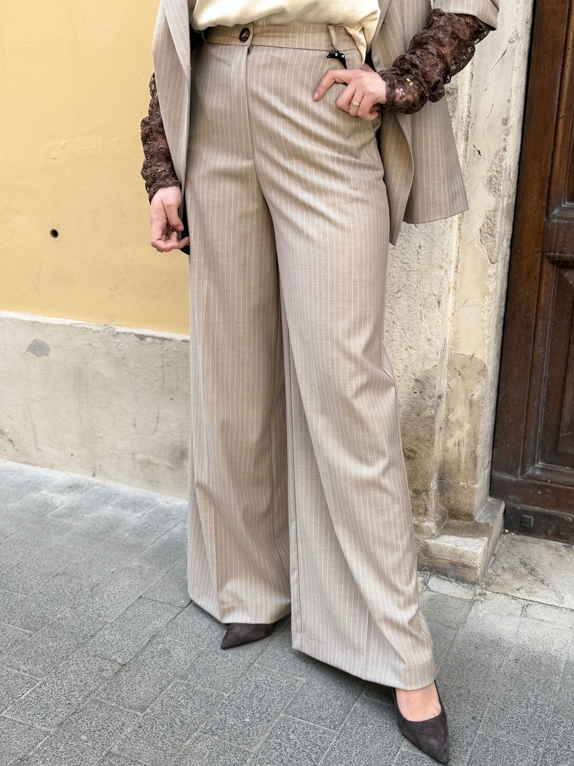 Pantalone a palazzo fluido gessato, chiusura con zip e bottone, passanti in vita e tasche a filetto.