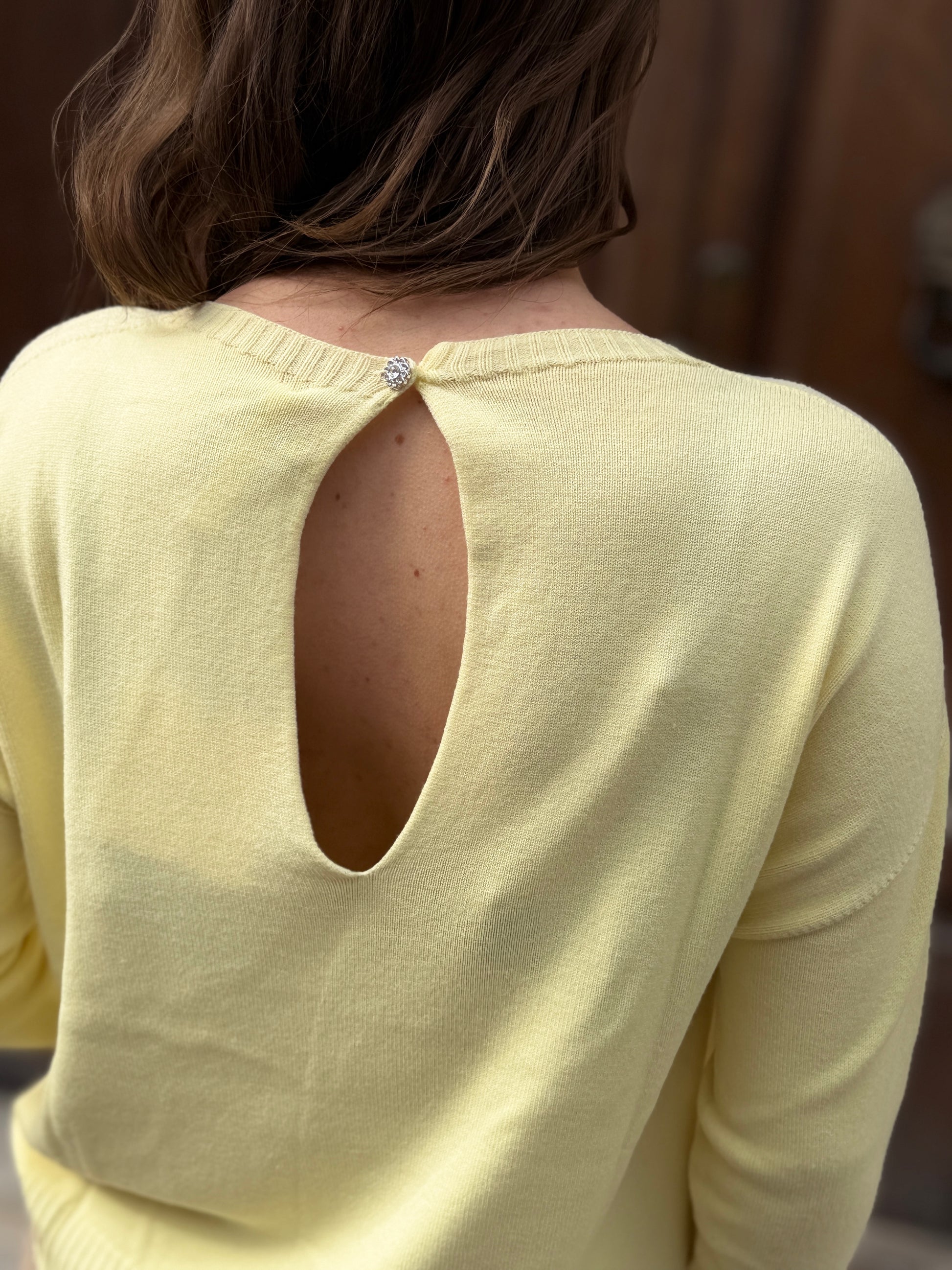 Maglia girocollo manica lunga, allacciatura con bottoncino gioiello posteriore.