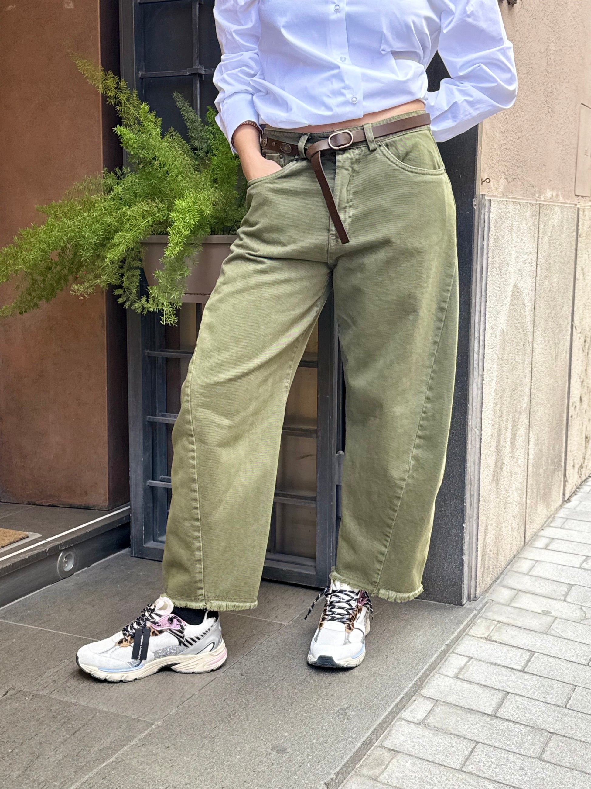 Pantalone gamba ampia e leggermente svasata (barrel) valorizzata da un fondo sfrangiato che dona un tocco di personalità e movimento. Cintura in ecopelle variante moro con borchie applicate in dotazione.