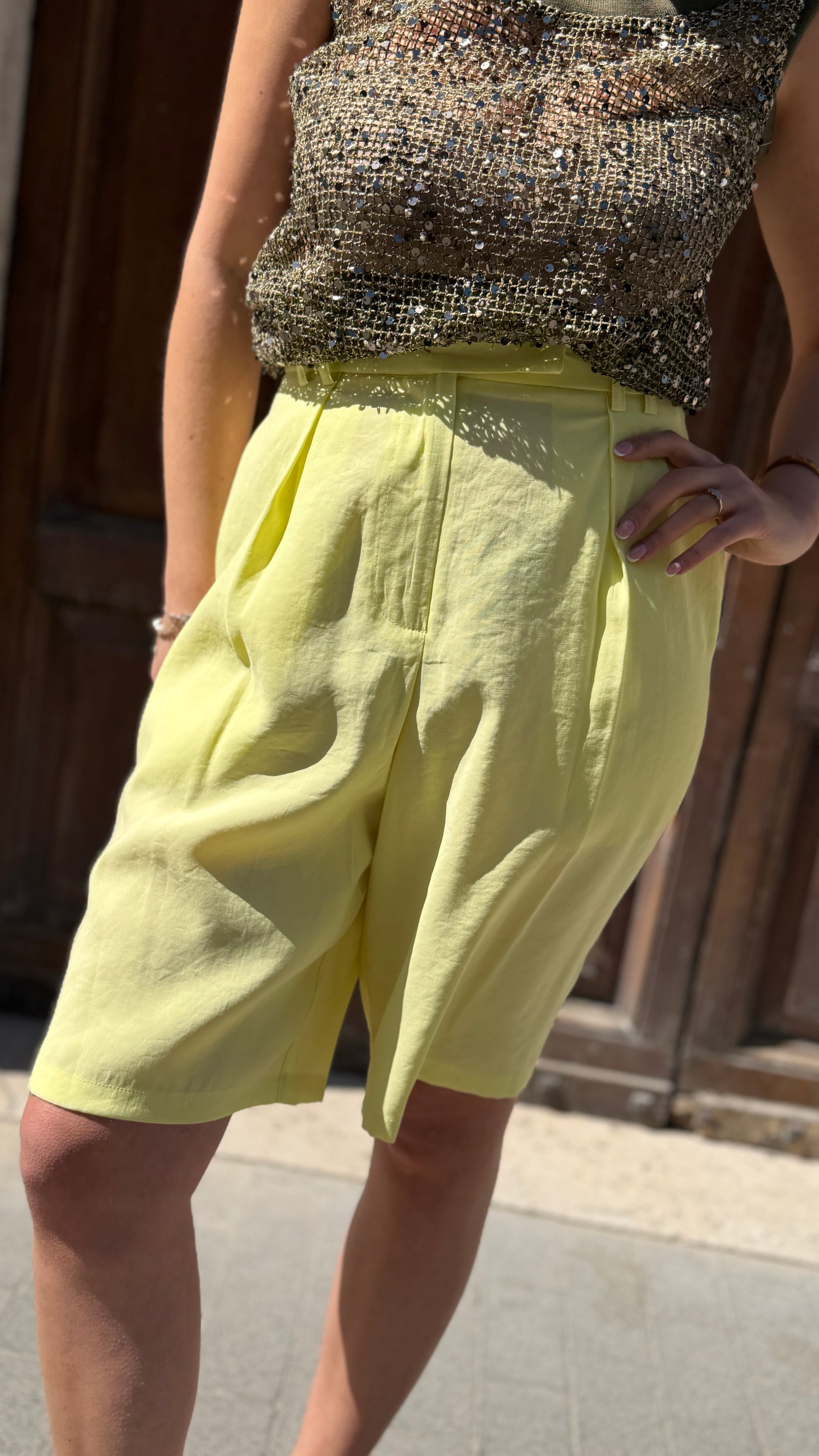 Bermuda in viscosa con pences, cinta fissa in vita con passanti, chiusura con zip a scomparsa.