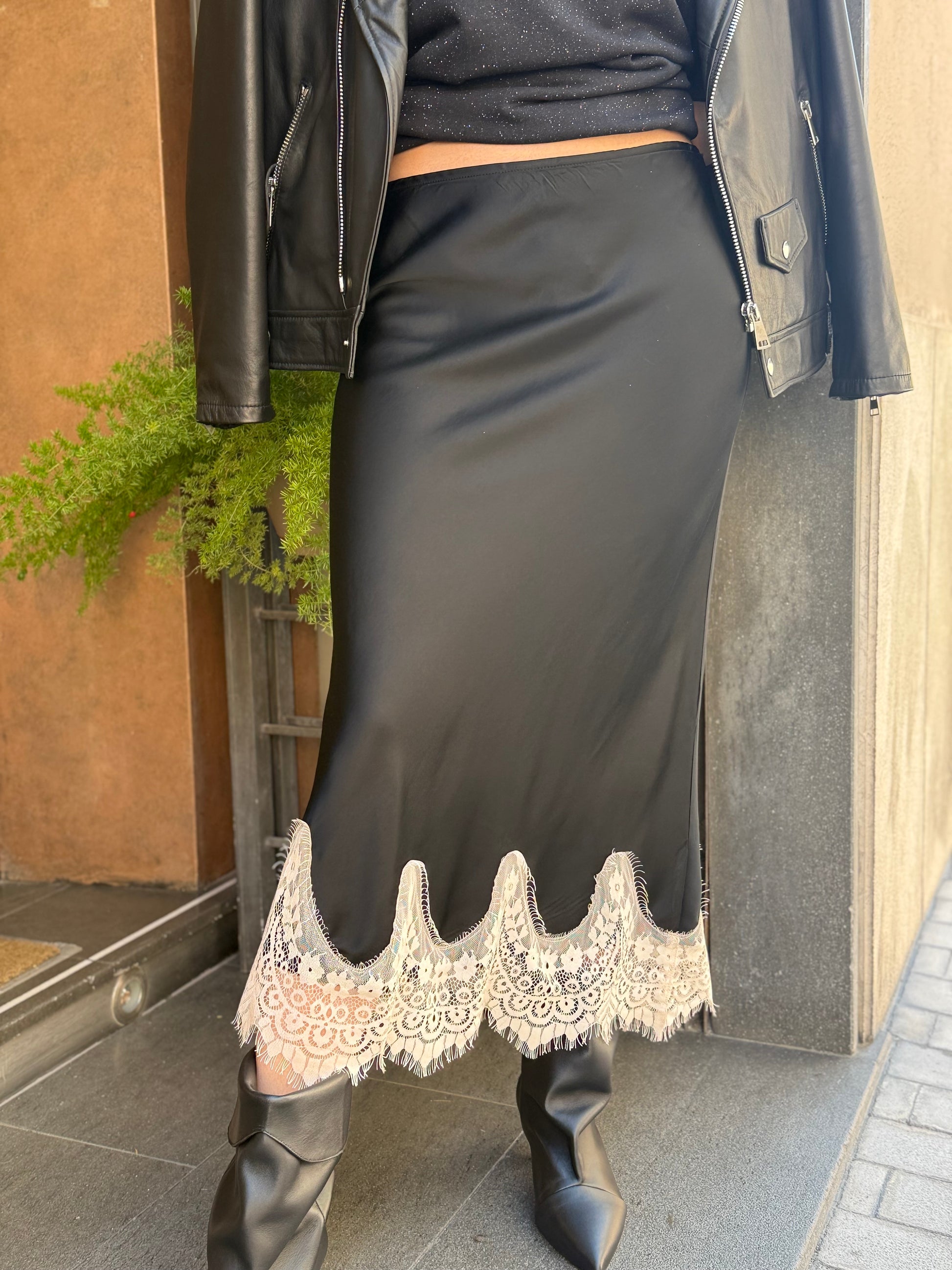 Gonna lingerie lunga variante nera con pizzo burro nel fondo, elasticizzata in vita.