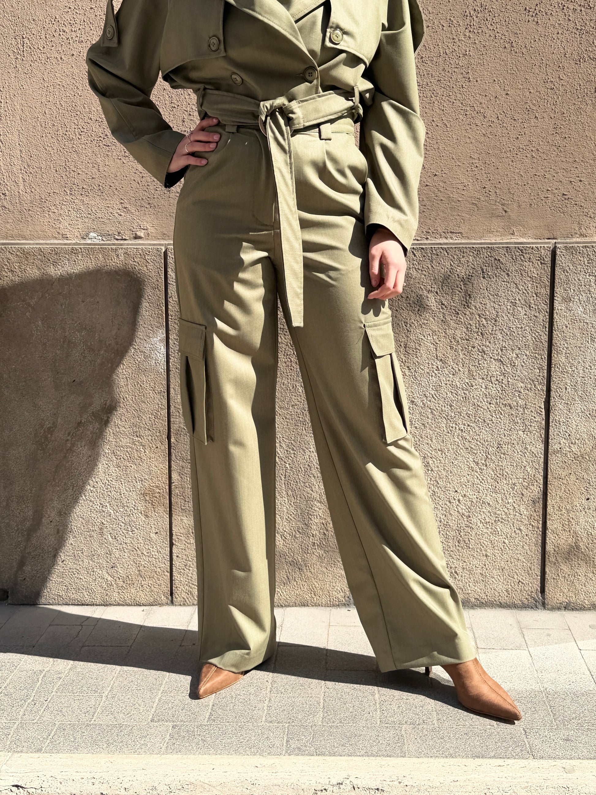 Pantalone cargo con tasconi, cinta fissa in vita con passanti.