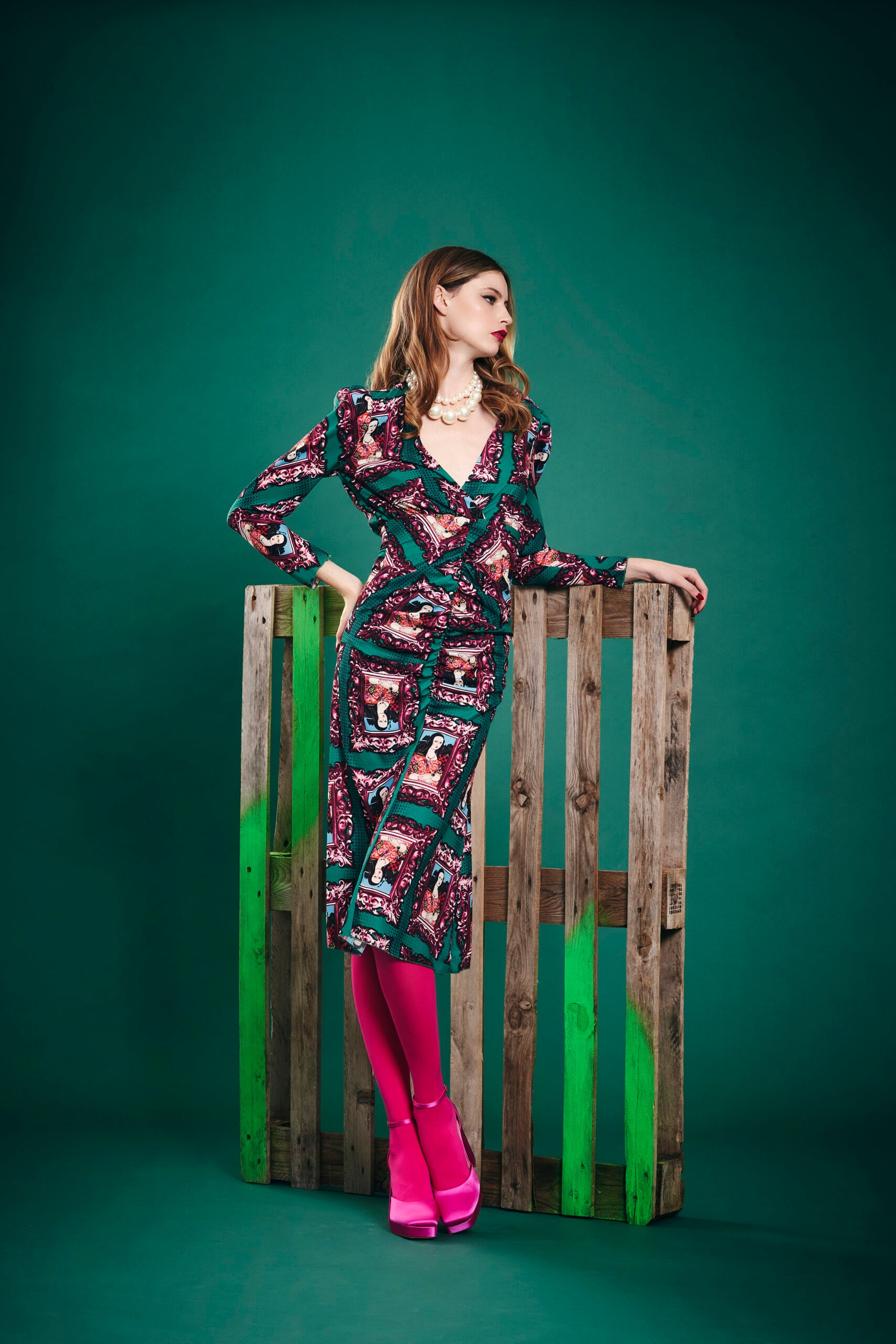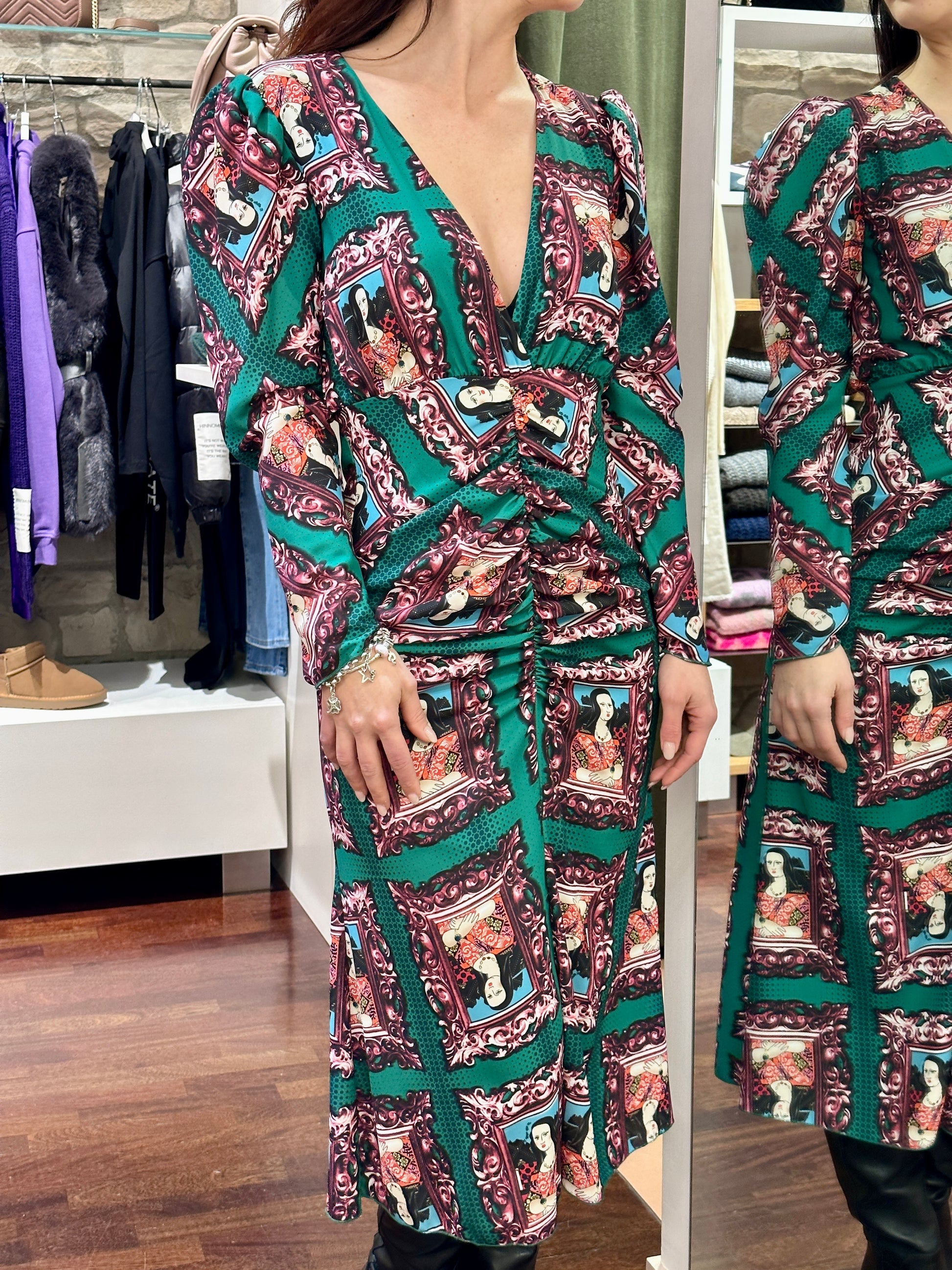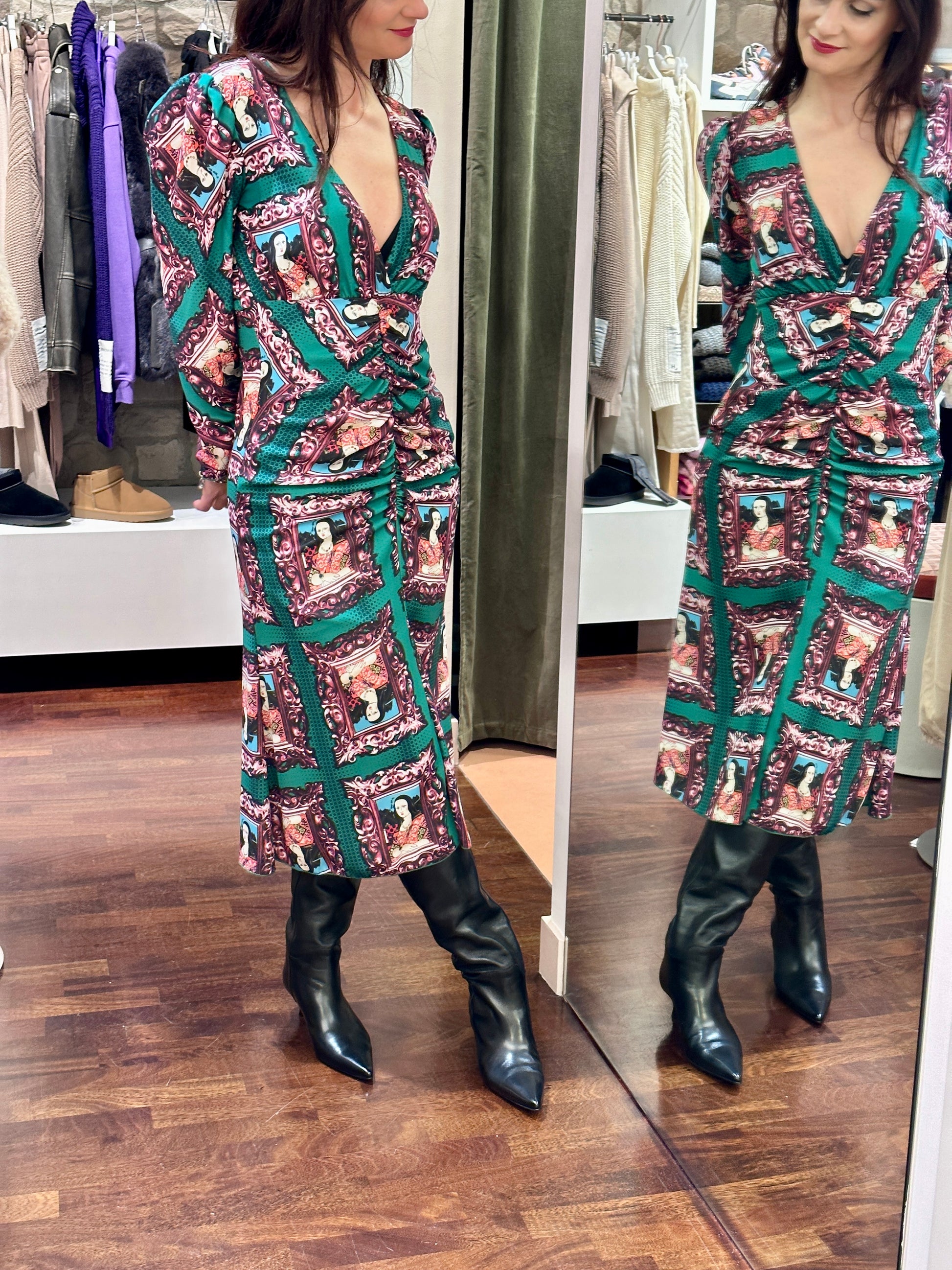 Abito midi con arricciatura e scollo a V.