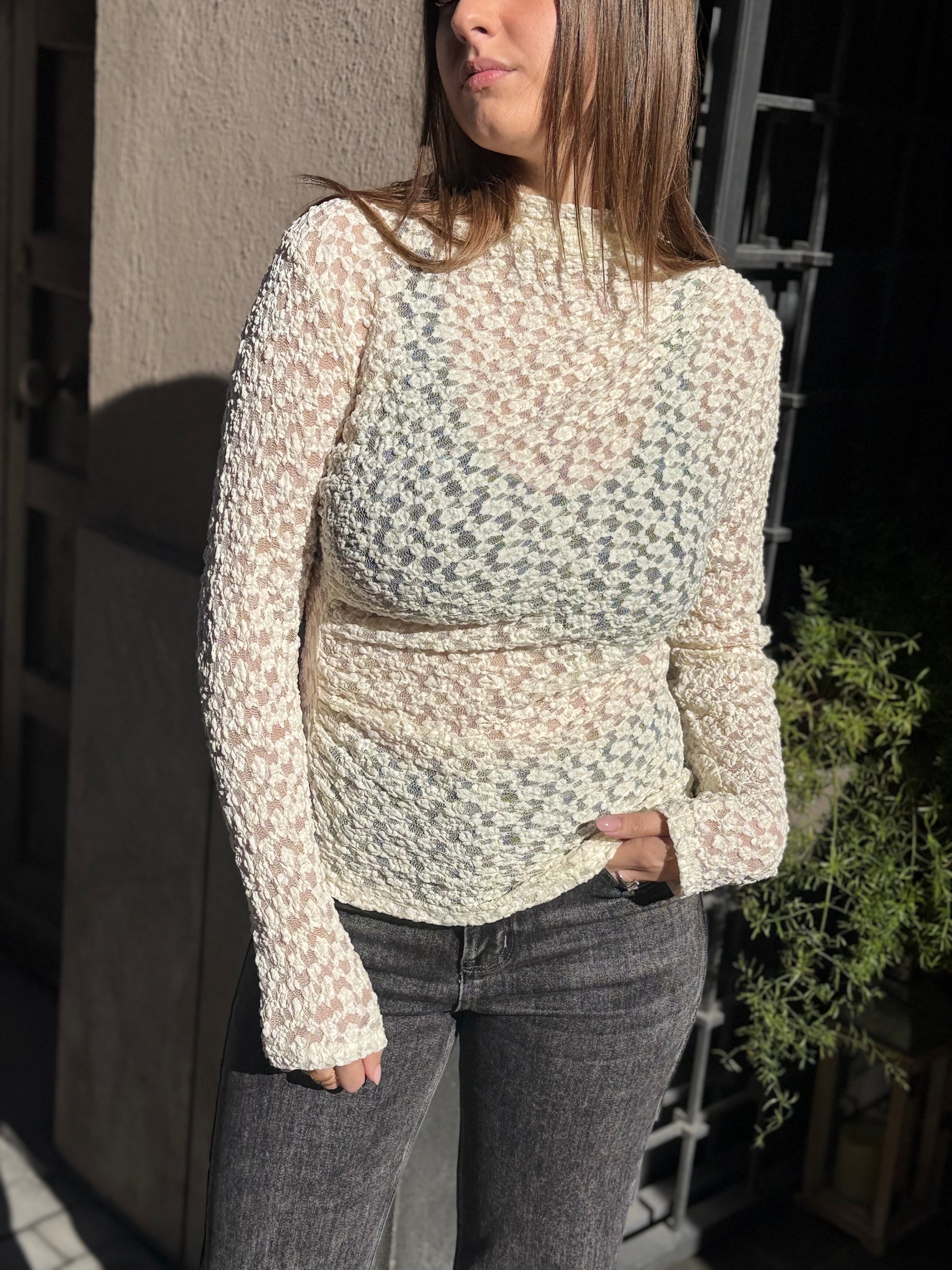 Maglia in pizzo variante panna, con doppio drappeggio sul fianco e sulla spalla.