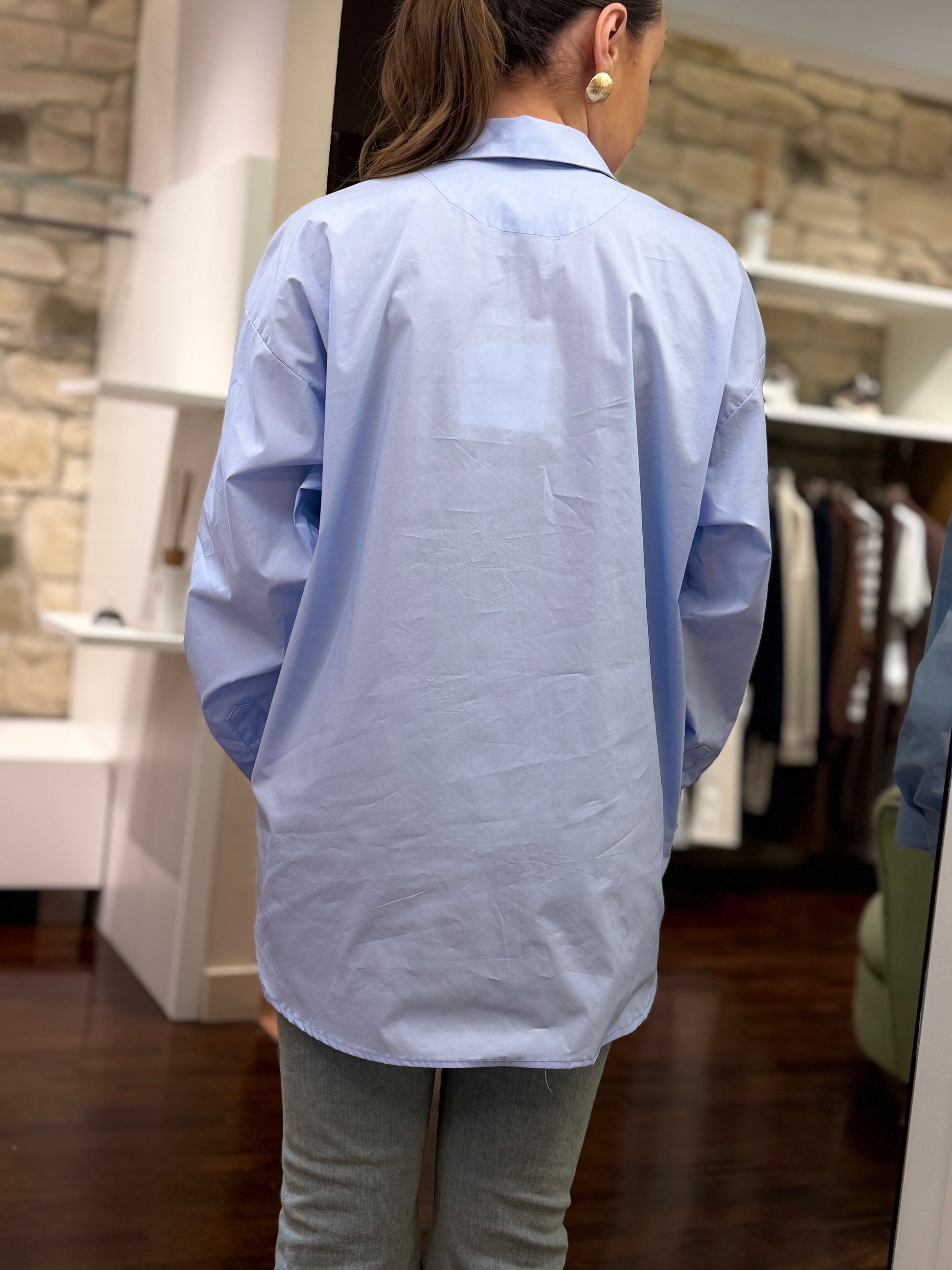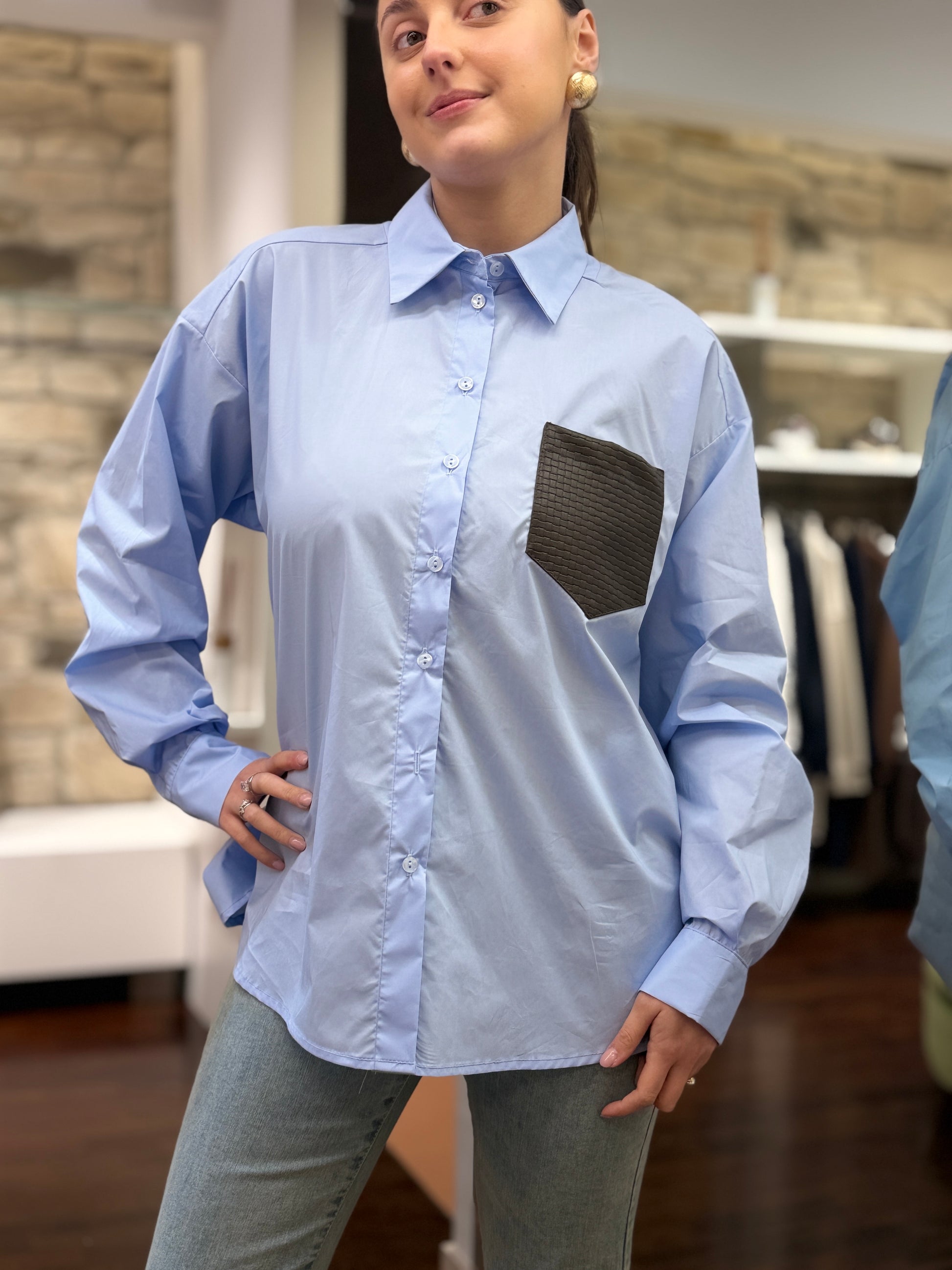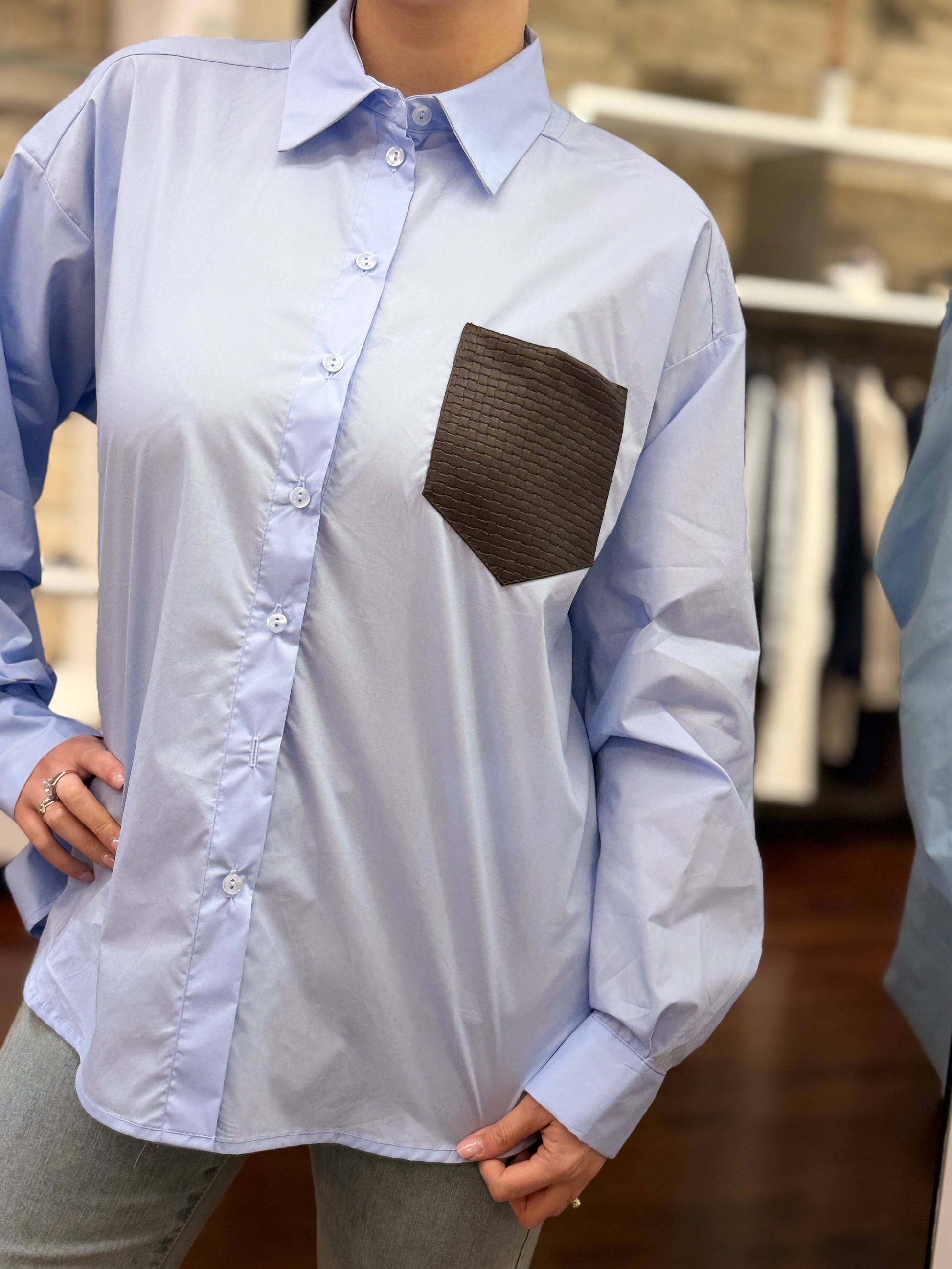 camicia over, taschino in ecopelle intrecciata, collo classico.