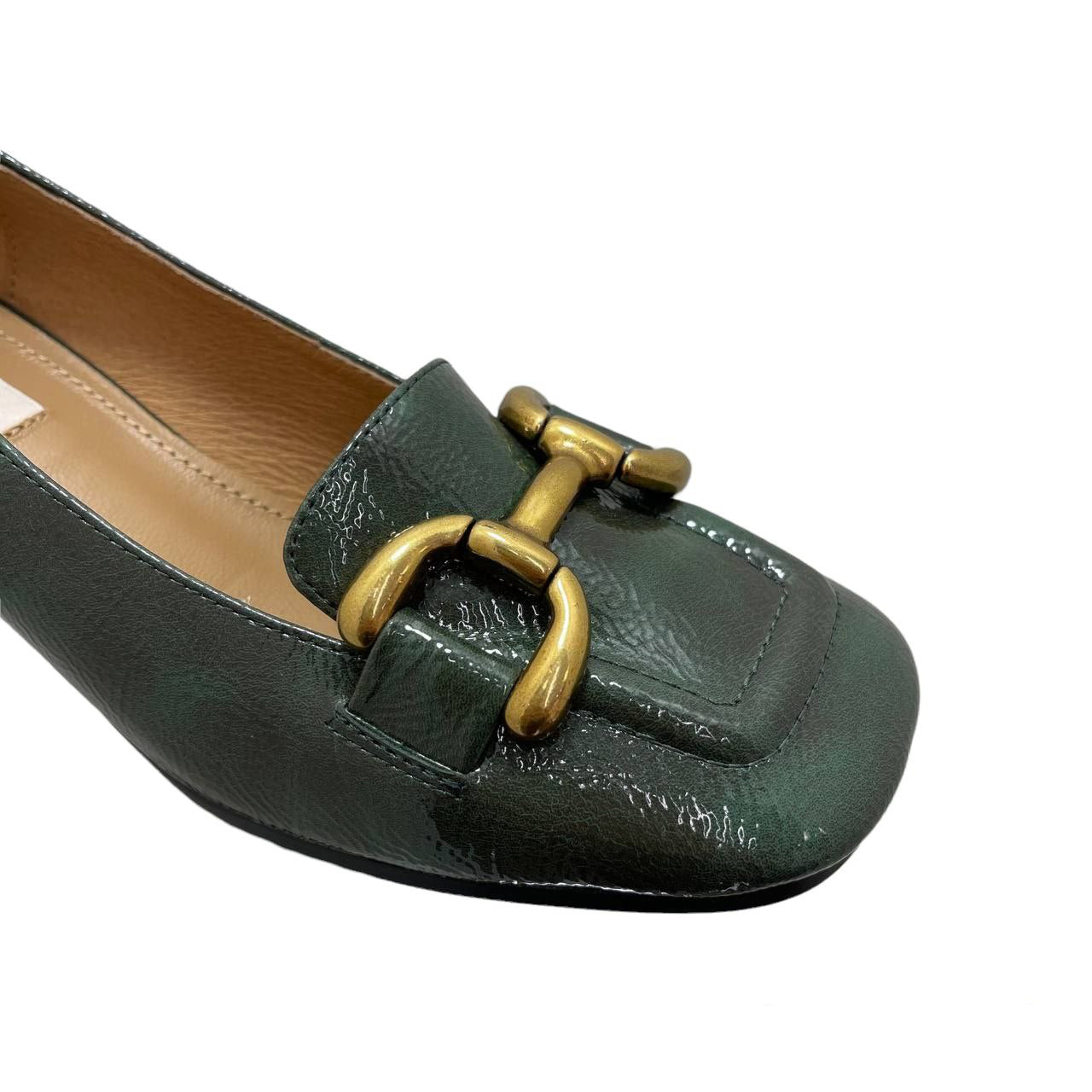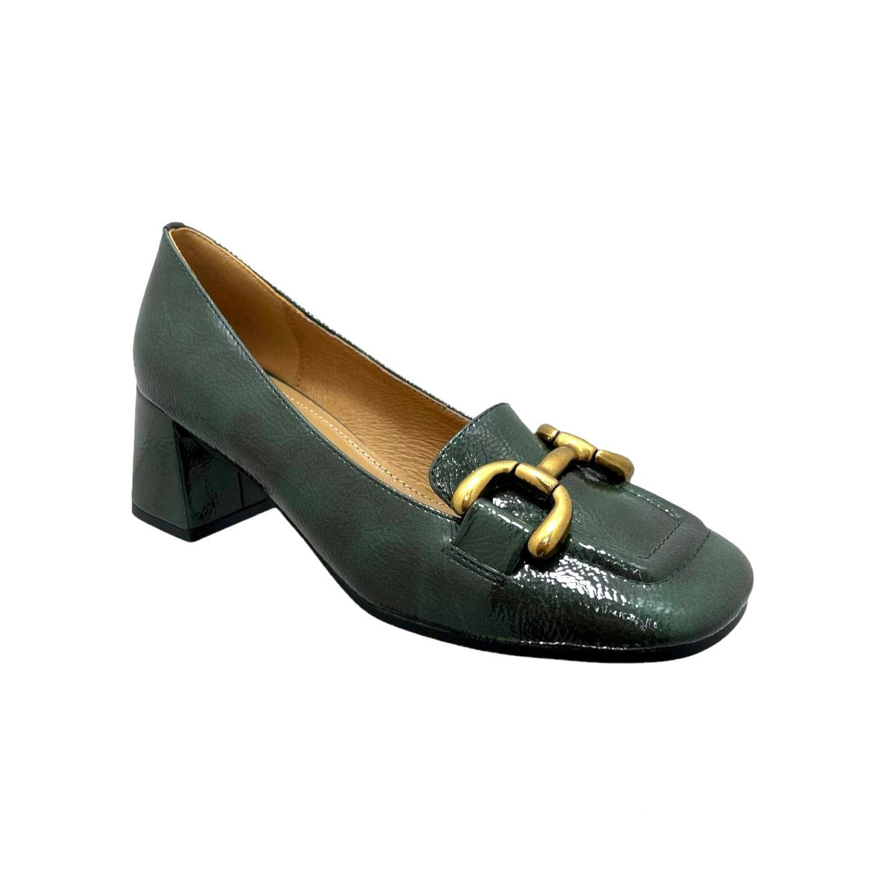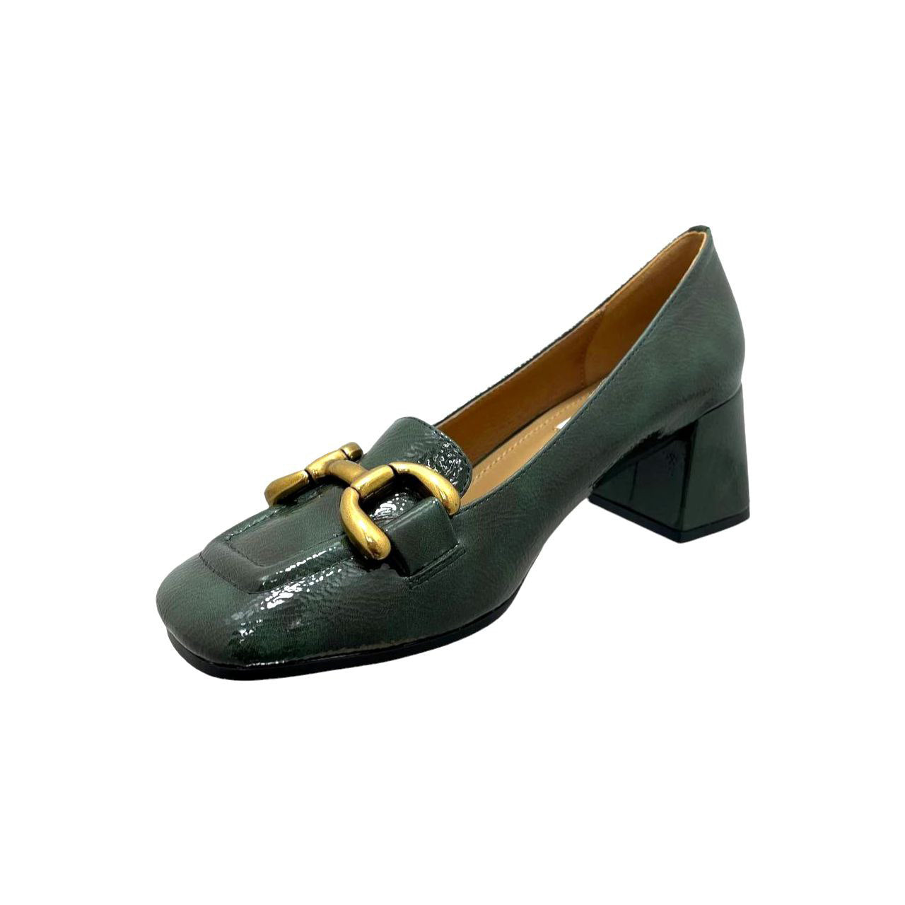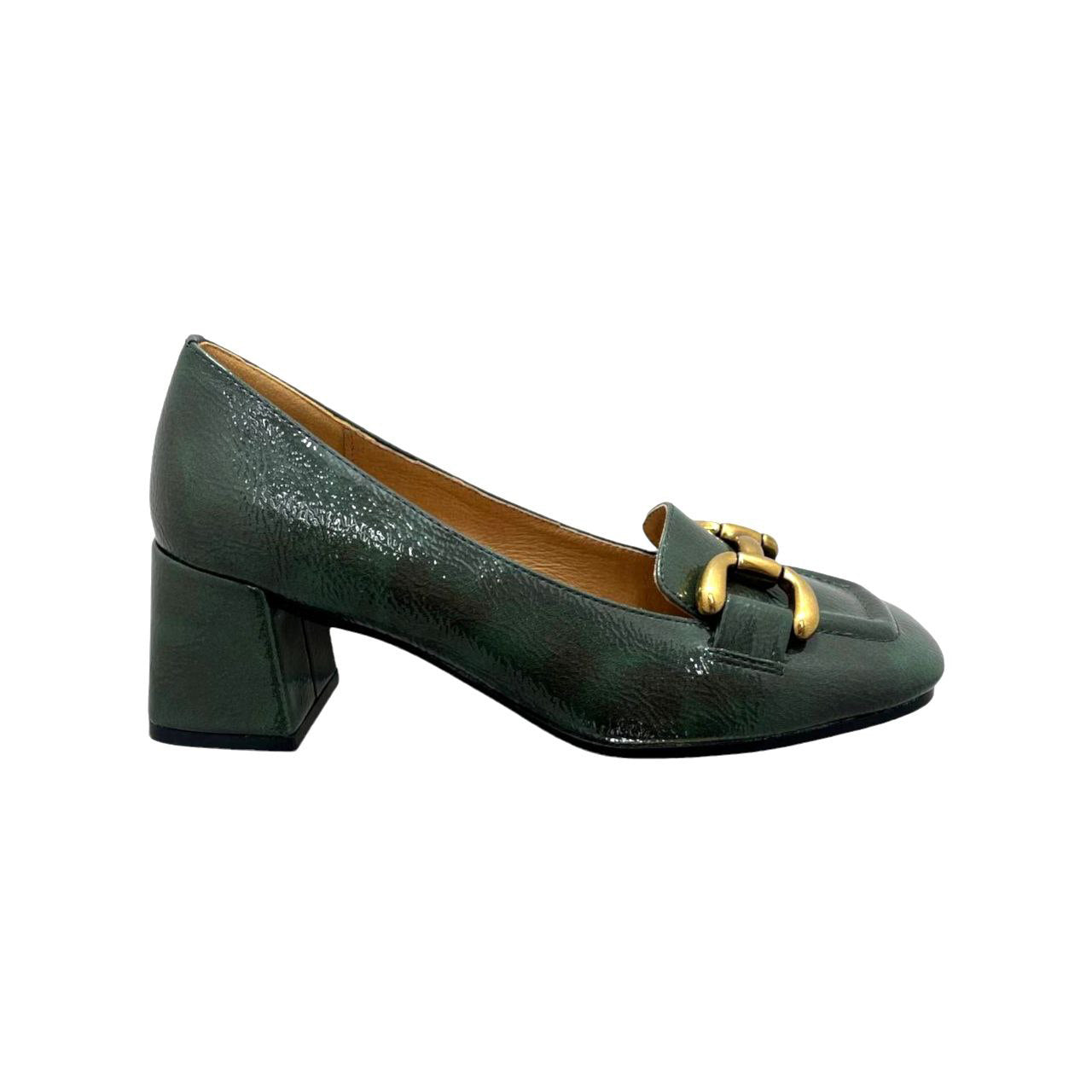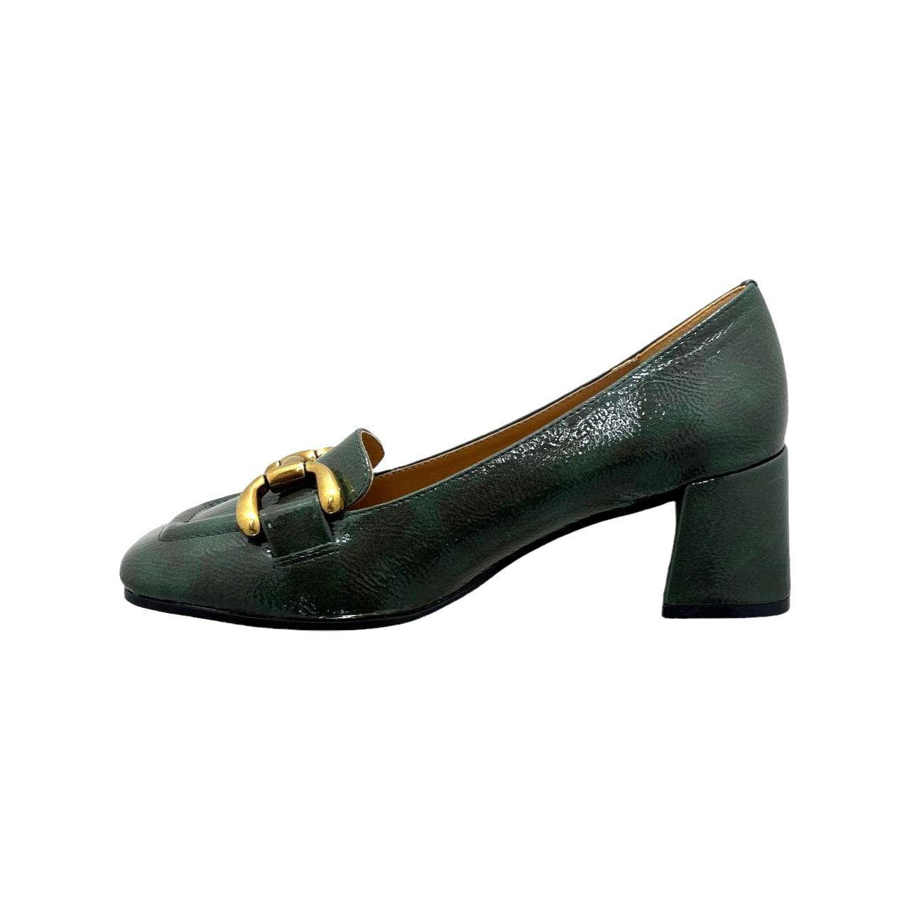 Décolleté in naplak con moschettone dalla finitura dorata, punta quadra, tacco largo 60mm, sottopiede in pelle, suola in gomma e tunit.