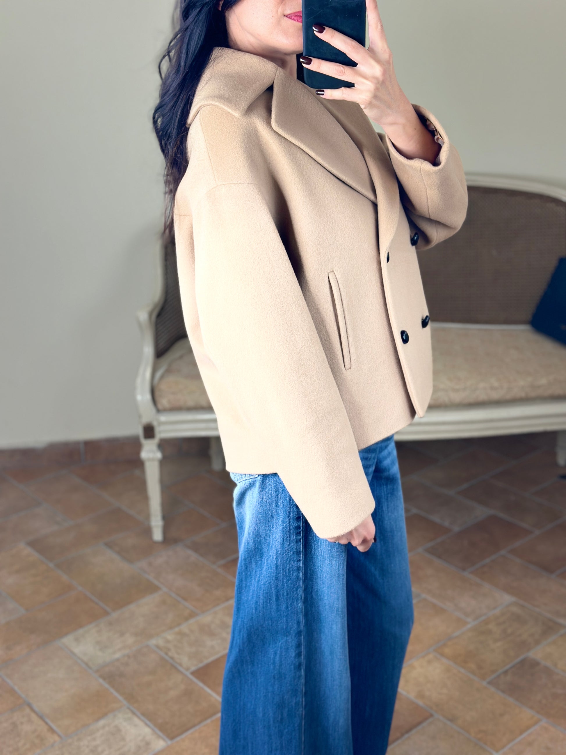 Cappotto sartoriale corto, 90% lana vergine, fodera interna 100% viscosa, doppio petto con ampie reverse, spalla stondata, tasche laterali.
