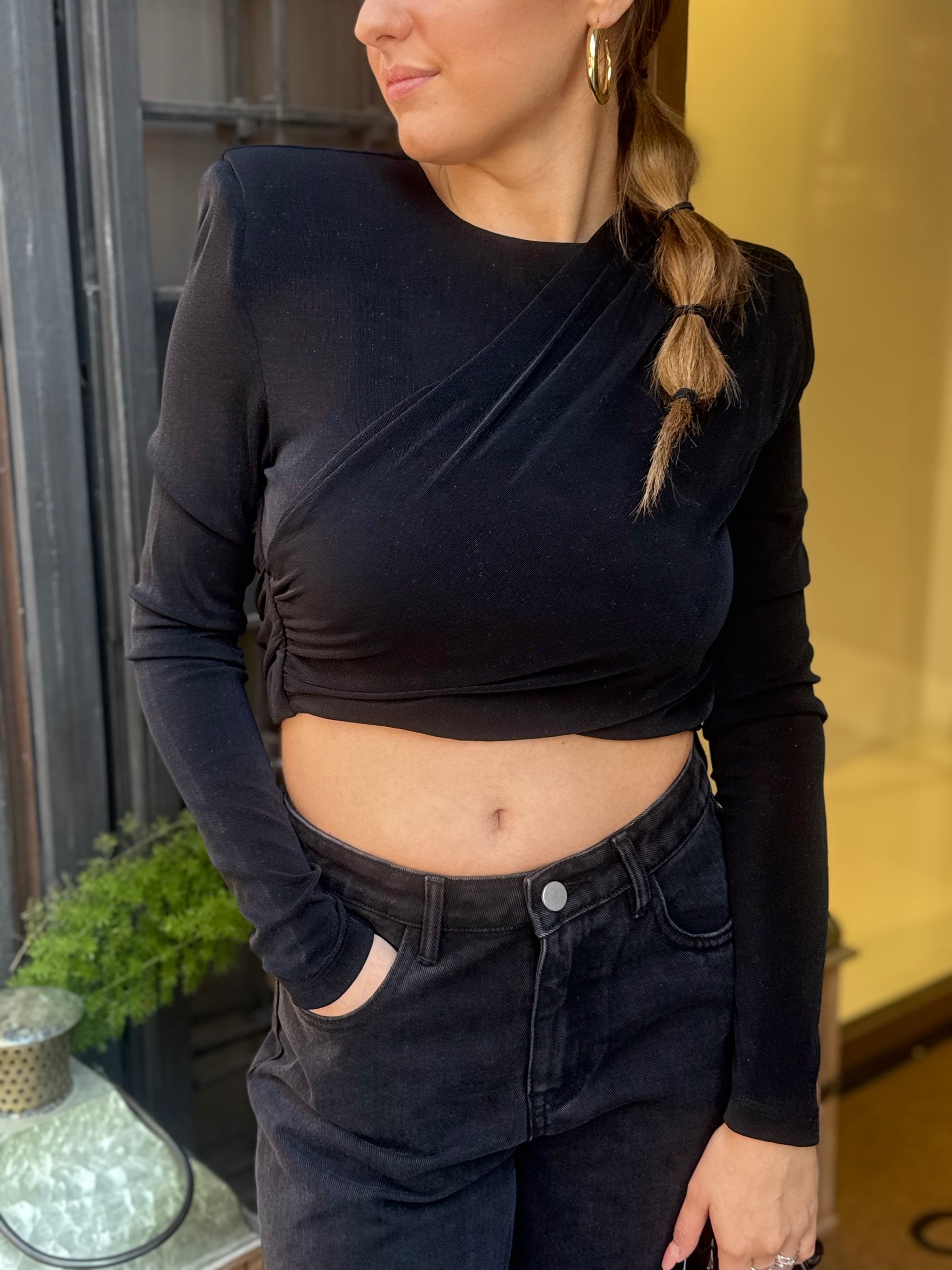 Top crop manica lunga in jersey lurex unica variante colore nero, drappeggio laterale e arriccio posteriore.