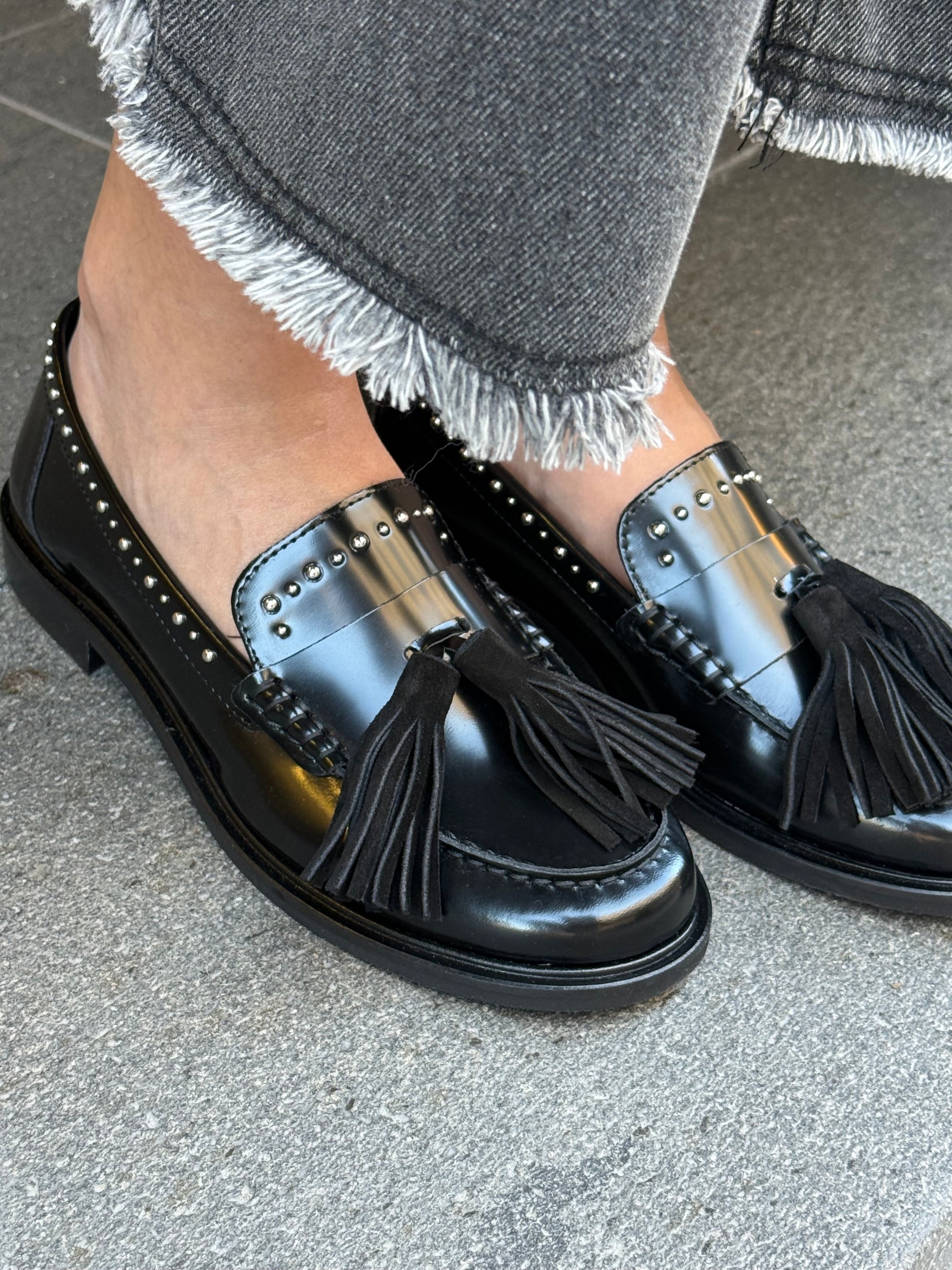 Mocassino in pelle nero, sottopiede in pelle, con borchie e nappine