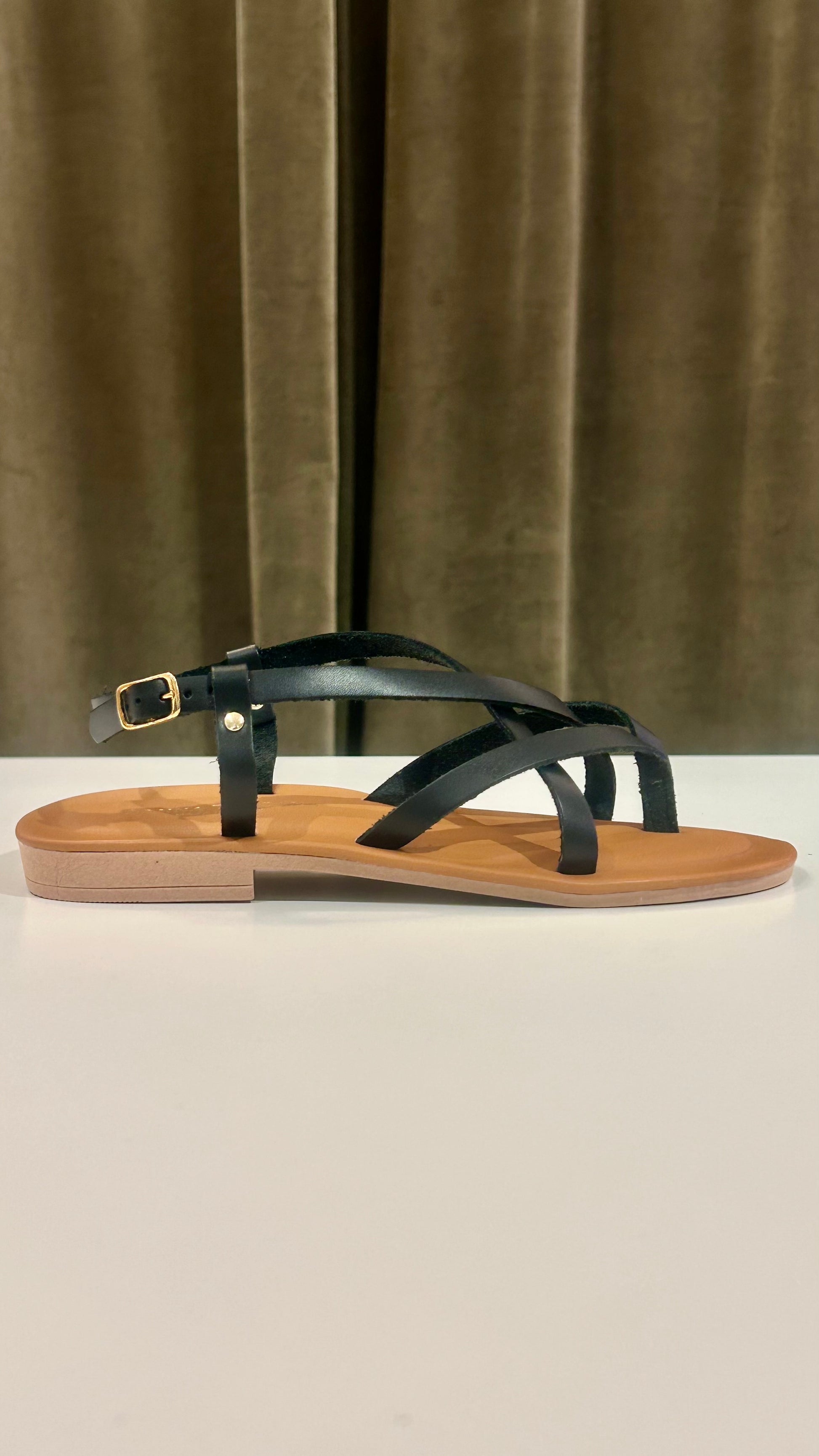 Infradito flat con incrocio nero in vera pelle, cinturino con fibbia regolabile, sottopiede imbottito in pelle, fondo in gomma, MADE IN ITALY.