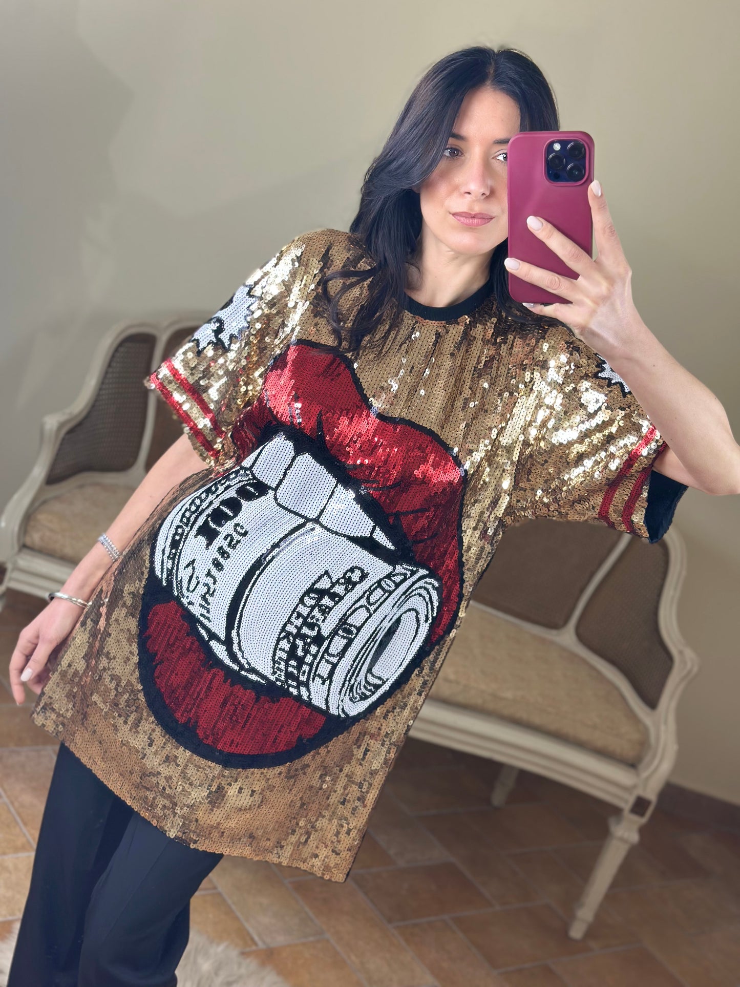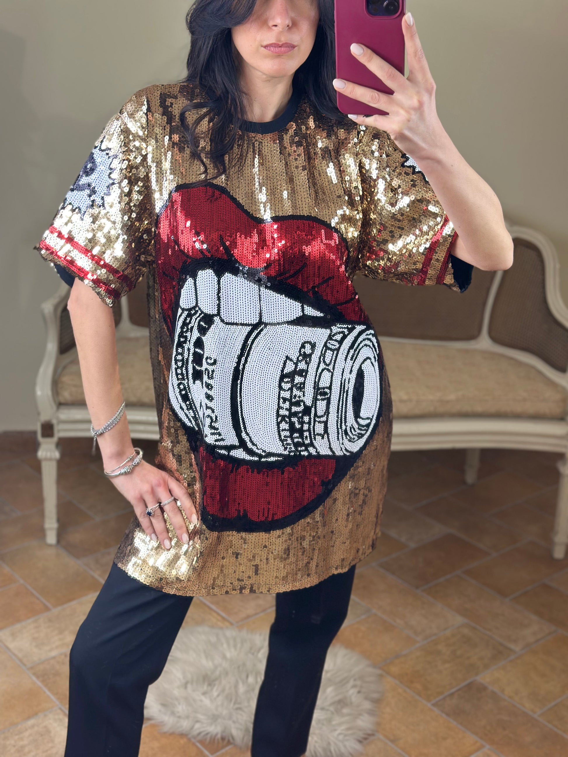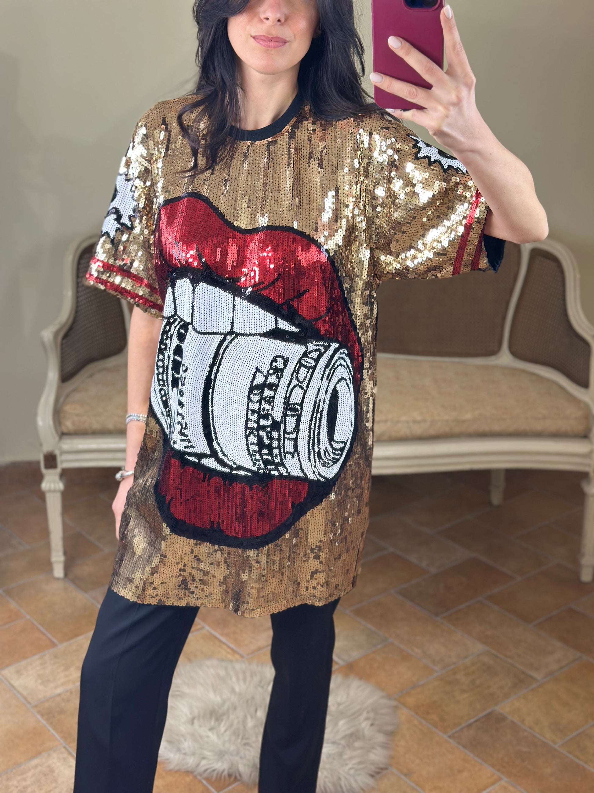 Maxi maglia/abito girocollo a manica corta, ricoperta di paillettes, con immagine "rolling".