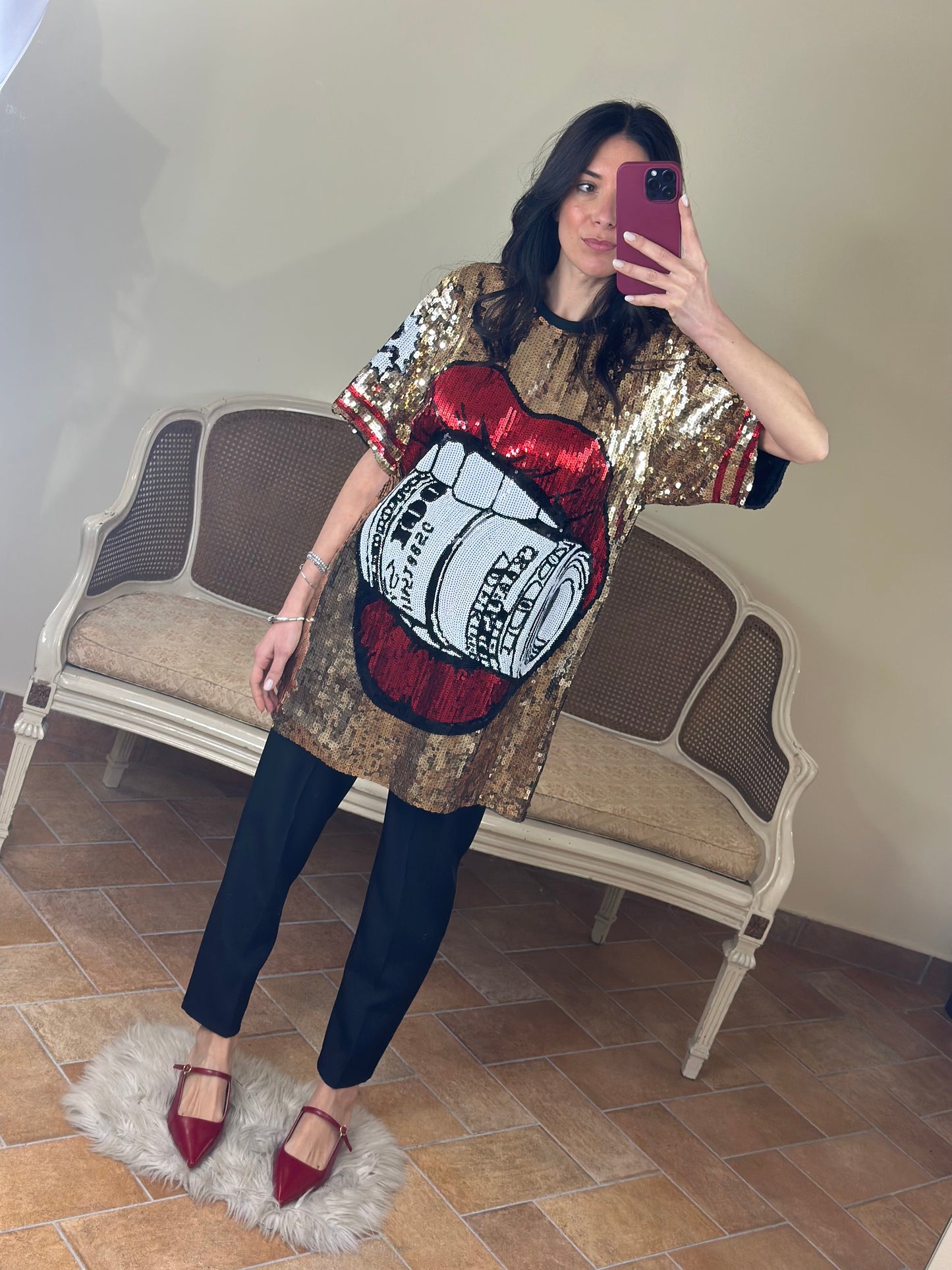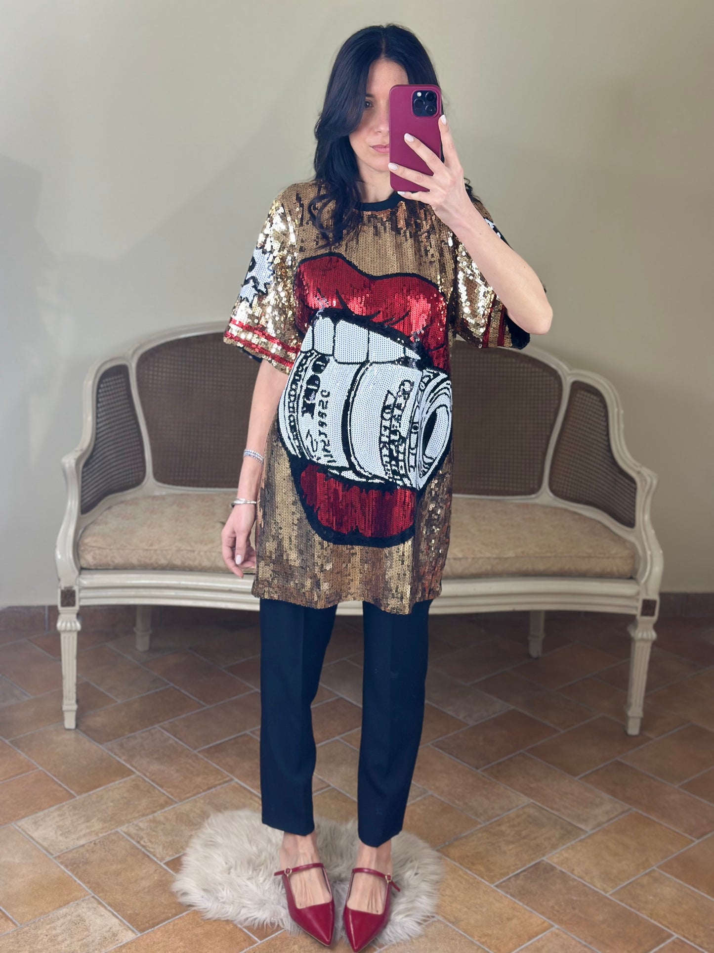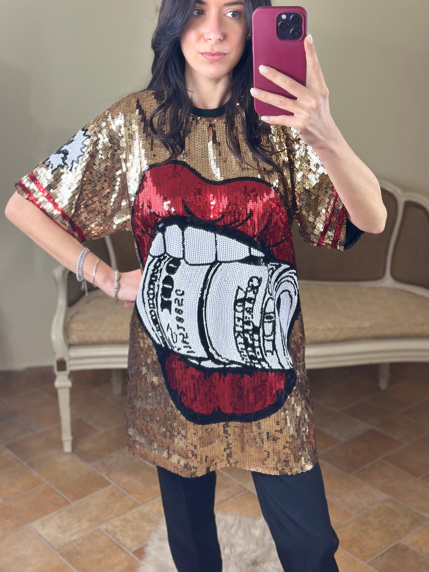 Maxi maglia/abito girocollo a manica corta, ricoperta di paillettes, con immagine "rolling".