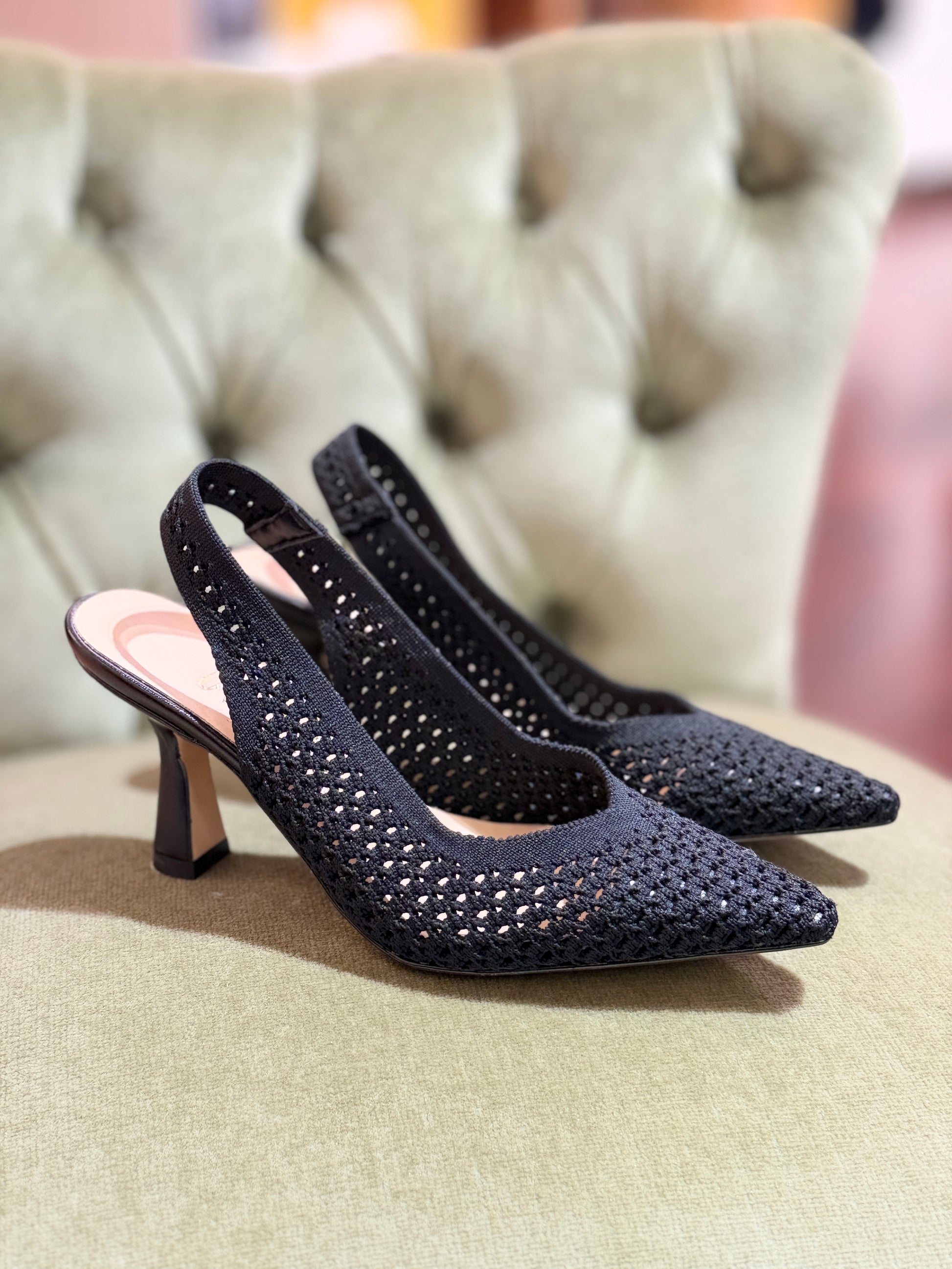 Slingaback in crochet, design a punta con tacco a rocchetto.