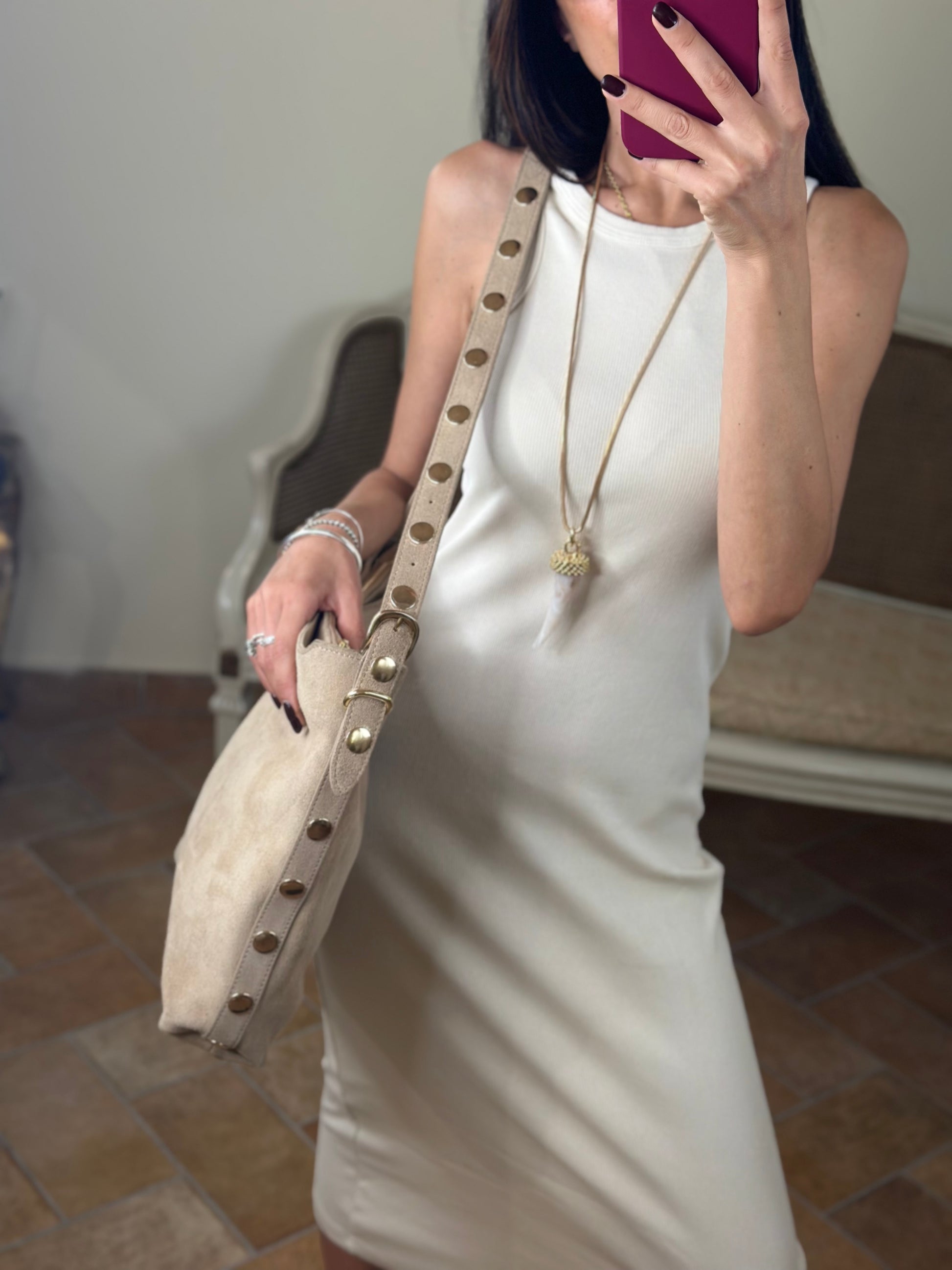 Sacca in suede con tracolla regolabile borchiata oro, zip a chiusura