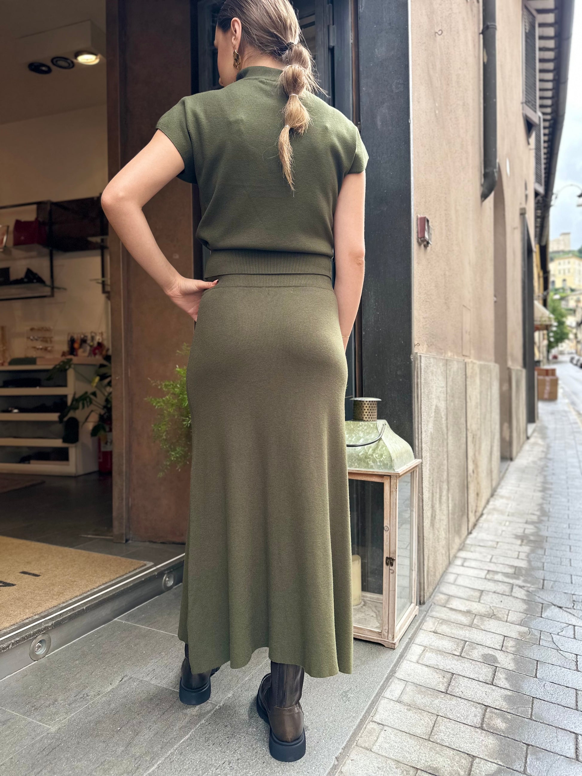Set composto da maglia con collo rialzato e manica ad aletta, gonna lunga svasata con fascia elastica in vita. Tessuti elasticizzati.