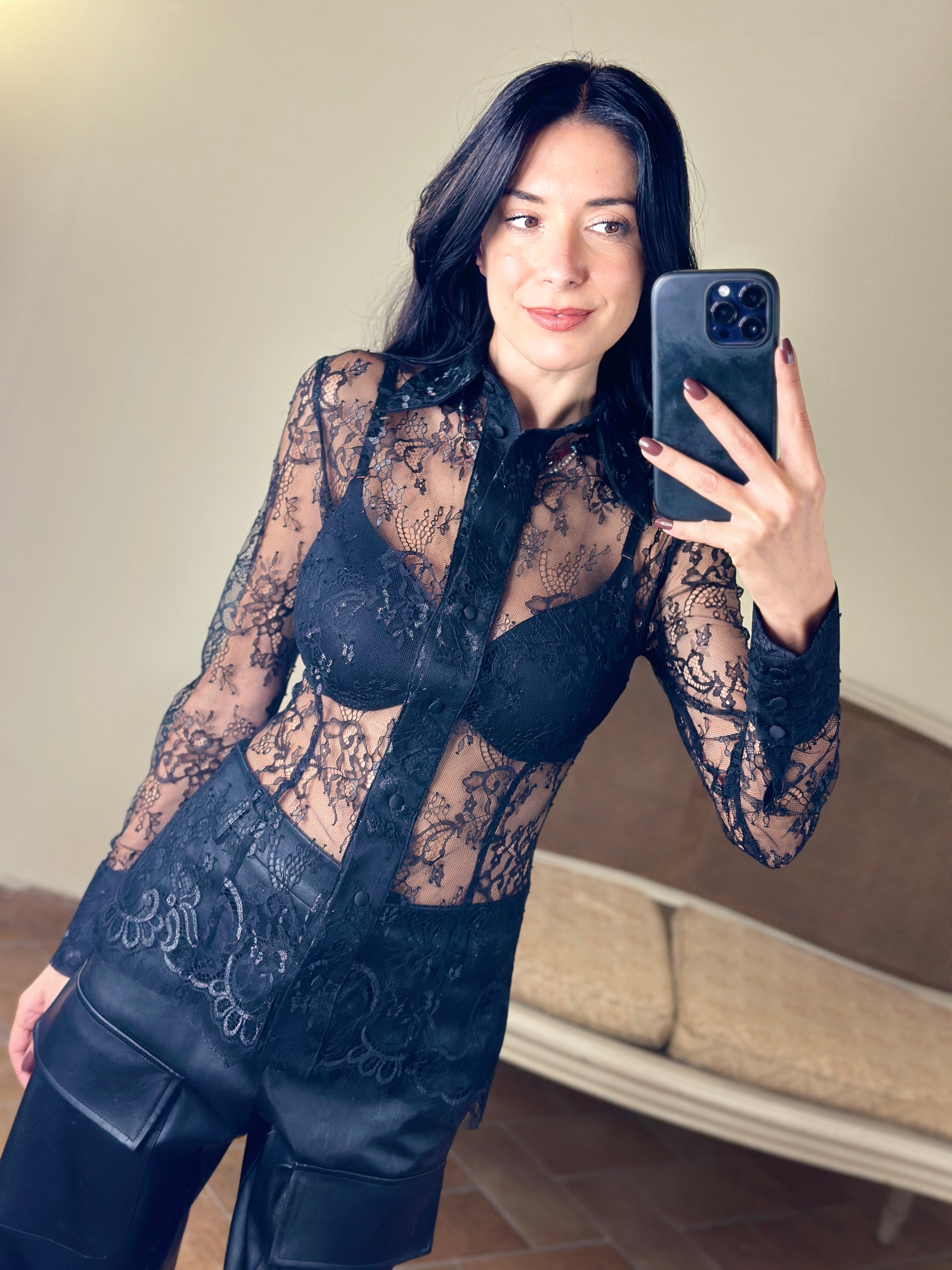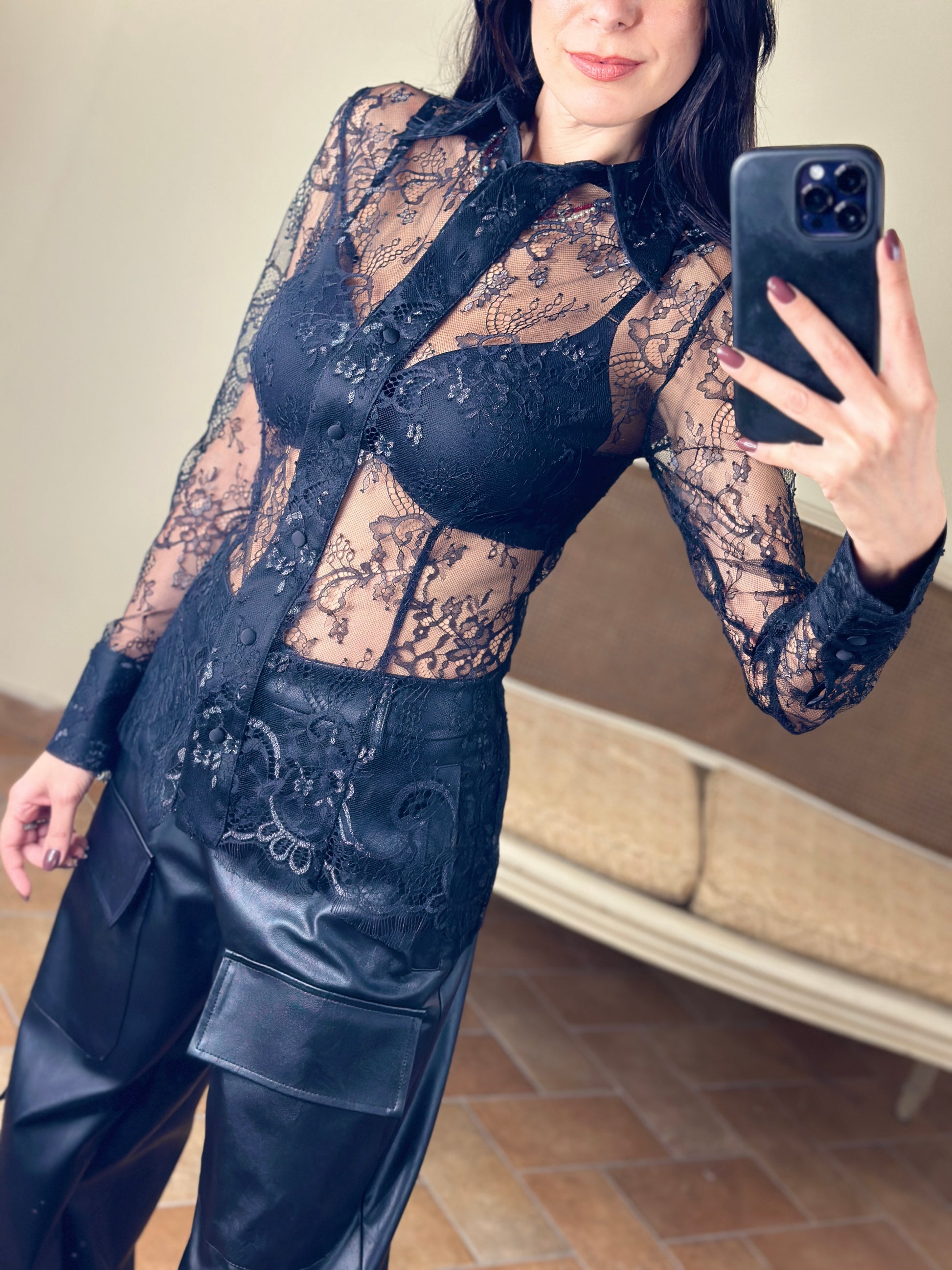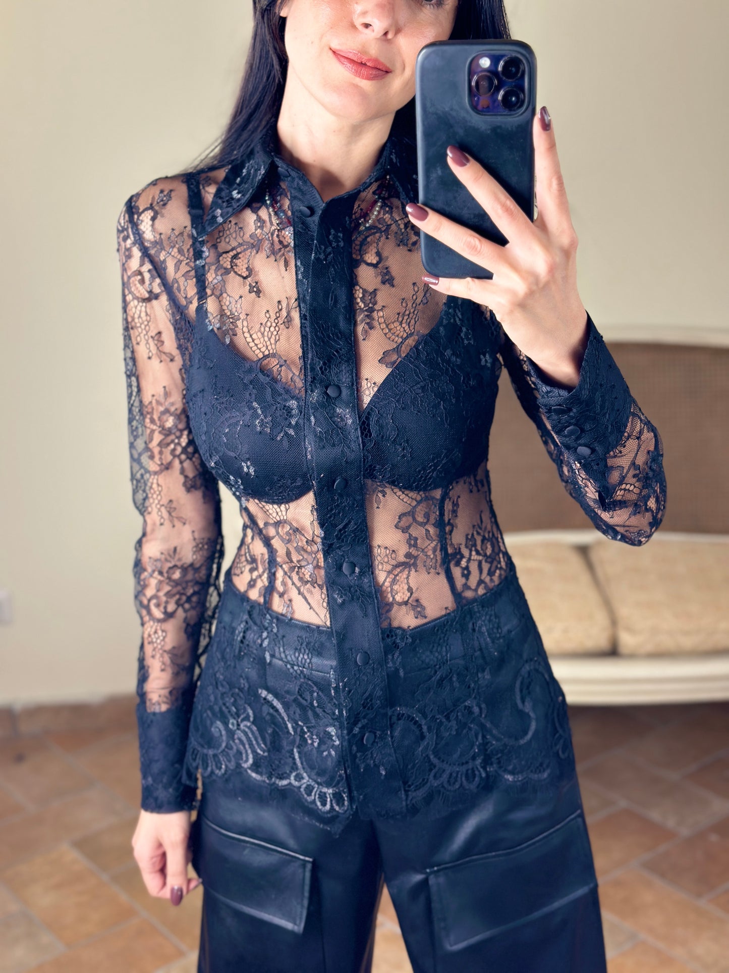 Camicia in pizzo, taglio avvitato, chiusura con bottoncini ricoperti