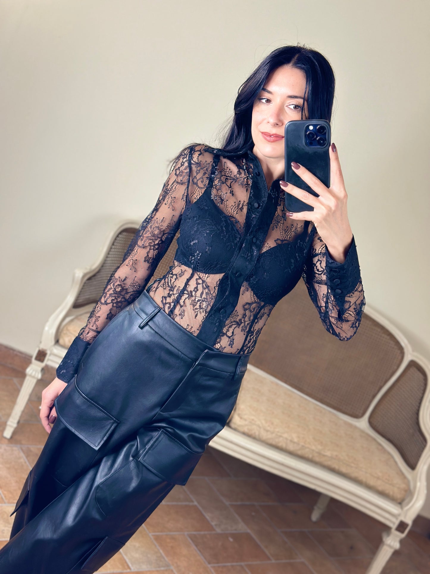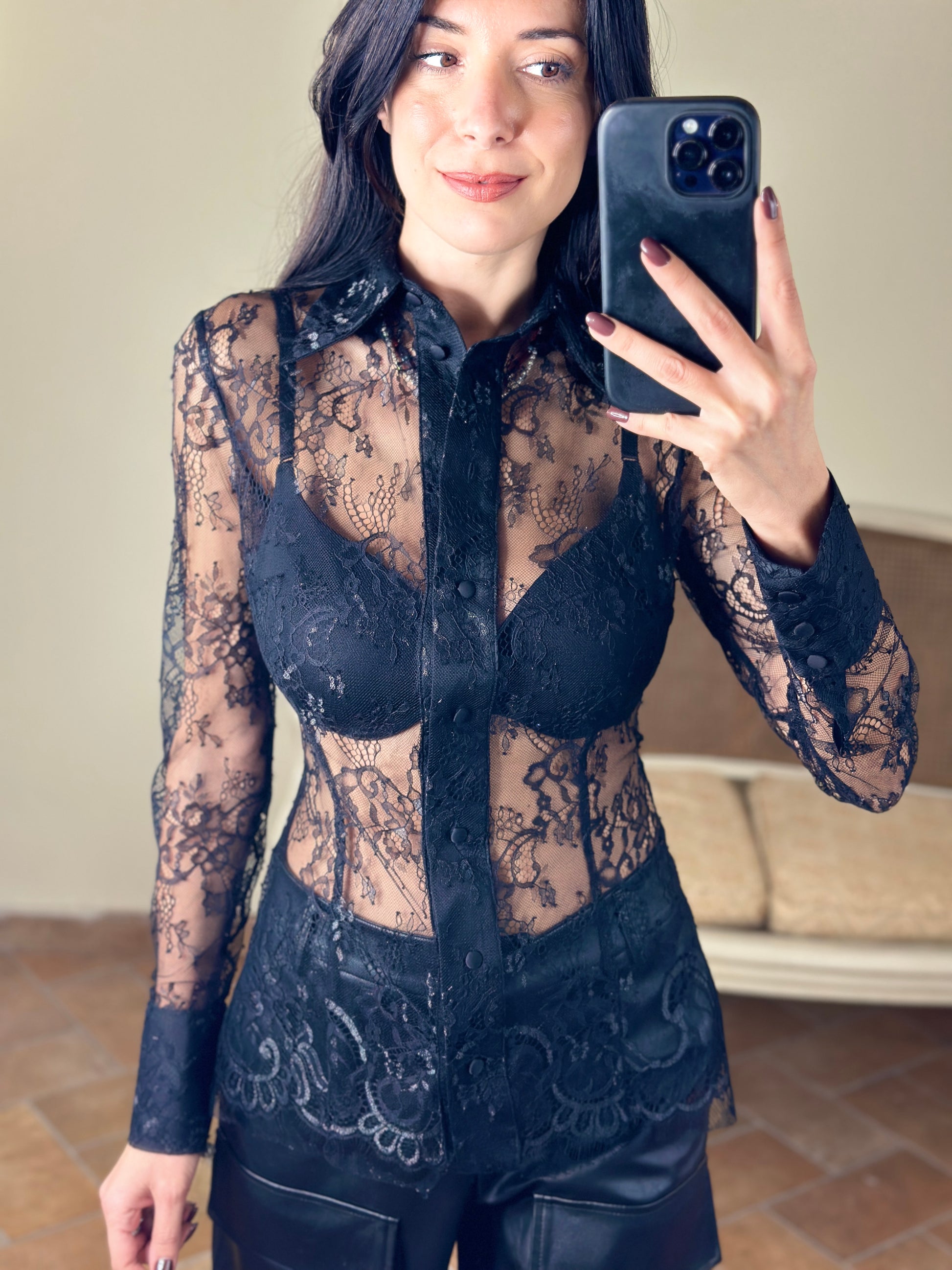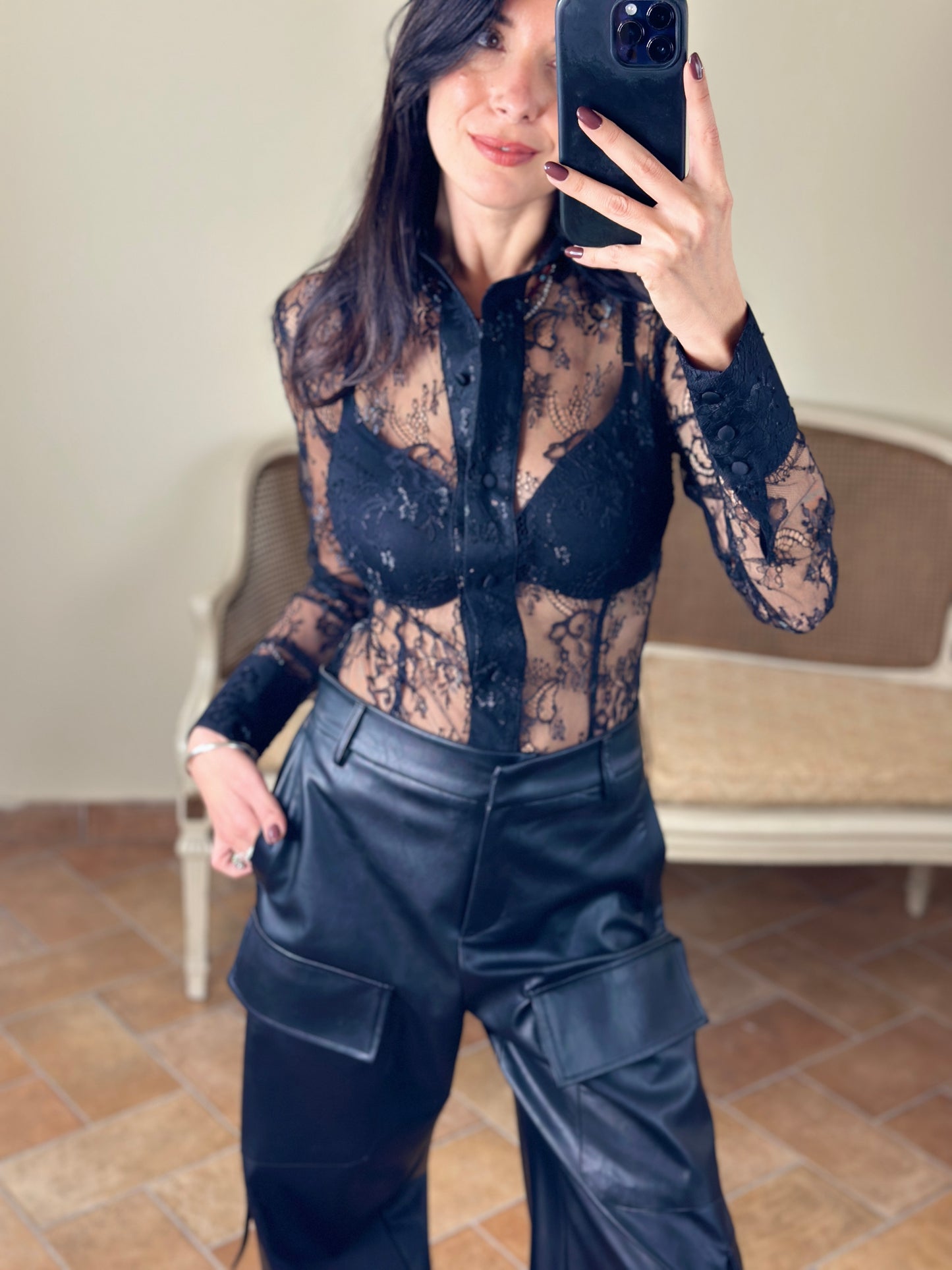 Camicia in pizzo, taglio avvitato, chiusura con bottoncini ricoperti